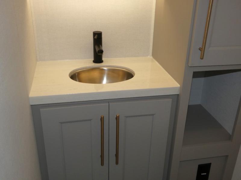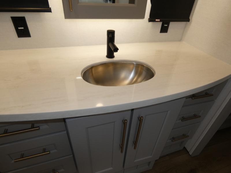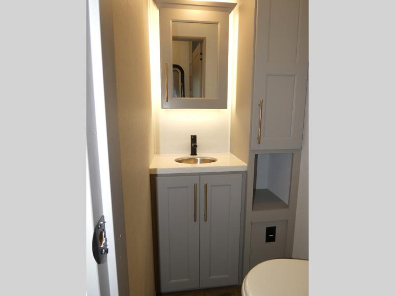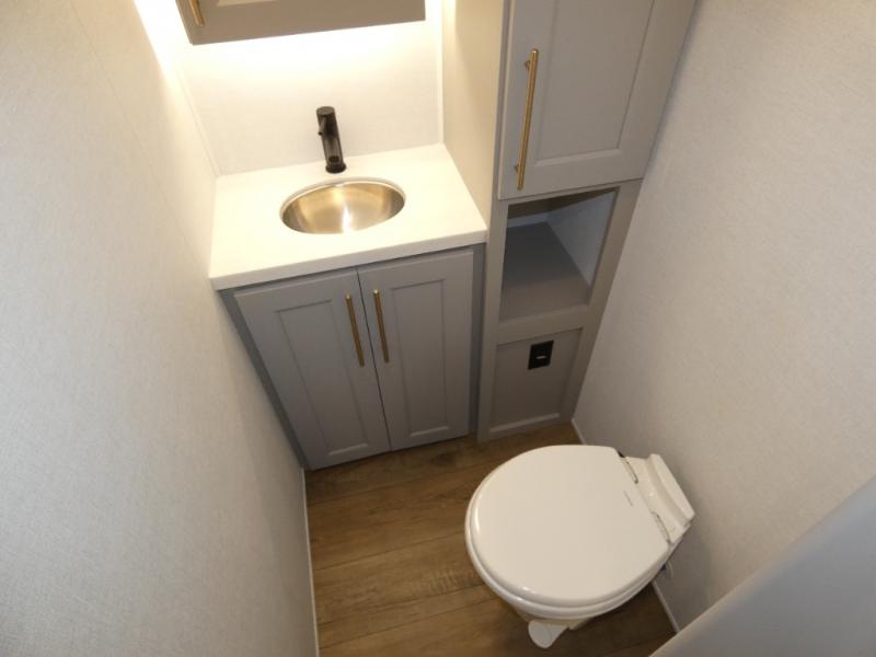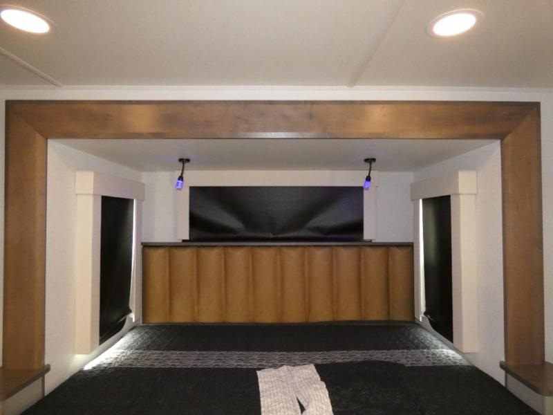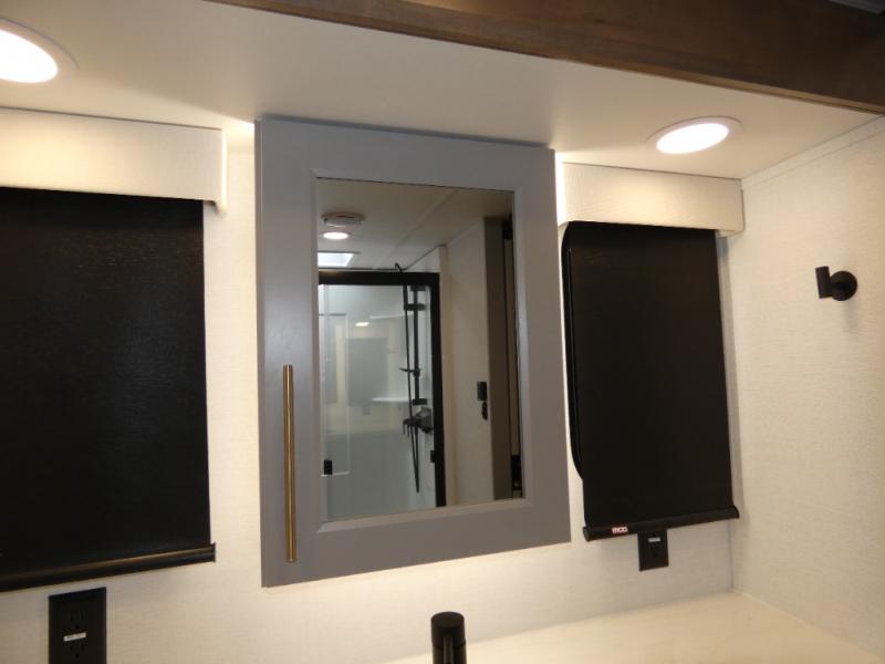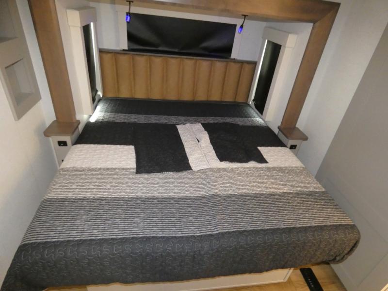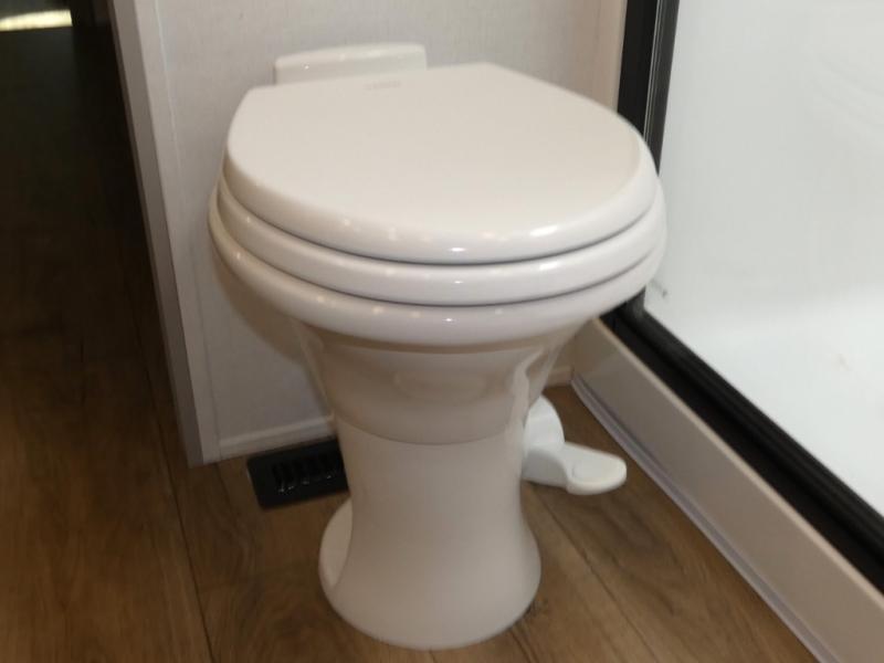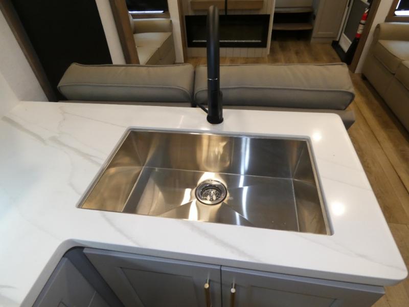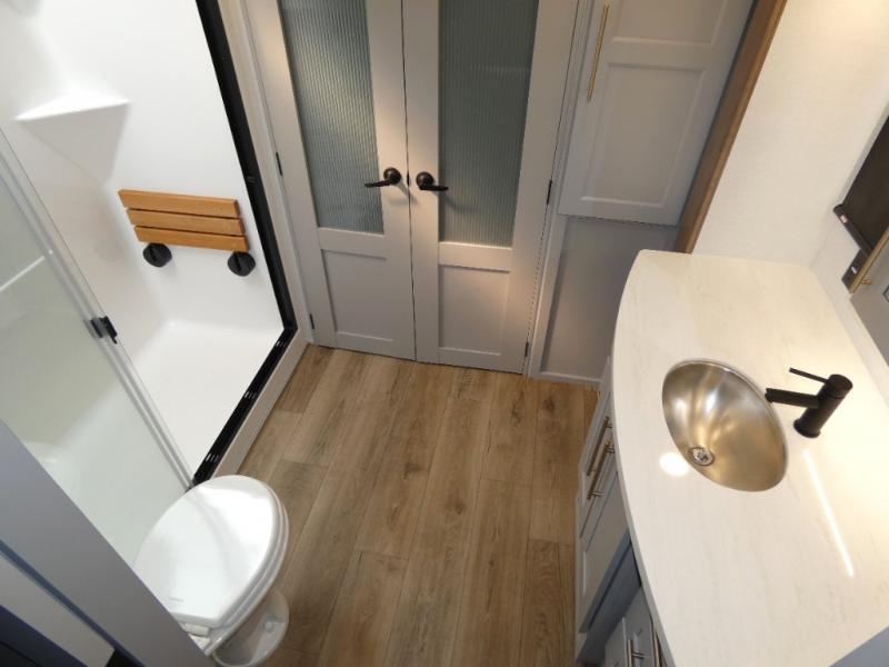 You won't want to camp any other way once you step inside this fifth wheel! the chef will enjoy all of the space in the rear kitchen with ample counter space, a 19 cu. ft. 12 volt residential refrigerator, and a pantry for snacks. Everyone will love to meet in the middle living area that includes dual sleeper sofas and a dual recliner loveseat across from the 50" Smart TV and fireplace. The half bathroom is nearby for quick bathroom breaks too. You will feel right at home in the master suite with a king bed slide to lay your head on at night, a flip top dresser with a Smart TV above it to watch your movies in true comfort, and a seat with storage, plus access to the front full bathroom. Inside the bathroom, you will find a 61" x 30" shower to freshen up in and a walk-in closet with a hamper and shelves.
