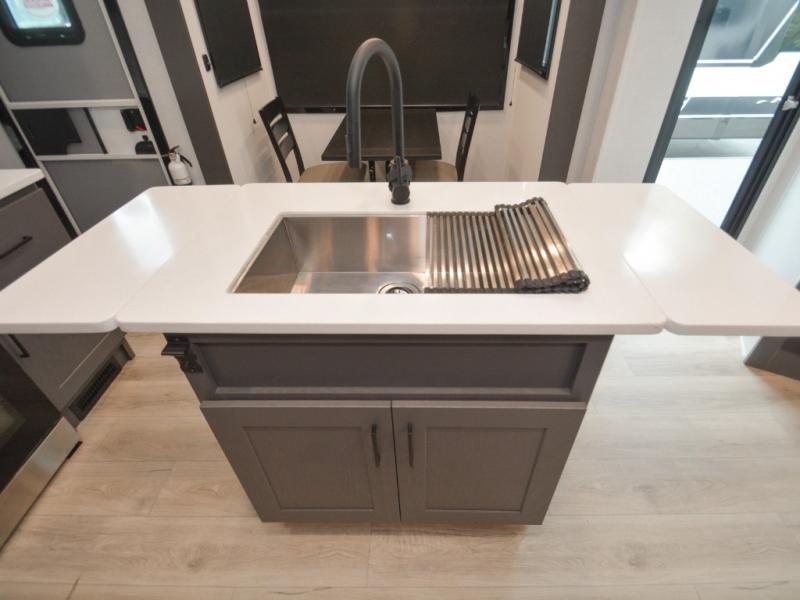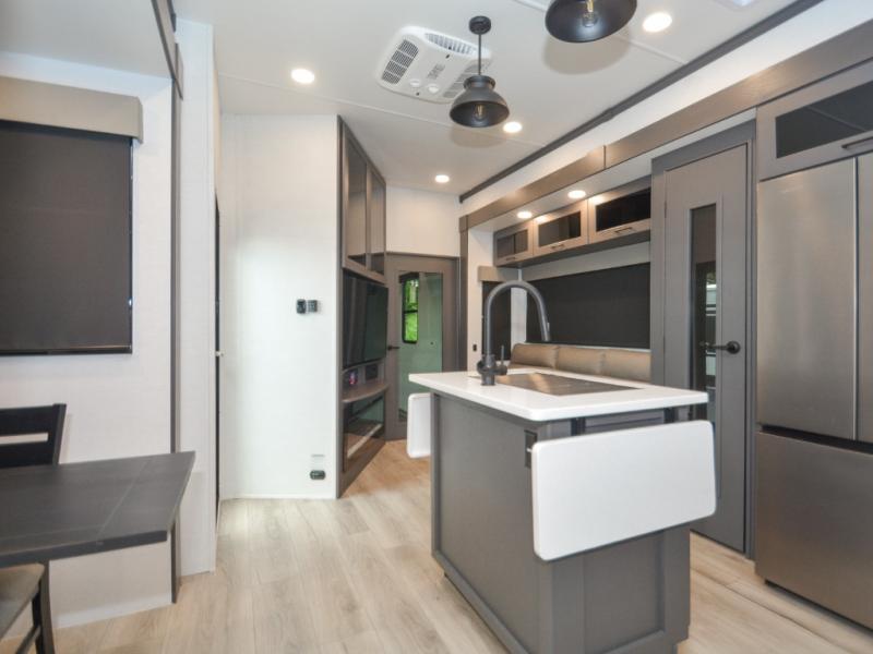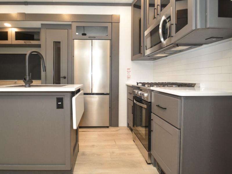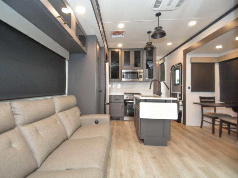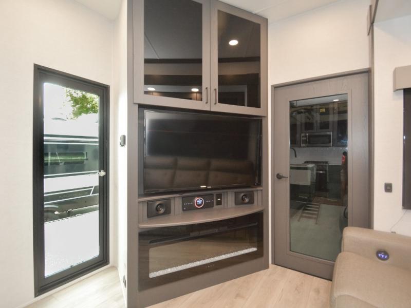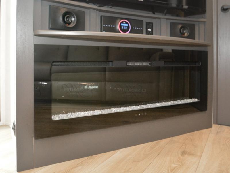 Wake up feeling refreshed after sleeping on the king bed slide inside the front private bedroom and showering in the 48" x 30" shower inside the dual entry bathroom. Now that you're ready for the day, you can head to the kitchen to prepare breakfast on the four burner cooktop then enjoy it at the free standing dinette. The kitchen island with flip-up extensions provides extra space for prep and clean-up. Enjoy your evenings relaxing on the sofa in front of the fireplace while watching your favorite programs on the 50" HDTV.