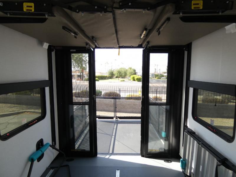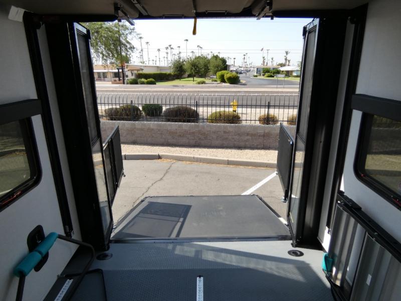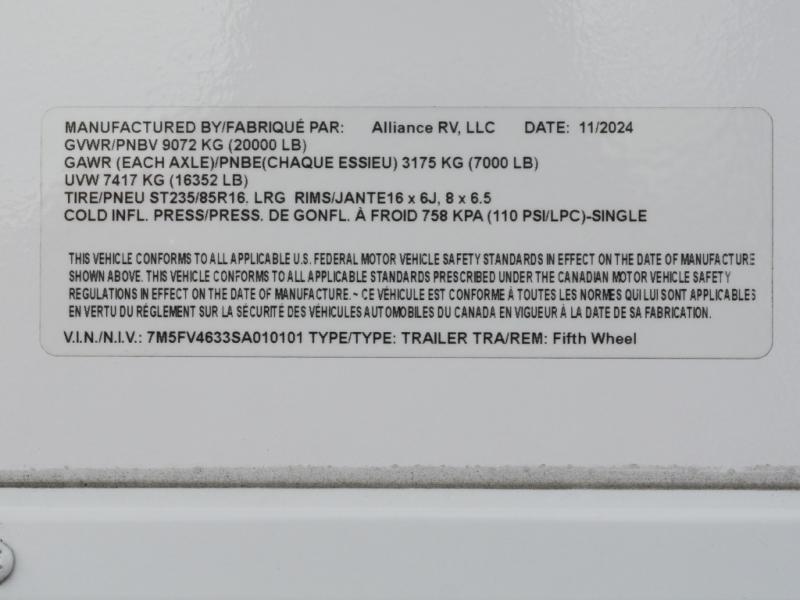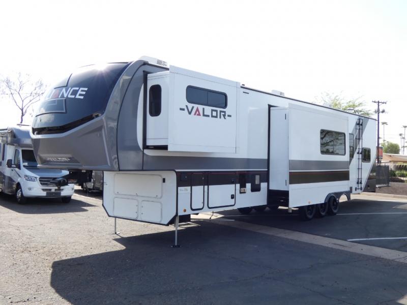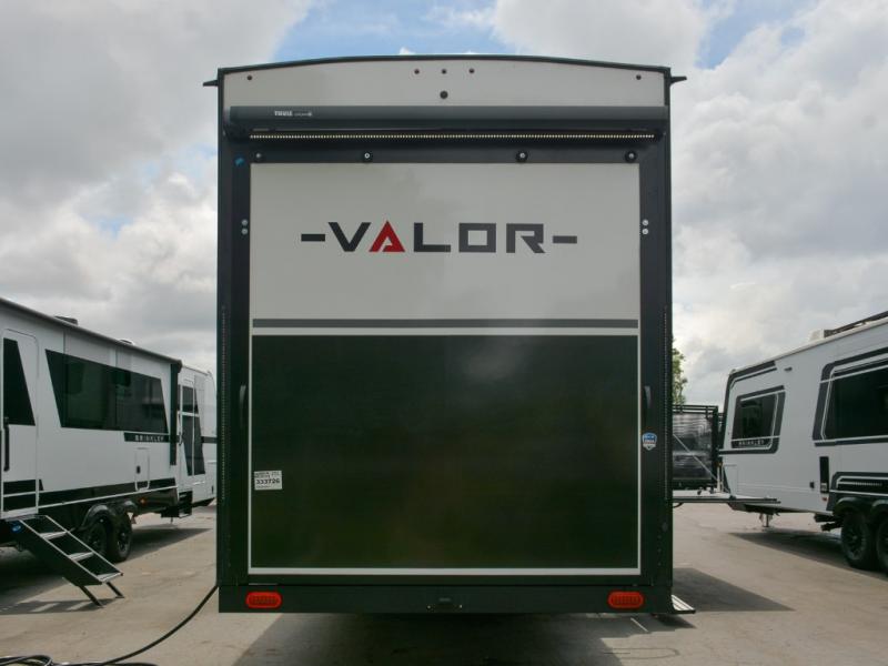 You can bring your toys with you wherever you go with any one of these Alliance RV Valor toy hauler fifth wheels! They are adventure-ready with a quality build from the walk on roof with seamless PVC roof covering to the commercial grade vinyl flooring and MorRyde CRE3000 suspension system. The Performance Running Gear package comes with a 101" wide-body benchmark chassis platform, 7,000 lb. Dexter axles, and a space enhancing drop frame storage compartment to pack in all your riding gear. You can even go off-gridding thanks to the Off the Grid Pack that has two 400 watt solar panels, generator prep, a 40 amp charge controller, and a 100 amp hour lithium iron phosphate battery. Some of the interior comforts you will enjoy are the hardwood cabinet doors and drawers, solid surface kitchen countertops, and commercial grade vinyl flooring with no carpet to make clean up a breeze. The Valor toy haulers are also the Masters of 12 Volt with USB charging station throughout, a stainless steel refrigerator, and more 12 volt features to make camping hassle-free!