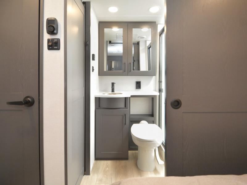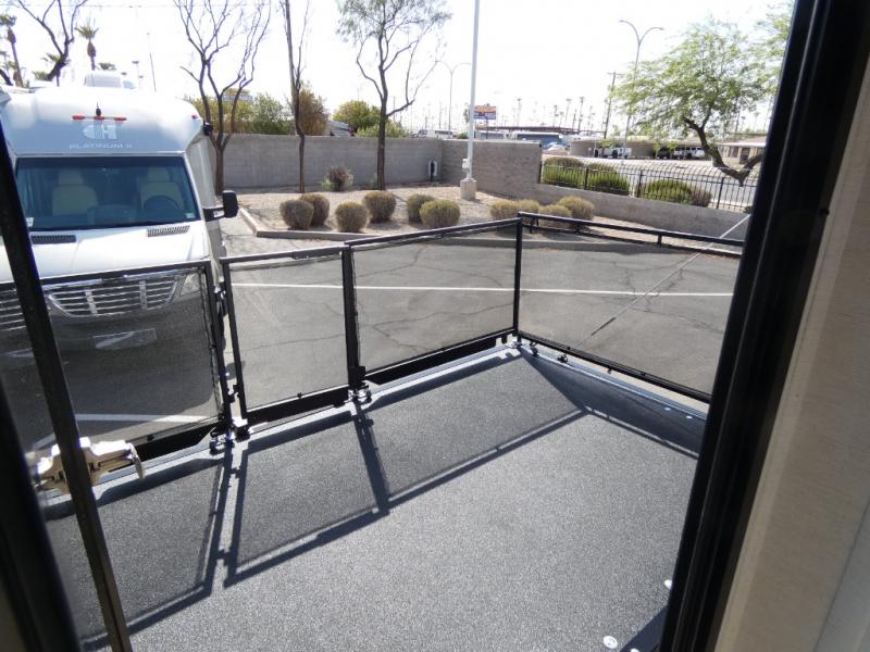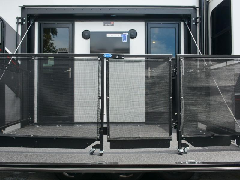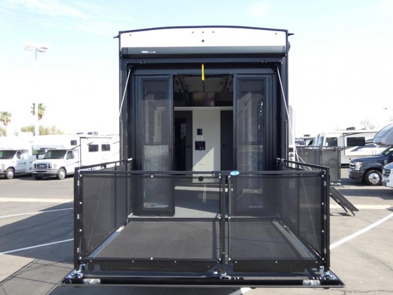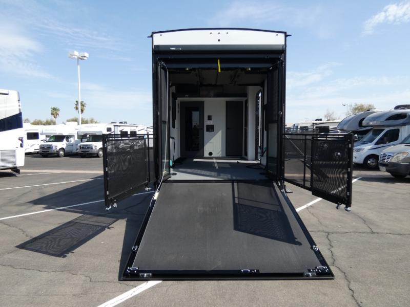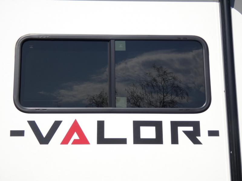 The Valor toy hauler combines comfort and adventure in one impressive package. With a 14' garage with 8' weather resistant ramp door, loading and unloading your toys is simple. The air conditioned garage also includes HappiJac sofas and a drop-down queen bed for extra accommodations plus a loft for added storage. Extend your living space even further to the gated side patio equipped with an exterior TV and JBL speakers. The half bath in the garage provides convenience where it's needed most.