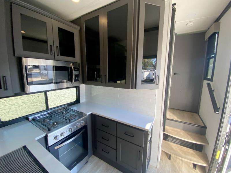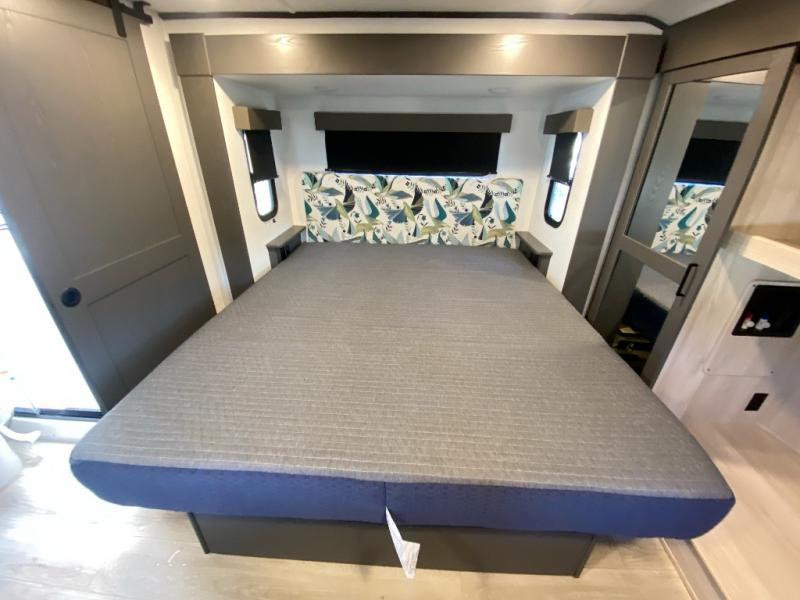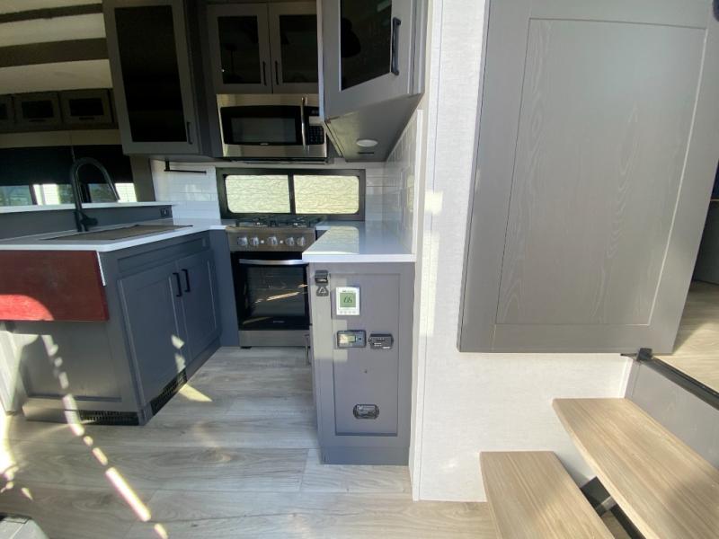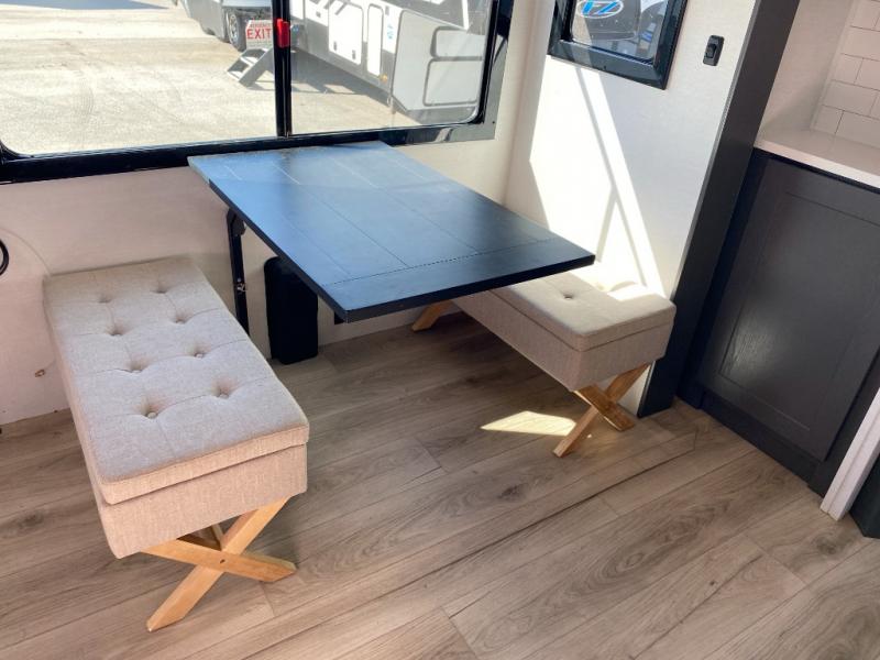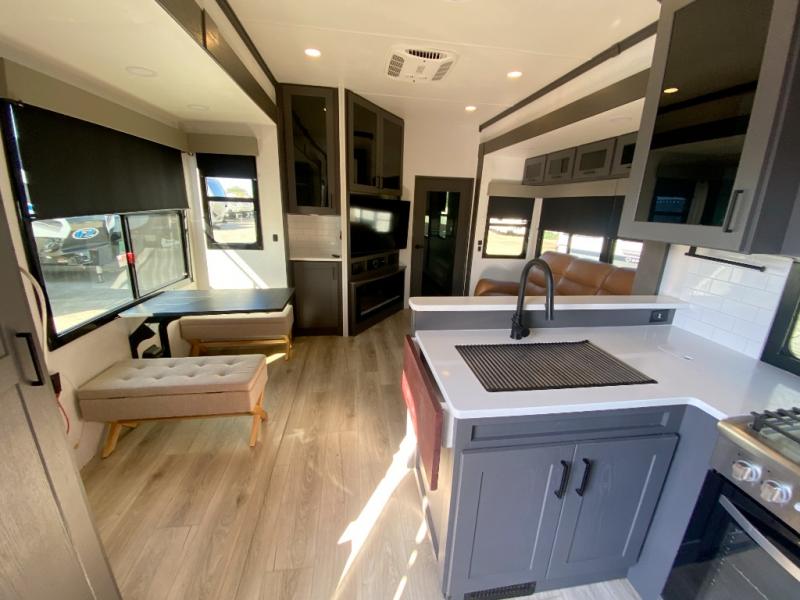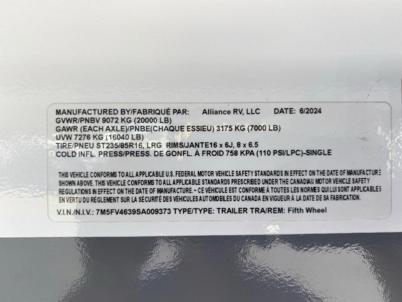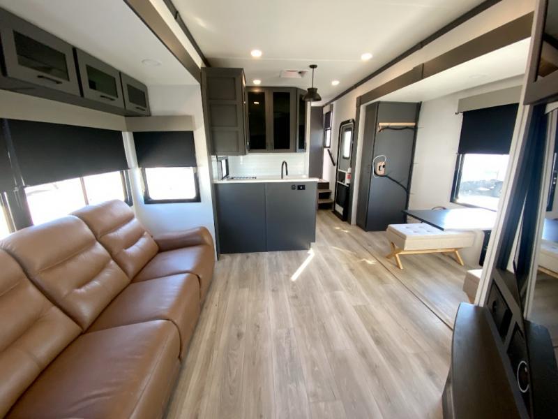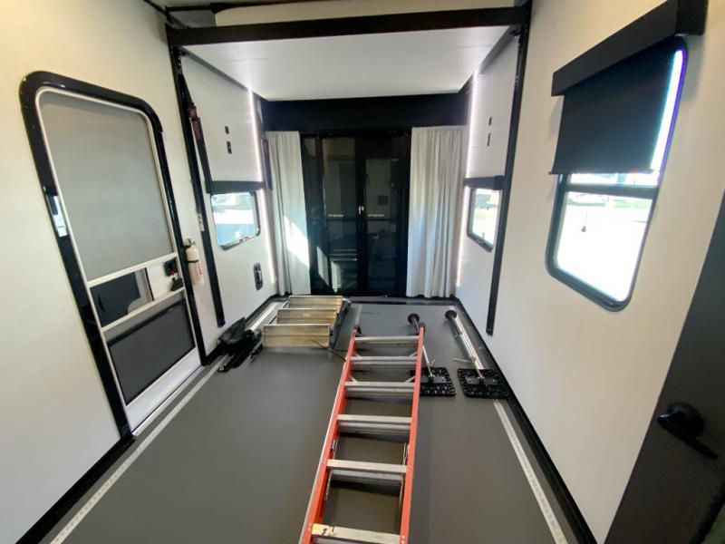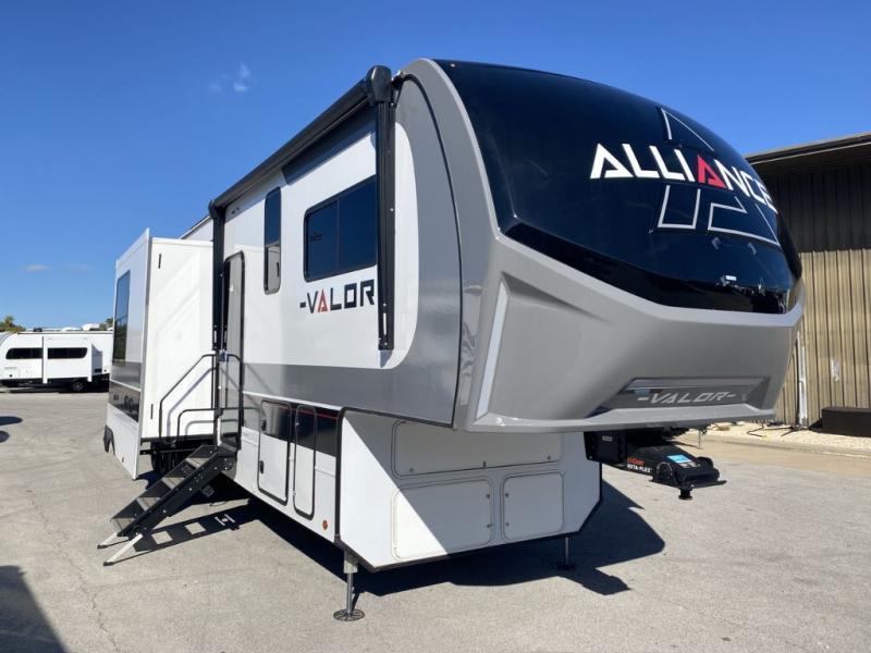 You can bring your toys with you wherever you go with any one of these Alliance RV Valor toy hauler fifth wheels! They are adventure-ready with a quality build from the walk on roof with seamless PVC roof covering to the commercial grade vinyl flooring and MorRyde CRE3000 suspension system. The Performance Running Gear package comes with a 101" wide-body benchmark chassis platform, 7,000 lb. Dexter axles, and a space enhancing drop frame storage compartment to pack in all your riding gear. You can even go off-gridding thanks to the Off the Grid Pack that has two 400 watt solar panels, generator prep, a 40 amp charge controller, and a 100 amp hour lithium iron phosphate battery. Some of the interior comforts you will enjoy are the hardwood cabinet doors and drawers, solid surface kitchen countertops, and commercial grade vinyl flooring with no carpet to make clean up a breeze. The Valor toy haulers are also the Master of 12 Volt with USB charging station throughout, a stainless steel refrigerator, and more 12 volt features to make camping hassle-free!
