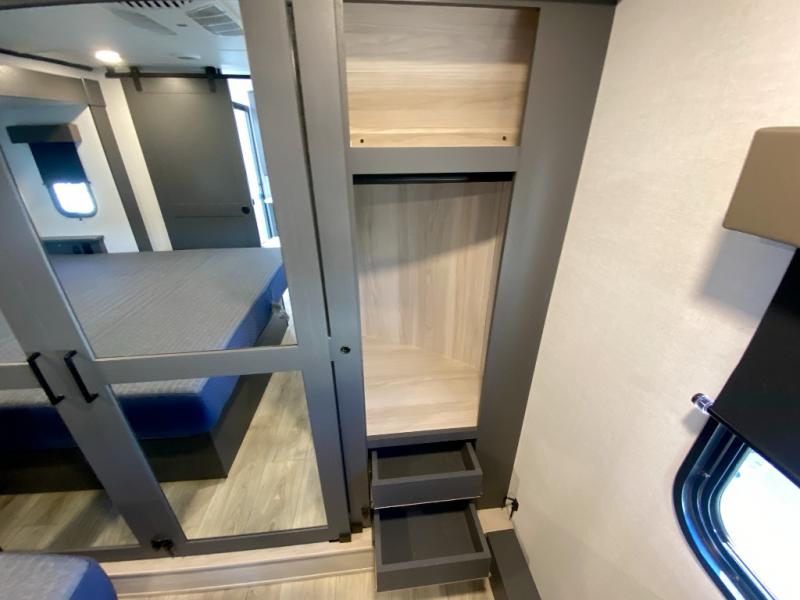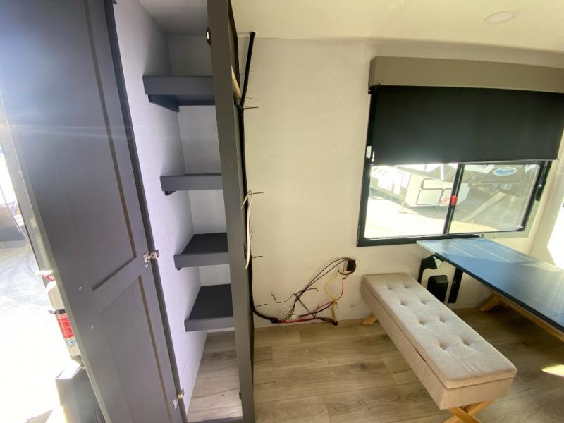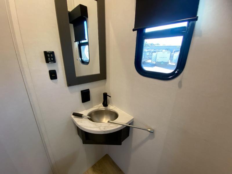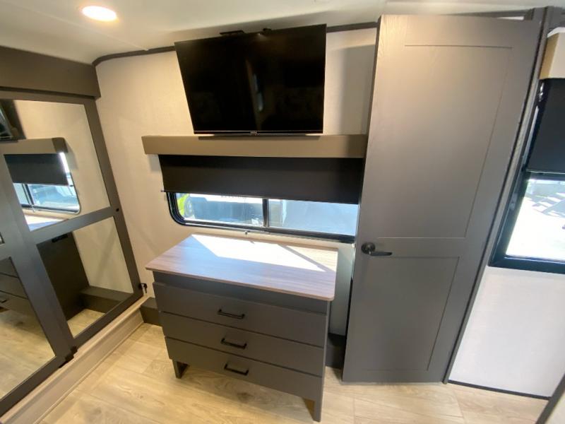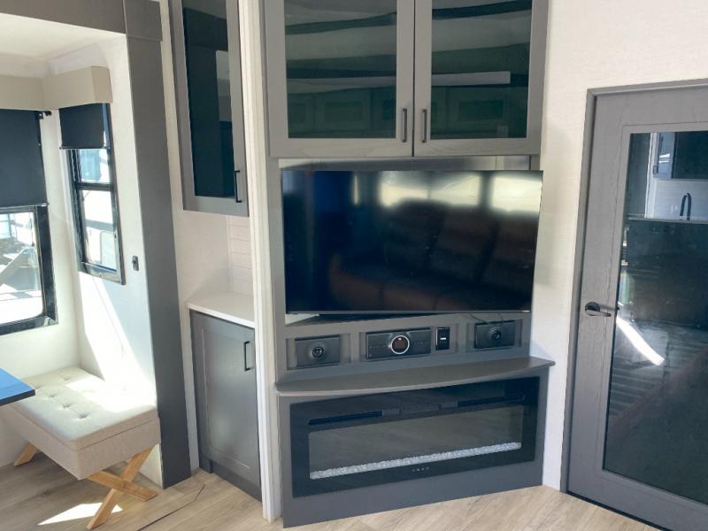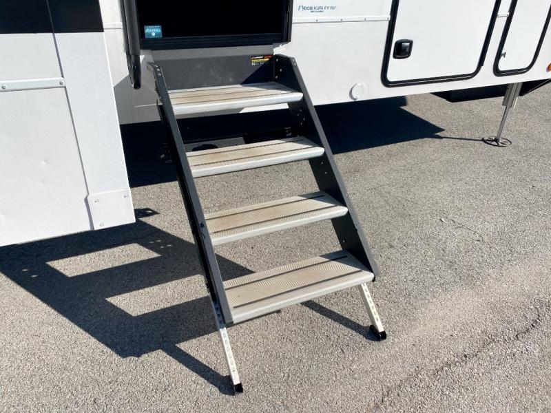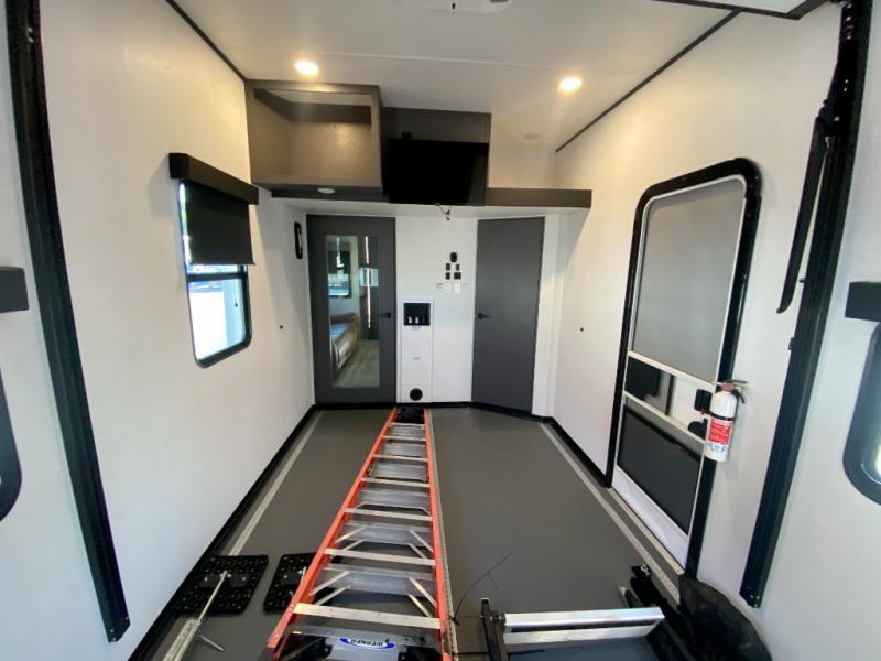 The whole gang will love camping in this toy hauler with a 14' garage for your toys and gear. Once you have arrived at your destination, you can set up the HappiJac roll-over sofas with a queen bed above them, and also a loft which opens to the garage area as well. A half bath is also available off the garage which is an added convenience for those sleeping in this converted area, and for those coming in off the trail so that they do not have to track all through the main unit to use the bathroom. The chef can prepare great meals for their hungry crew with the fully equipped kitchen including a four burner cooktop, a stainless steel 12V refrigerator, large sink, and plenty of countertop prep space. The rest of the gang can be relaxing on the large L-shaped sofa slide watching the 50" HDTV and enjoying the fireplace, or playing a game of cards at the dining table with four chairs. The front private bedroom features a king bed slide for more interior space, a flip top dresser for all of your belongings, and a front wardrobe with washer and dryer prep, plus it has an entrance into the dual entry bathroom!