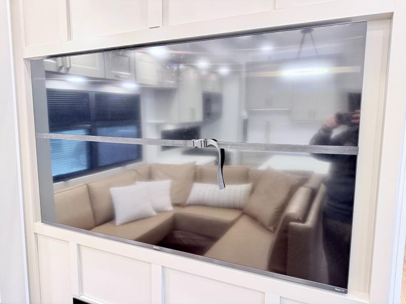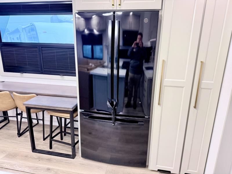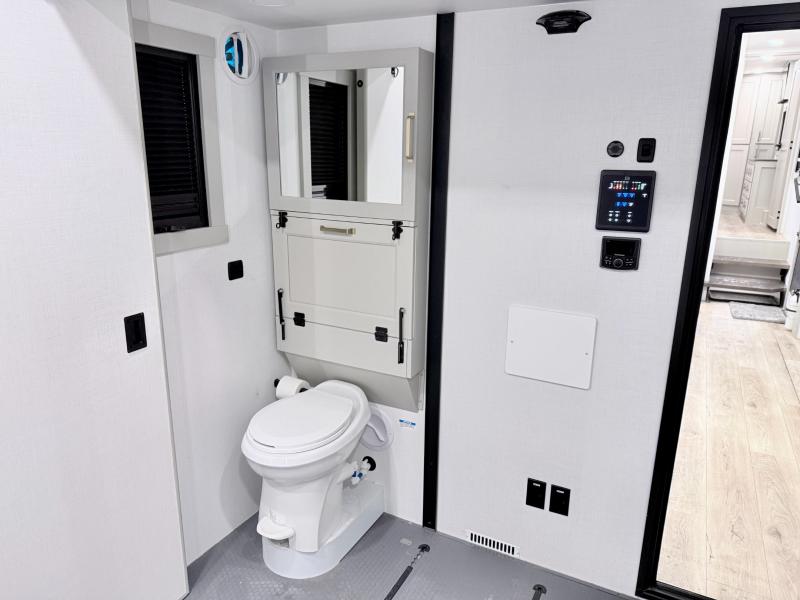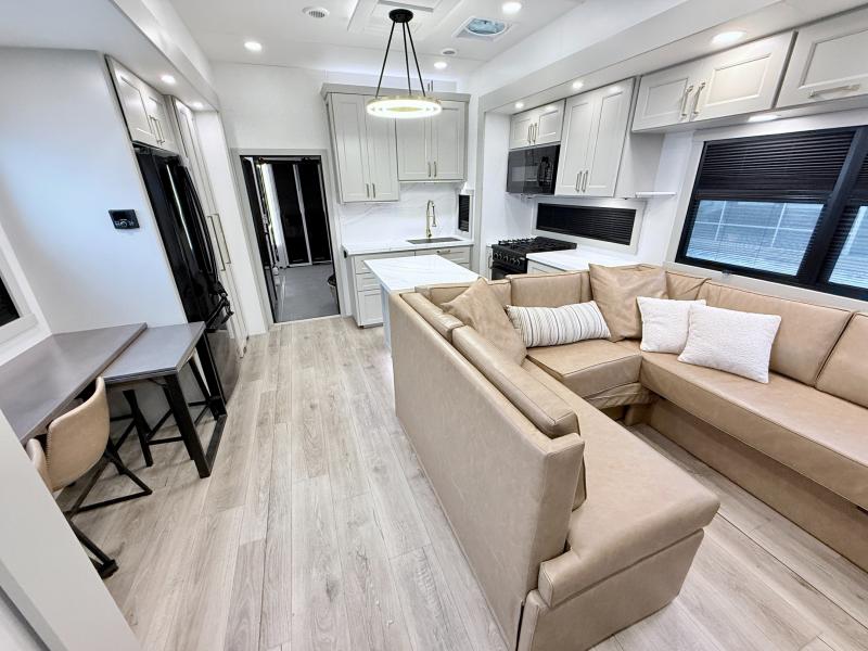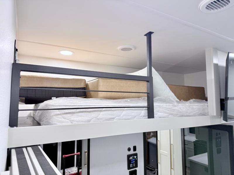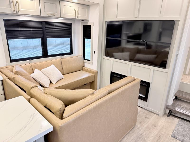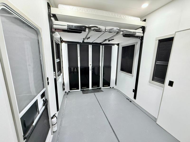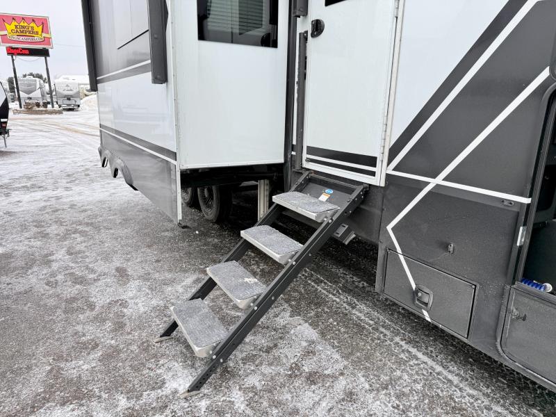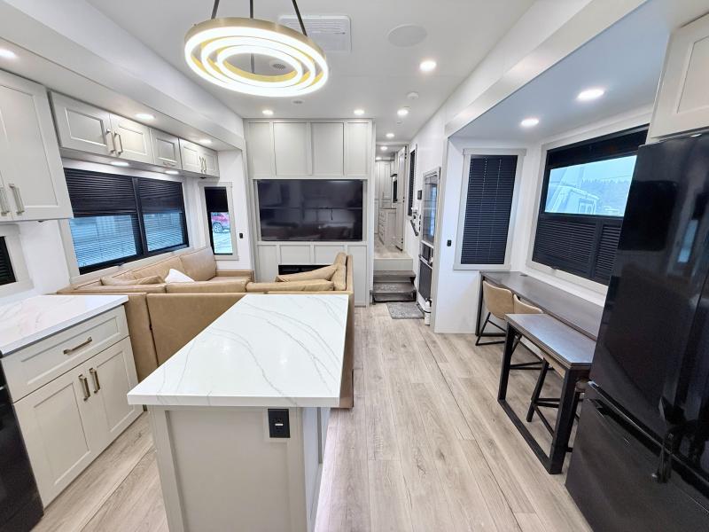 This toy hauler may just be the one you've been looking for! The garage/flex space with fold-away half bath walls will allow you to utilize the garage how you need it, plus there is an adjustable tie-down system, independent dual sofas, plus a loft for storage and a twin bed to sleep more campers! The garage patio with a 1,500 lb. capacity is another feature you are sure to love, especially with its own awning to keep you protected from the elements. Head to the kitchen to prepare meals with a 24" GE oven with a four burner range, a GE microwave with an air fryer, plus a spacious GE Energy Star 19 cu. ft. refrigerator. The island with two stools will let others visit with you while you cook, and there are even hidden dog bowls. You'll find the convertible dining table/L-desk will be accommodating since it can be use to dine at, and to get some work done. You may just find yourselves spending most of your time on the L-sofa in front of the TV and fireplace. A full bath is up front by the bedroom, and here you'll find neon shower lighting, a residential shower system, and pull-out linen storage to keep towels ready to use. After a day outdoors you'll love nothing more than coming back to your own bedroom with a king bed slide out, TV, a walk-in closet, and many more storage spaces. And we haven't even touched on the exterior features, like the 3-way pass-through storage, three power awnings, an air compressor to fill up tires, and the list goes on and on!