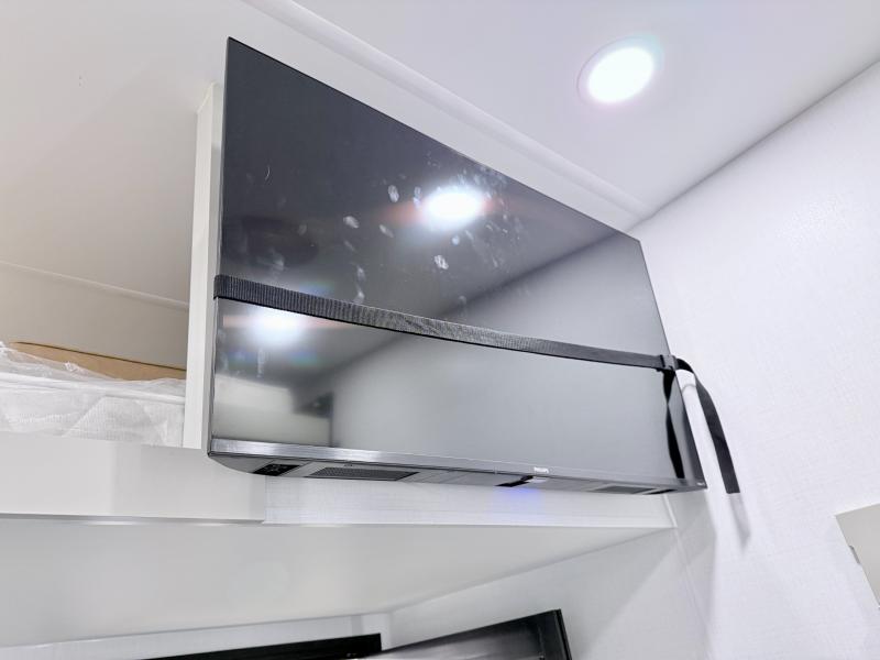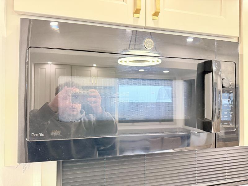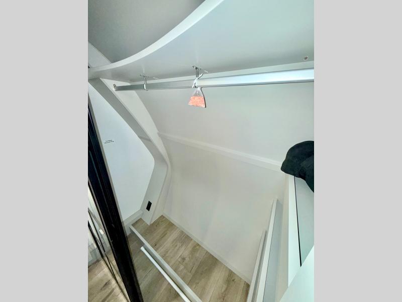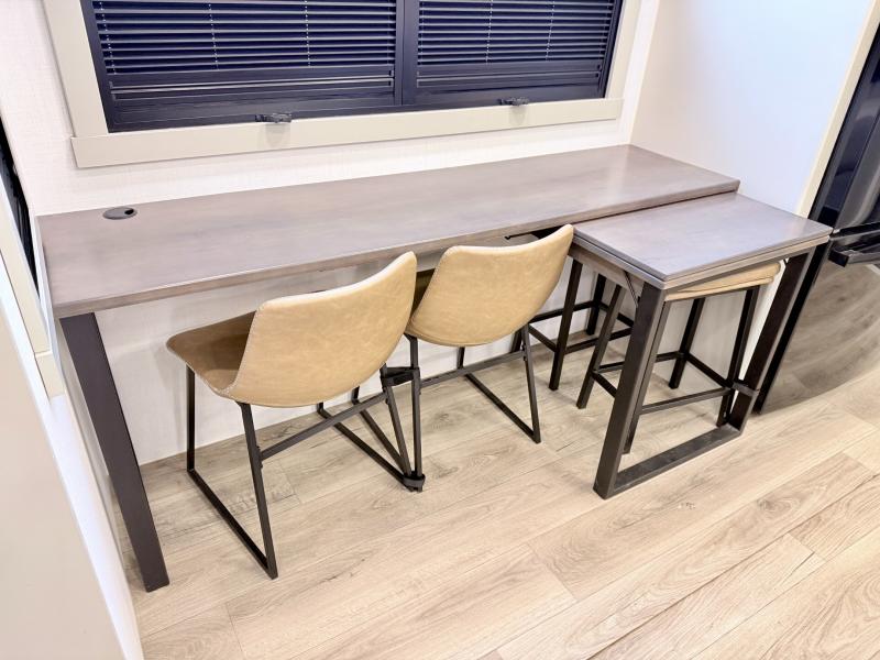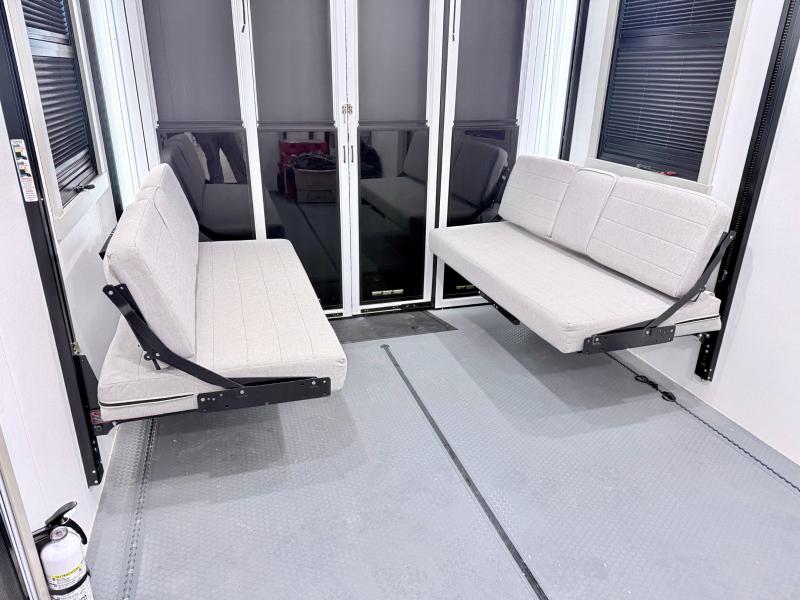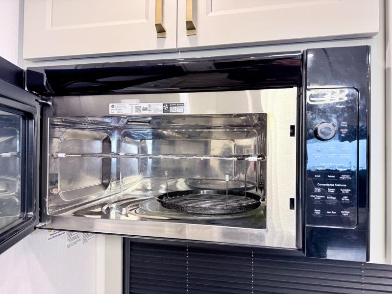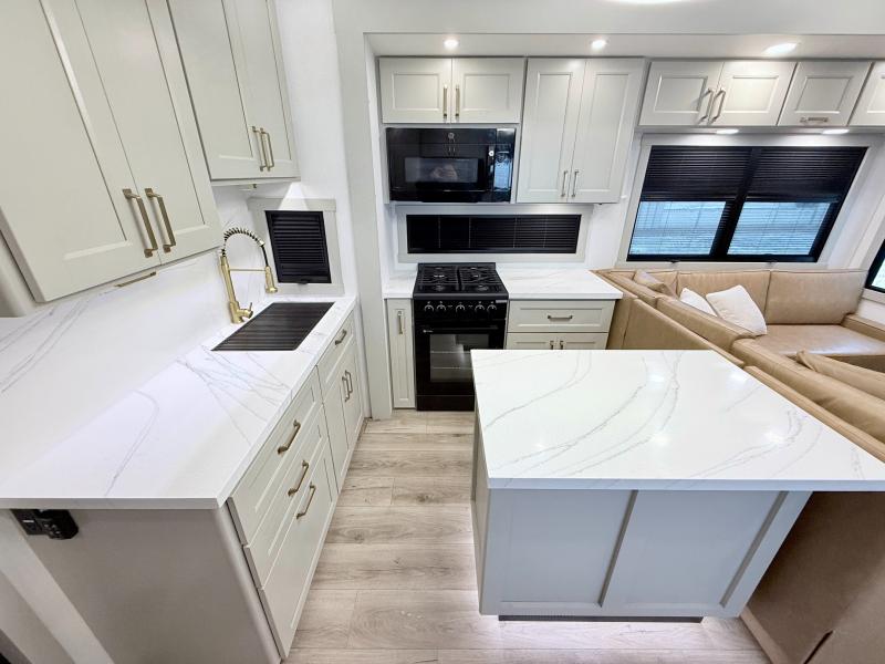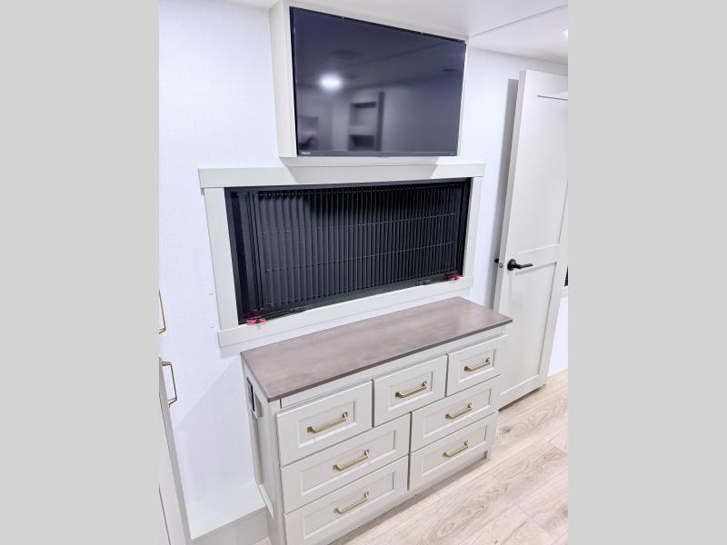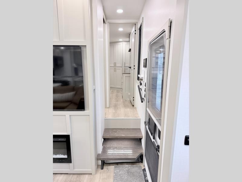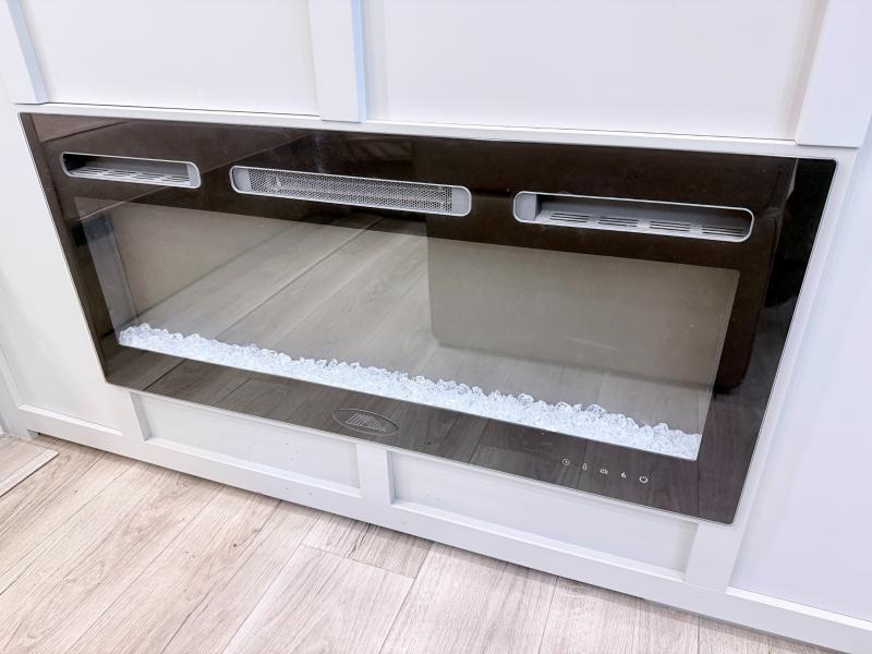 This toy hauler may just be the one you've been looking for! The garage/flex space with fold-away half bath walls will allow you to utilize the garage how you need it, plus there is an adjustable tie-down system, independent dual sofas, plus a loft for storage and a twin bed to sleep more campers! The garage patio with a 1,500 lb. capacity is another feature you are sure to love, especially with its own awning to keep you protected from the elements. Head to the kitchen to prepare meals with a 24" GE oven with a four burner range, a GE microwave with an air fryer, plus a spacious GE Energy Star 19 cu. ft. refrigerator. The island with two stools will let others visit with you while you cook, and there are even hidden dog bowls. You'll find the convertible dining table/L-desk will be accommodating since it can be use to dine at, and to get some work done. You may just find yourselves spending most of your time on the L-sofa in front of the TV and fireplace. A full bath is up front by the bedroom, and here you'll find neon shower lighting, a residential shower system, and pull-out linen storage to keep towels ready to use. After a day outdoors you'll love nothing more than coming back to your own bedroom with a king bed slide out, TV, a walk-in closet, and many more storage spaces. And we haven't even touched on the exterior features, like the 3-way pass-through storage, three power awnings, an air compressor to fill up tires, and the list goes on and on!