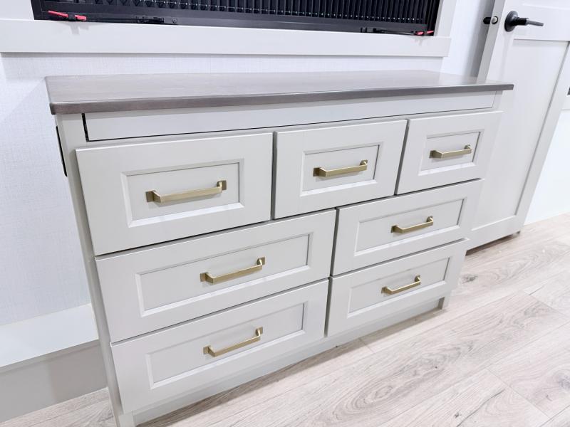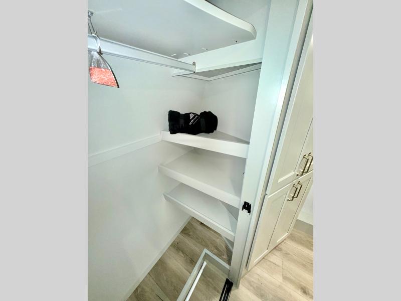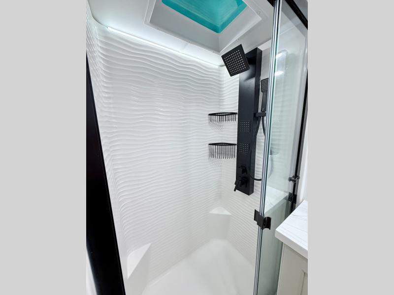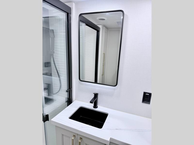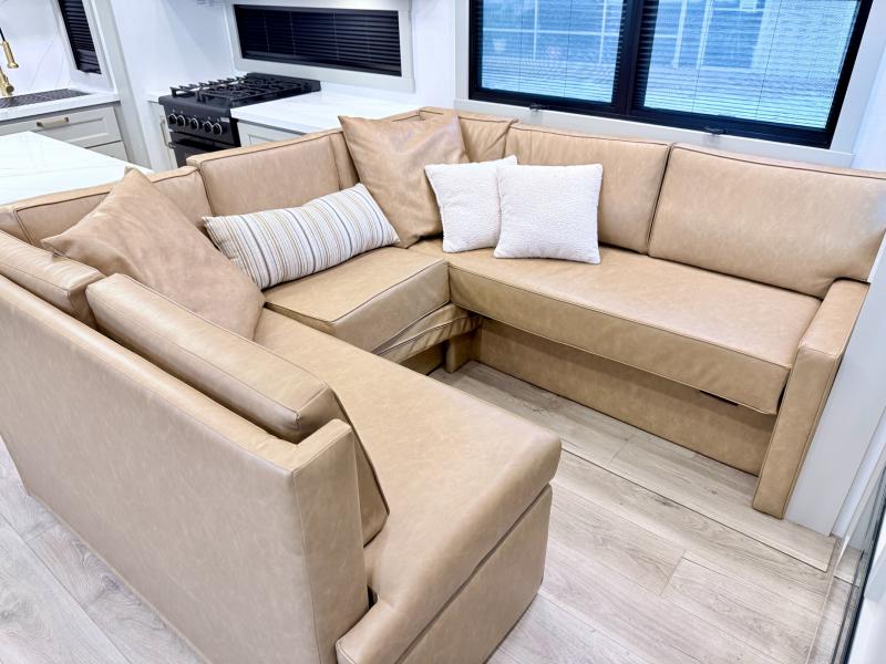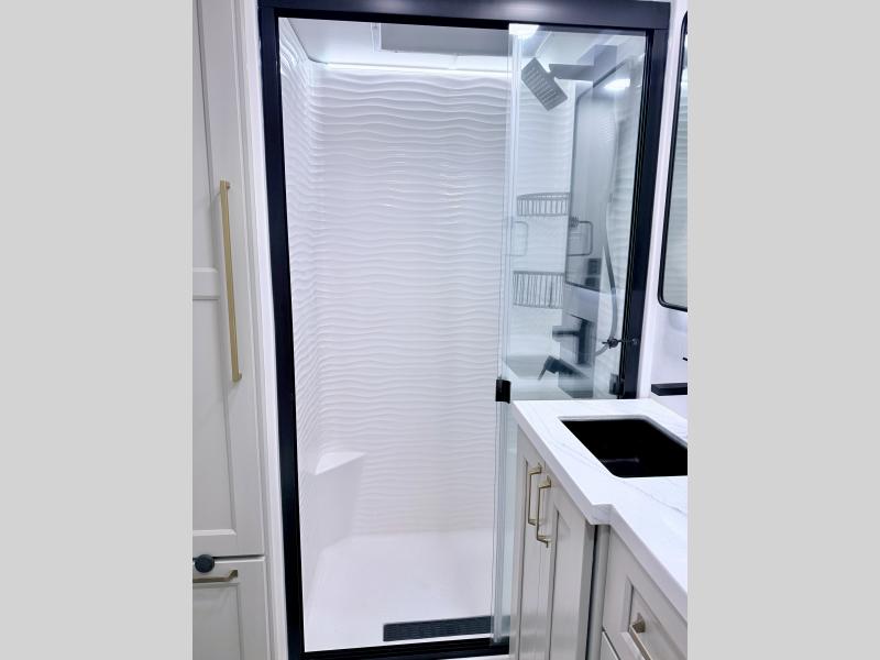 With any Model G toy hauler fifth wheel by Brinkley you will enjoy luxurious amenities, tons of storage space, and innovative features that have been developed and tested in the real world. Durable construction includes an industry leading PDI process, an industry best insulation package, and reinforced and walkable slide roofs. Some of the exterior features you'll find are a 3-way pass-through with a multi-functional flip-up bulkhead wall, under I-beam storage, a MAX-Vision reverse lighting system, and a low-maintenance roof to name a few. A Rockford Fosgate audio system comes standard, along with a OneControl app system that lets you control your fifth wheel's functions right from your mobile device. You will find the solar system with a designated storage area to be ultra convenient, plus there is a FlexPower 5500 with a dual fuel inverter generator for all your power needs. Head inside to find a residential interior with Brinkley's CraftSense wood trim construction, floating entrance steps, integrated window screens and insulated blackout blinds, and residential solid surface countertops plus backsplash. You will also enjoy the neon shower lighting and recessed medicine cabinets in the bath, plus motion activated LED bed lights and dual bedside outlets in the bedroom. Choose a Model G toy hauler fifth wheel to experience all the luxury it has to offer!