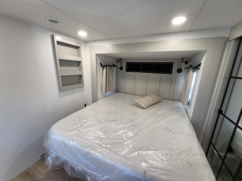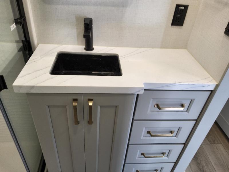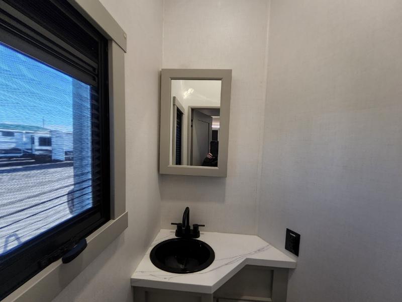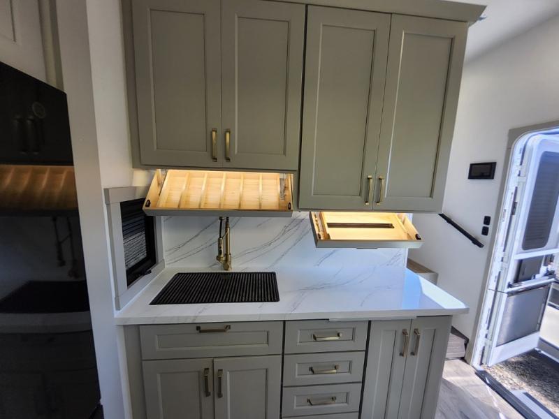 With any Model G toy hauler fifth wheel by Brinkley you will enjoy luxurious amenities, tons of storage space, and innovative features that have been developed and tested in the real world. Durable construction includes an industry leading PDI process, an industry best insulation package, and reinforced and walkable slide roofs. Some of the exterior features you'll find are a 3-way pass-through with a multi-functional flip-up bulkhead wall, under I-beam storage, a MAX-Vision reverse lighting system, and a low-maintenance roof to name a few. A Rockford Fosgate audio system comes standard, along with a OneControl app system that lets you control your fifth wheel's functions right from your mobile device. You will find the solar system with a designated storage area to be ultra convenient, plus there is a FlexPower 5500 with a dual fuel inverter generator for all your power needs. Head inside to find a residential interior with Brinkley's CraftSense wood trim construction, floating entrance steps, integrated window screens and insulated blackout blinds, and residential solid surface countertops plus backsplash. You will also enjoy the neon shower lighting and recessed medicine cabinets in the bath, plus motion activated LED bed lights and dual bedside outlets in the bedroom. Choose a Model G toy hauler fifth wheel to experience all the luxury it has to offer!