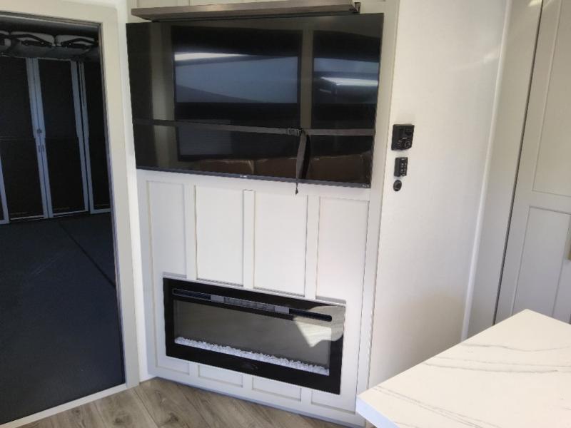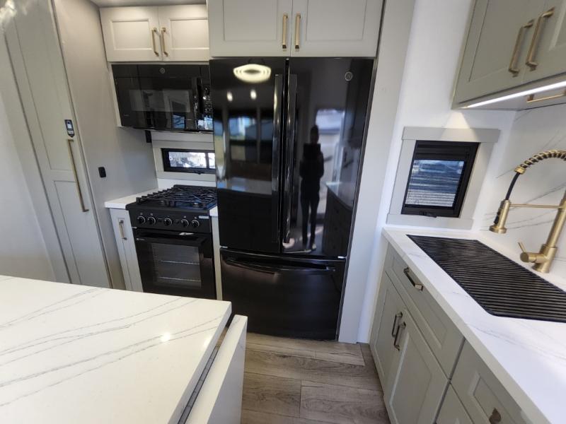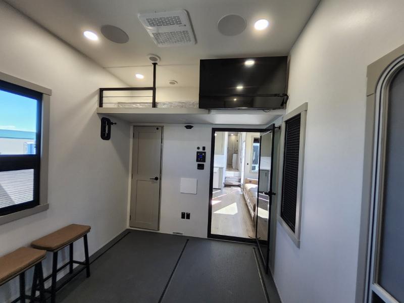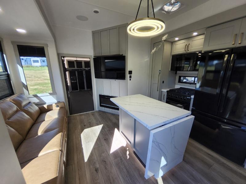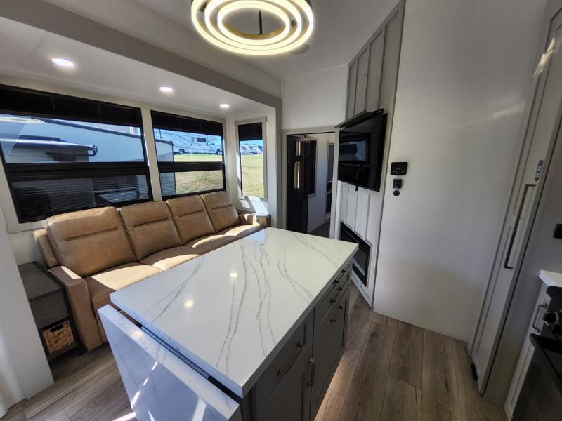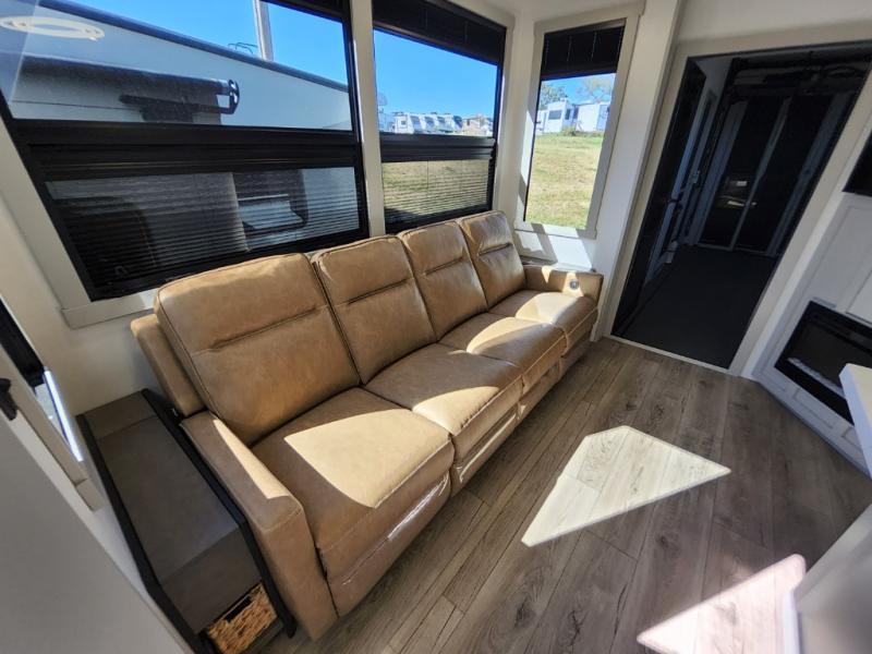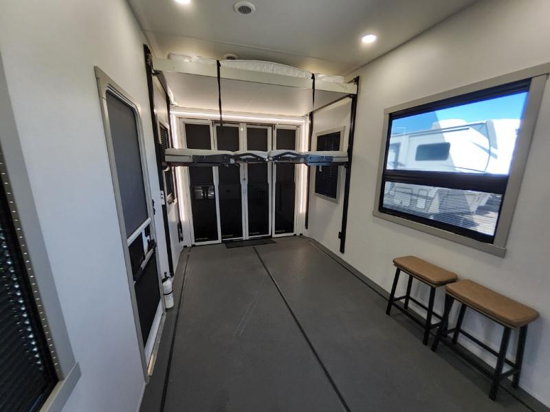 Prepare to be amazed by all the features packed into this toy hauler! There are triple slides that will provide your crew with more space, a 16' separate garage flex area that can sleep five with the loft included, plus a bath and a half for added convenience. The chef in your group will love the middle kitchen with a waterfall island that converts to a counter peninsula, a pull-out pantry, a GE Energy Star 19 cu. ft. refrigerator with ice and filtered water, and much more. In the combined kitchen and living area you'll find a spacious sofa with heat and massage, a fireplace, a TV, plus convenient dog bowls and shoe storage. After your toys are unloaded from the garage, you can relax on the independent dual couches with a Fold-N-Stow table in between. You will find the front private bedroom with a king bed slide out will provide a great night's rest, and you'll also find a walk-in closet, under-bed storage, and a sliding dresser top with hidden storage for special belongings.