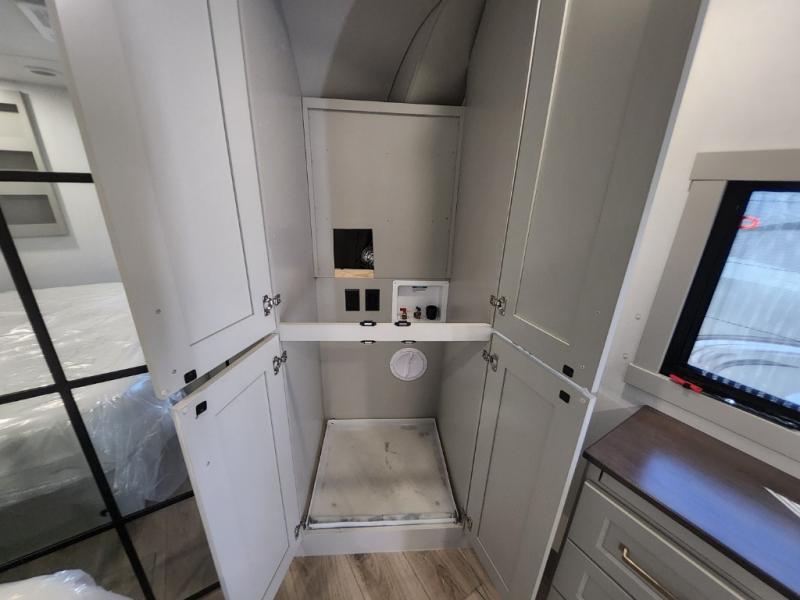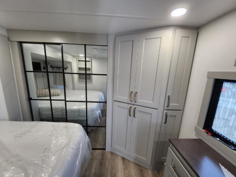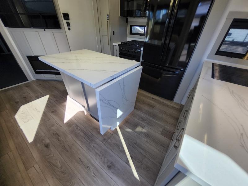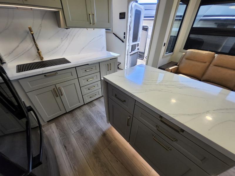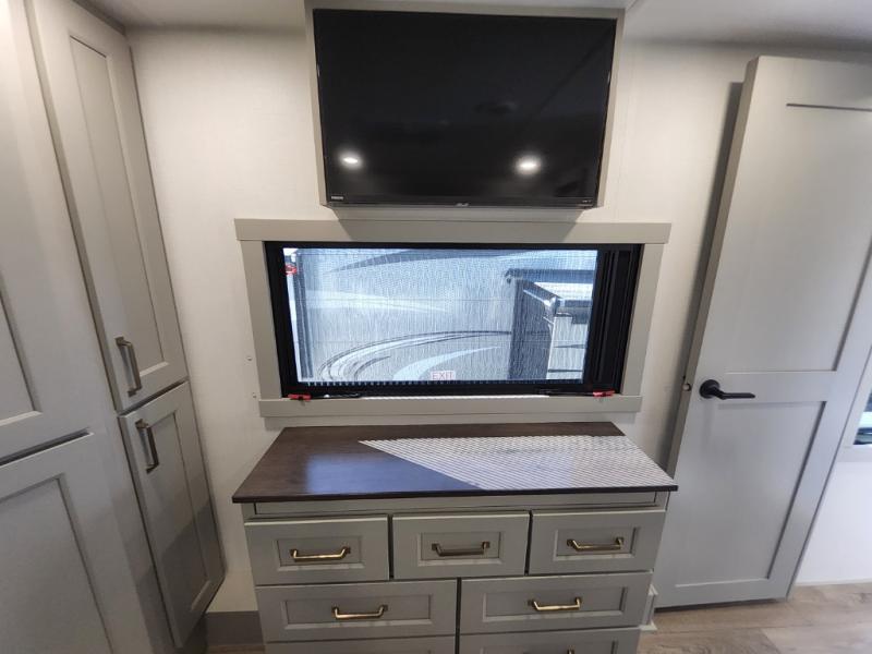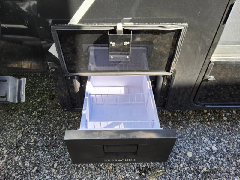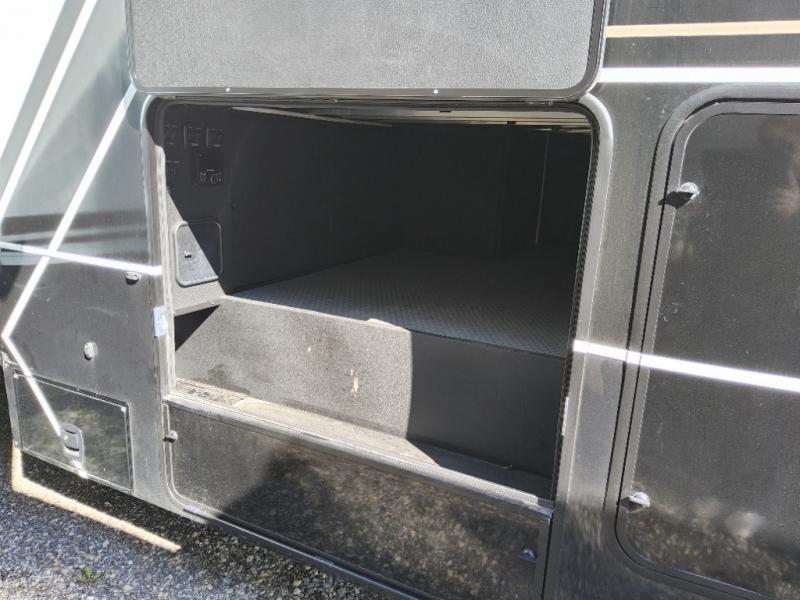 Prepare to be amazed by all the features packed into this toy hauler! There are triple slides that will provide your crew with more space, a 16' separate garage flex area that can sleep five with the loft included, plus a bath and a half for added convenience. The chef in your group will love the middle kitchen with a waterfall island that converts to a counter peninsula, a pull-out pantry, a GE Energy Star 19 cu. ft. refrigerator with ice and filtered water, and much more. In the combined kitchen and living area you'll find a spacious sofa with heat and massage, a fireplace, a TV, plus convenient dog bowls and shoe storage. After your toys are unloaded from the garage, you can relax on the independent dual couches with a Fold-N-Stow table in between. You will find the front private bedroom with a king bed slide out will provide a great night's rest, and you'll also find a walk-in closet, under-bed storage, and a sliding dresser top with hidden storage for special belongings.