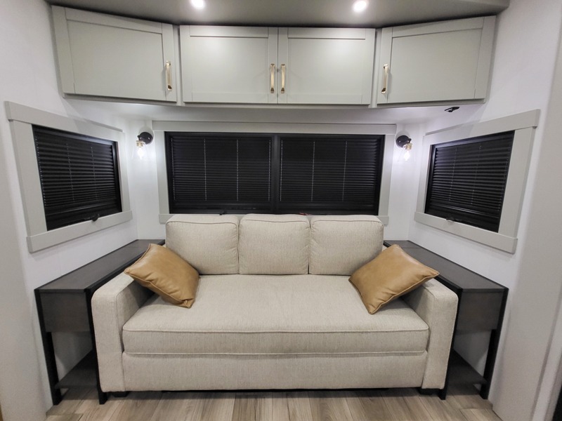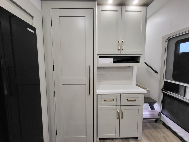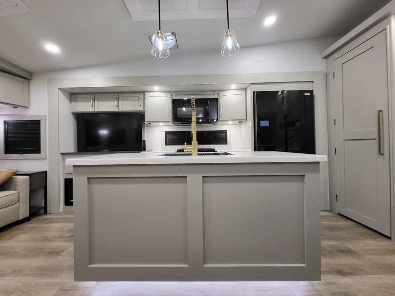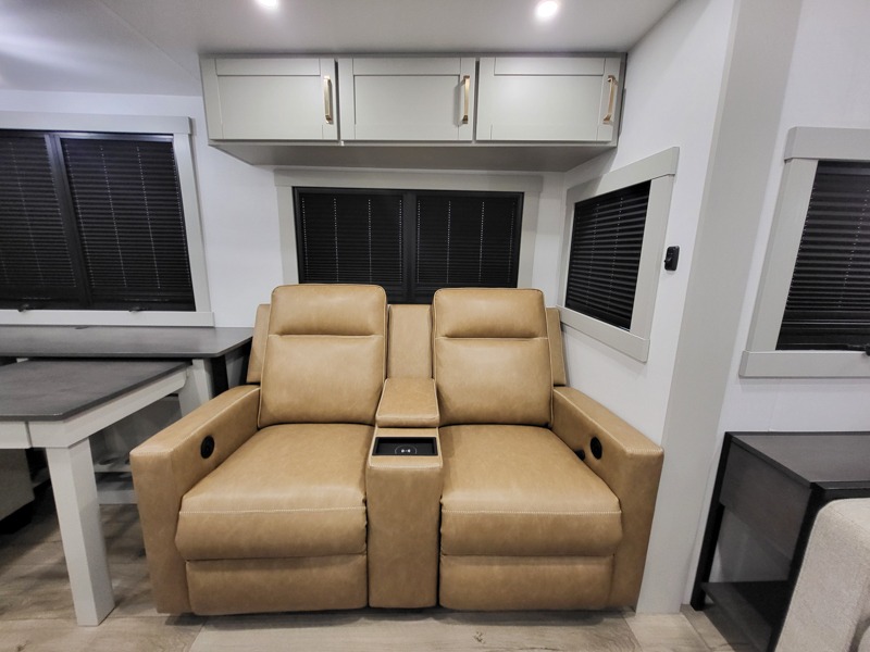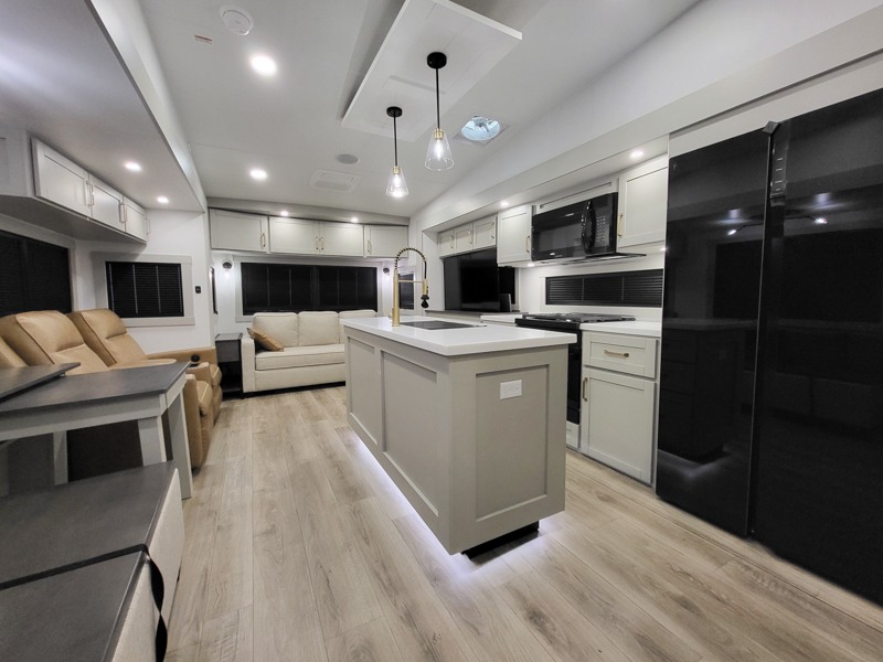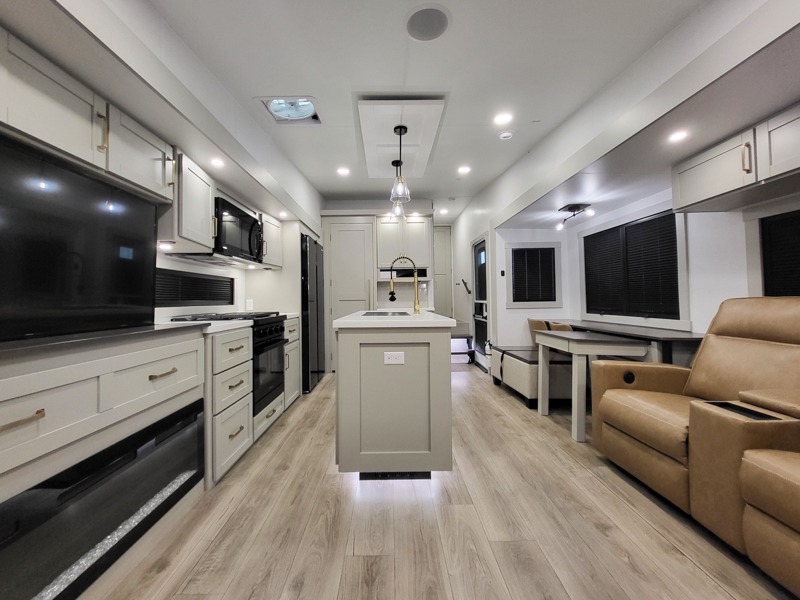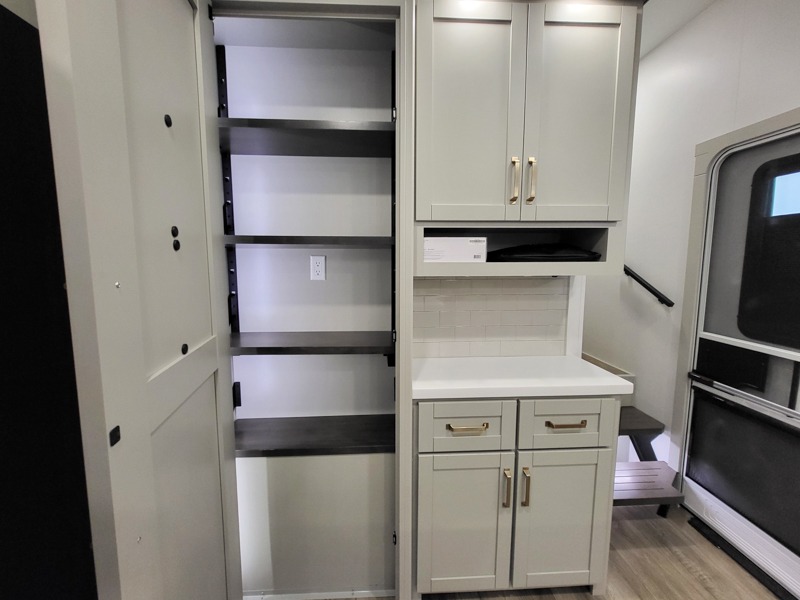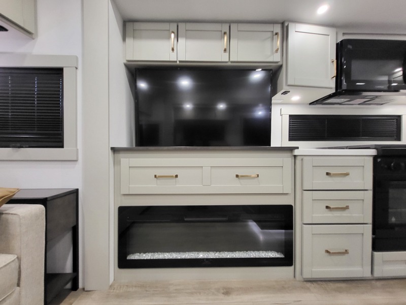 You're going to love every minute spent in this spacious fifth wheel that can sleep four. There is an inviting rear living area with a 72" tri-fold sofa and theater seating across from the televator and fireplace. The chef of your group can whip up dinner on the three burner cooktop or in the 30" residential microwave, and there is a 16 cu. ft. refrigerator that even opens when with the slide out is in. You will also enjoy the kitchen island with a farmhouse sink and roller cover, dual trash bins with a Stow N' Go paper towel holder, plus convenient dog bowls for your furry friends. You can store all your paper goods and snacks in the 84" pantry with adjustable shelving, and there is a hutch for nice dishes plus shoe storage in this model as well. Head to the front master bedroom where you'll find a queen bed with a TV, a large slide out with a wardrobe with drawers, plus a spacious bath.