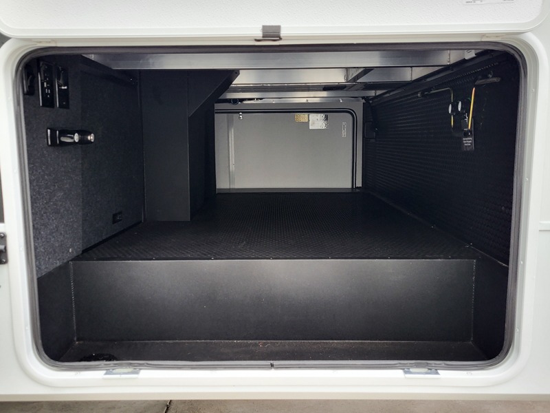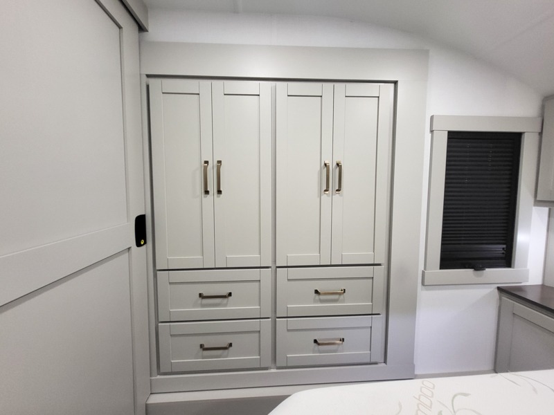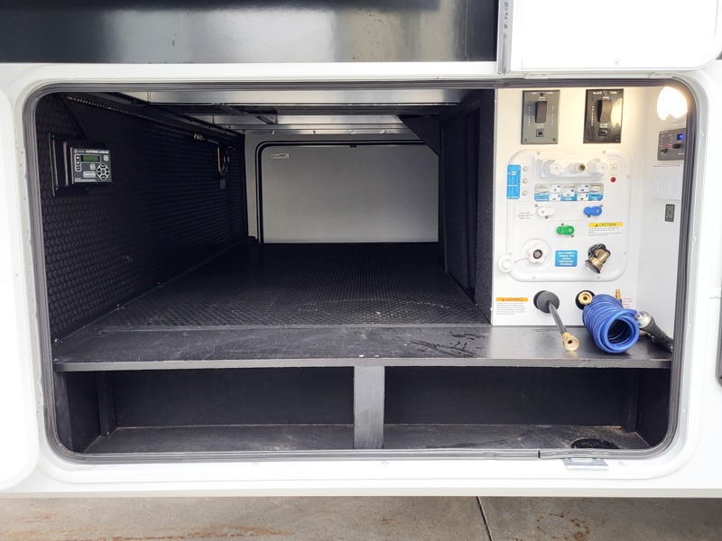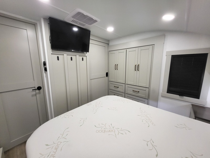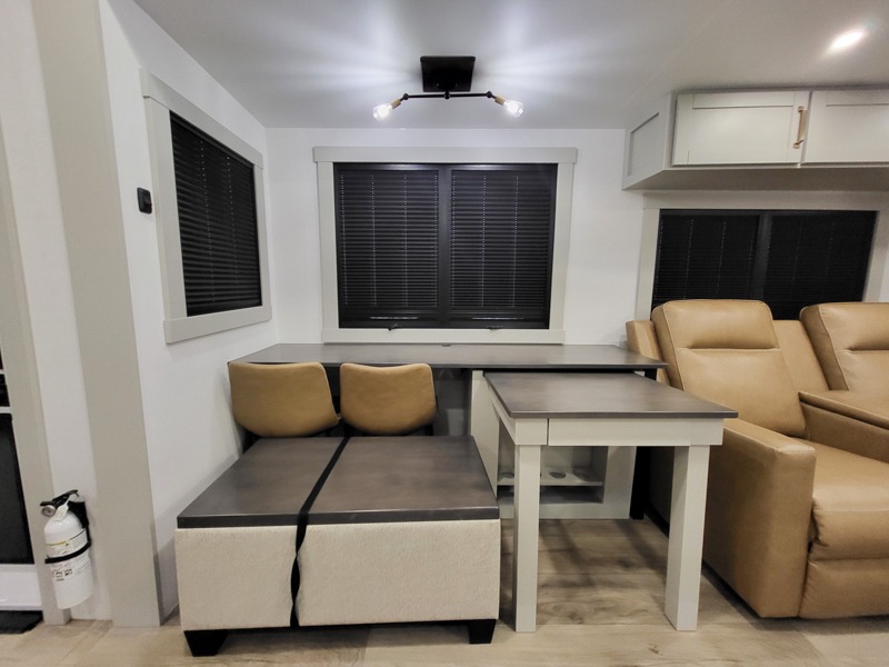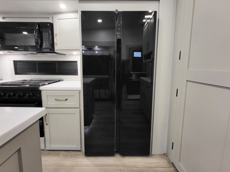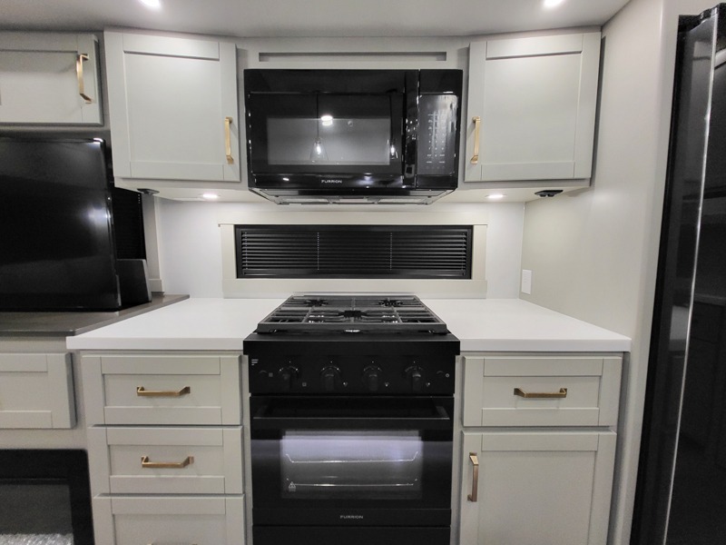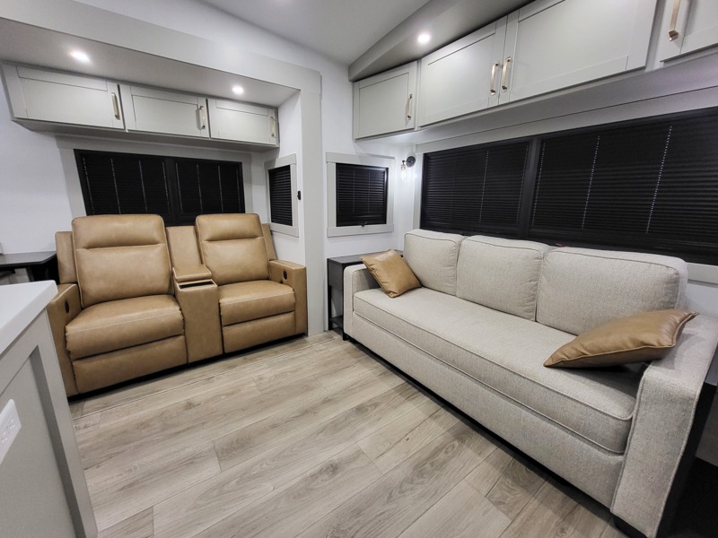 You're going to love every minute spent in this spacious fifth wheel that can sleep four. There is an inviting rear living area with a 72" tri-fold sofa and theater seating across from the televator and fireplace. The chef of your group can whip up dinner on the three burner cooktop or in the 30" residential microwave, and there is a 16 cu. ft. refrigerator that even opens when with the slide out is in. You will also enjoy the kitchen island with a farmhouse sink and roller cover, dual trash bins with a Stow N' Go paper towel holder, plus convenient dog bowls for your furry friends. You can store all your paper goods and snacks in the 84" pantry with adjustable shelving, and there is a hutch for nice dishes plus shoe storage in this model as well. Head to the front master bedroom where you'll find a queen bed with a TV, a large slide out with a wardrobe with drawers, plus a spacious bath.