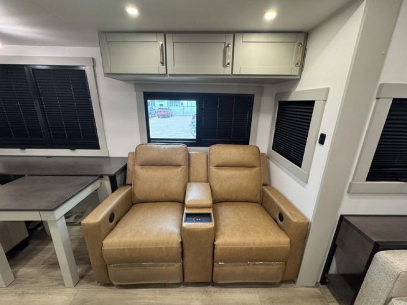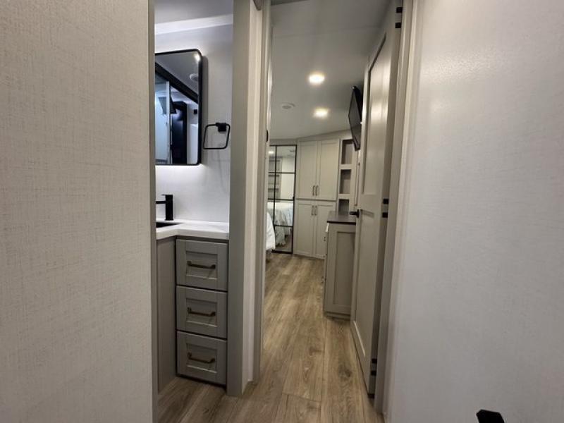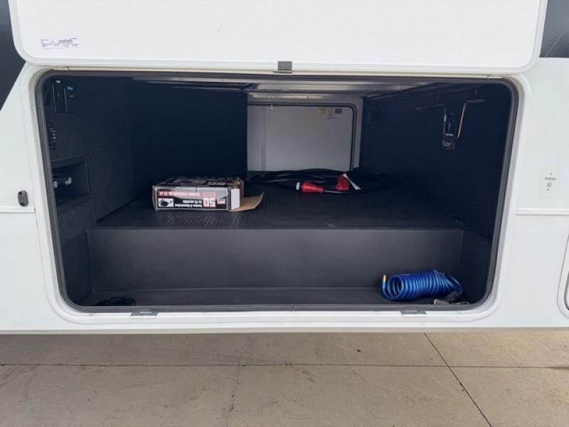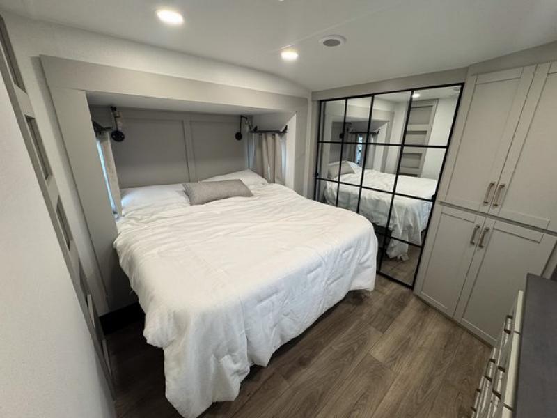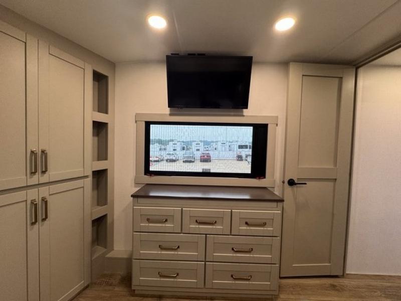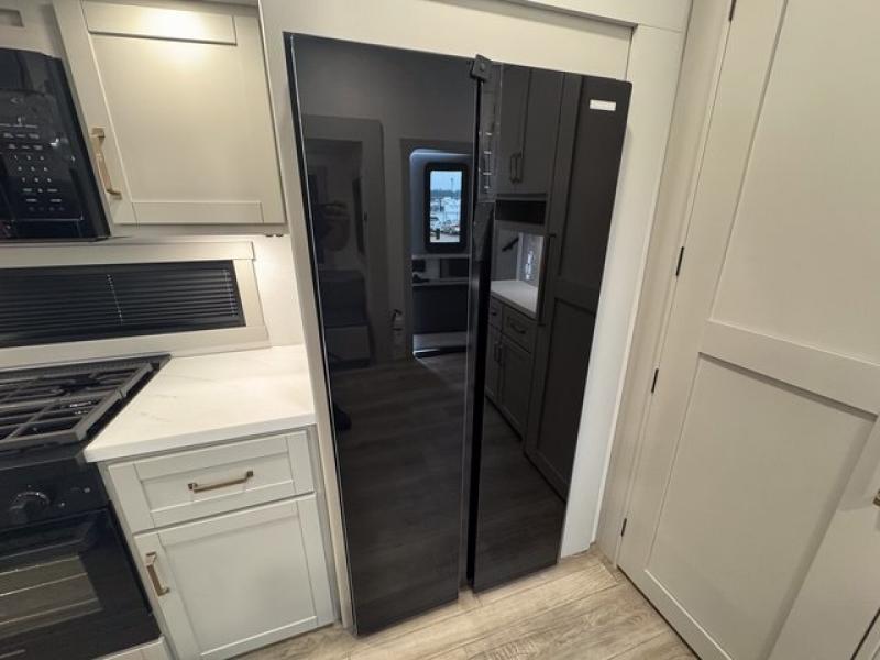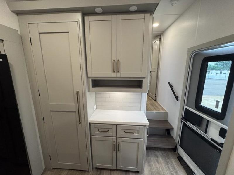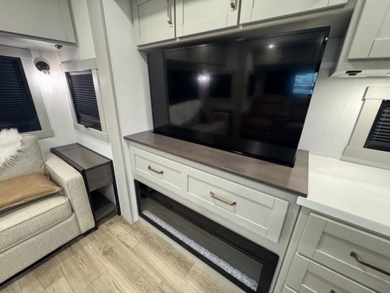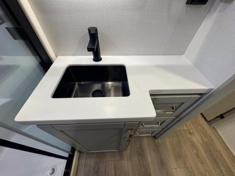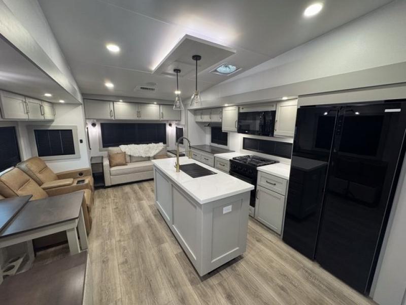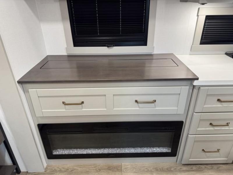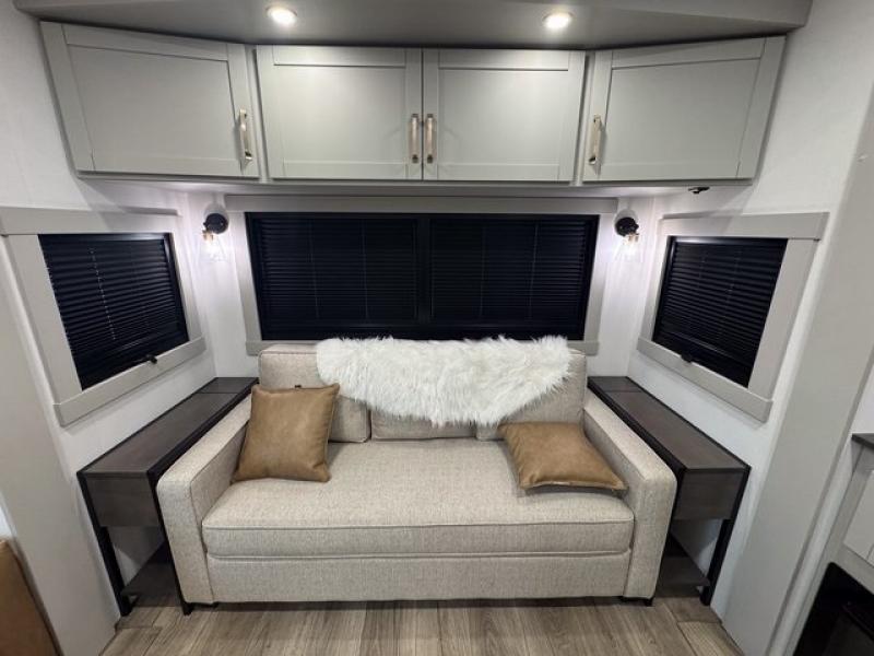 This Model Z luxury fifth wheel is bright and modern on the inside, with loads of amenities that will have you dreaming of your next trip! Enter and find a spacious combined living/kitchen space thanks to dual opposing slides. There is ample seating with a sliding desk/dining table, 62" theater seating, and a 72" tri-fold sofa along the rear wall. You can easily relax and enjoy the 50" Smart telescoping TV with a cozy fireplace below. The kitchen offers all that you need to prepare and cook meals just like home with a 16 cu. ft. refrigerator for your perishables, a 30" microwave oven, and three burner range top and oven. You will love the integrated spice rack, and the kitchen island all outfitted with dog bowls and double pull out trash bins with an integrated Stow 'N Go paper towel holder. There is also an 84" pantry with adjustable shelves for all of your canned and dry goods. Head up the steps to a private master suite with king bed slide. You can opt for the queen bed if you like. A sliding dresser top features hidden storage which is perfect for jewelry and other personal belongings. The front wardrobe features mirrored doors and the corner closet has been prepped for a stackable washer and dryer if you choose to add that option. Relax and enjoy a large bath featuring a linen cabinet, a 30" x 42" shower, and vanity with sink, plus medicine cabinet.