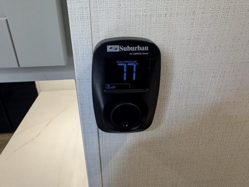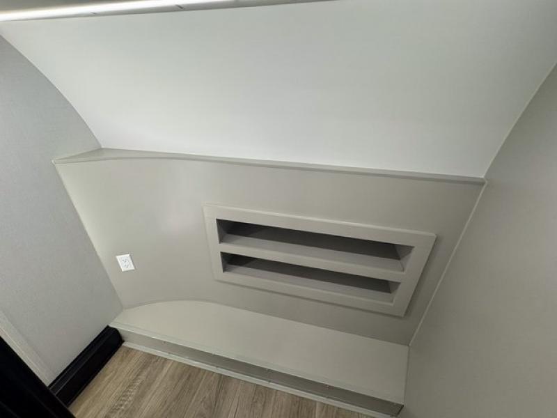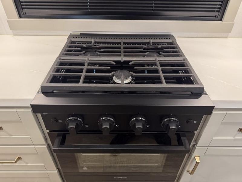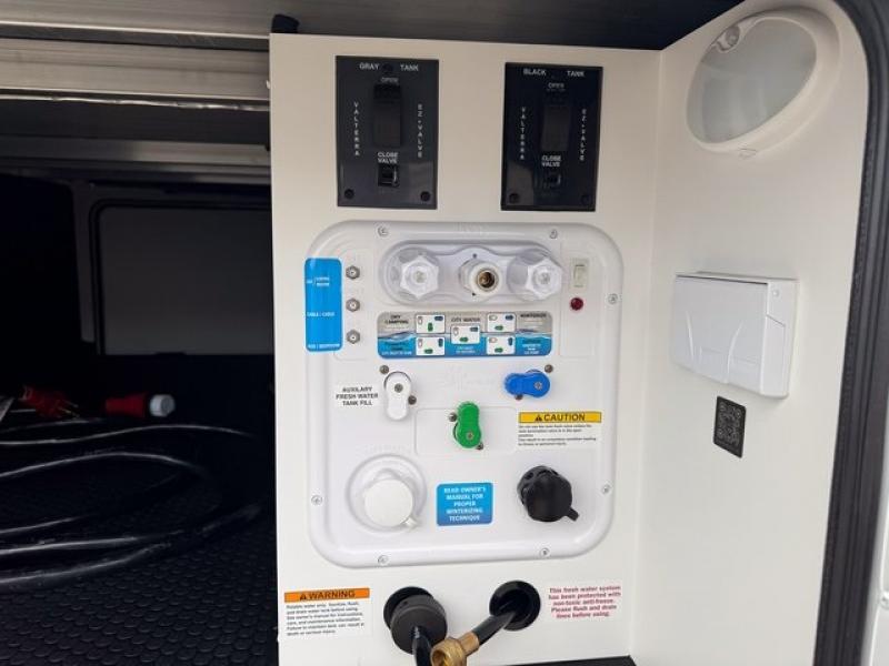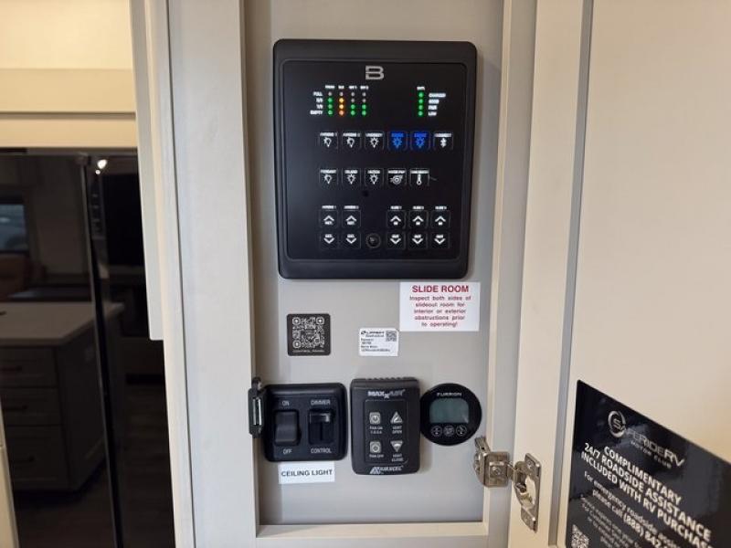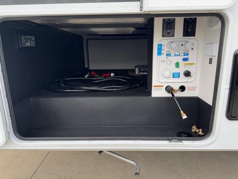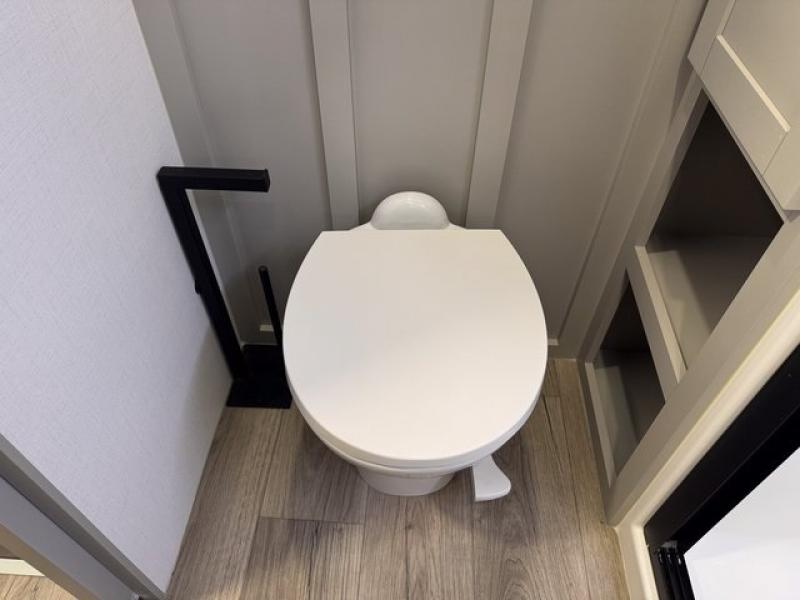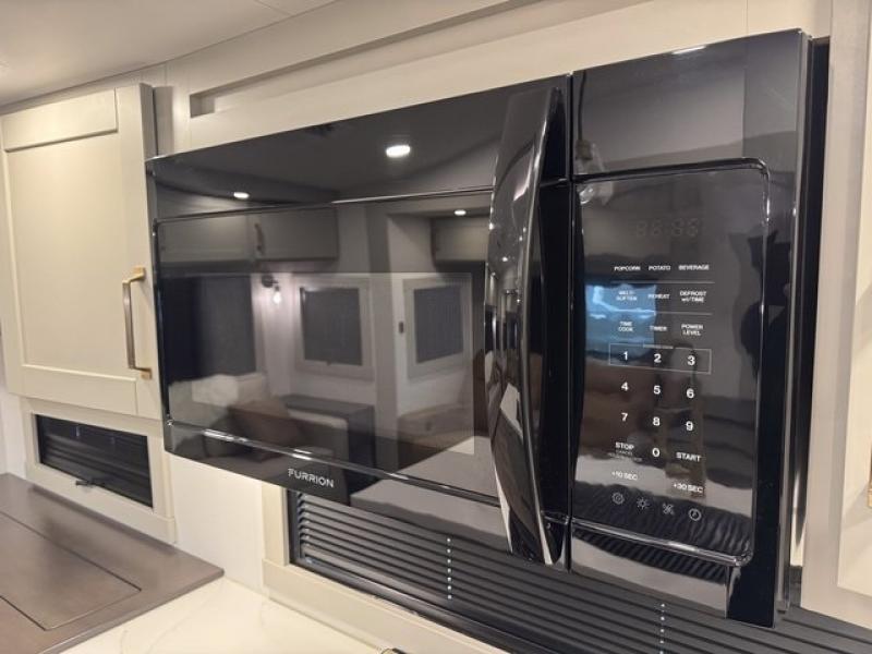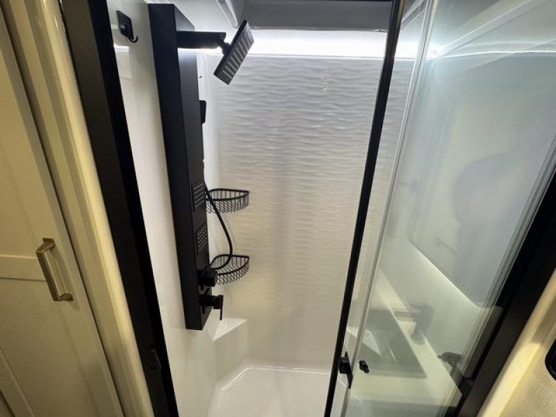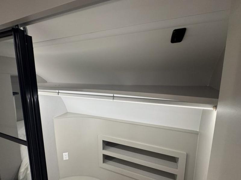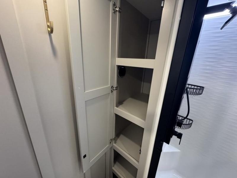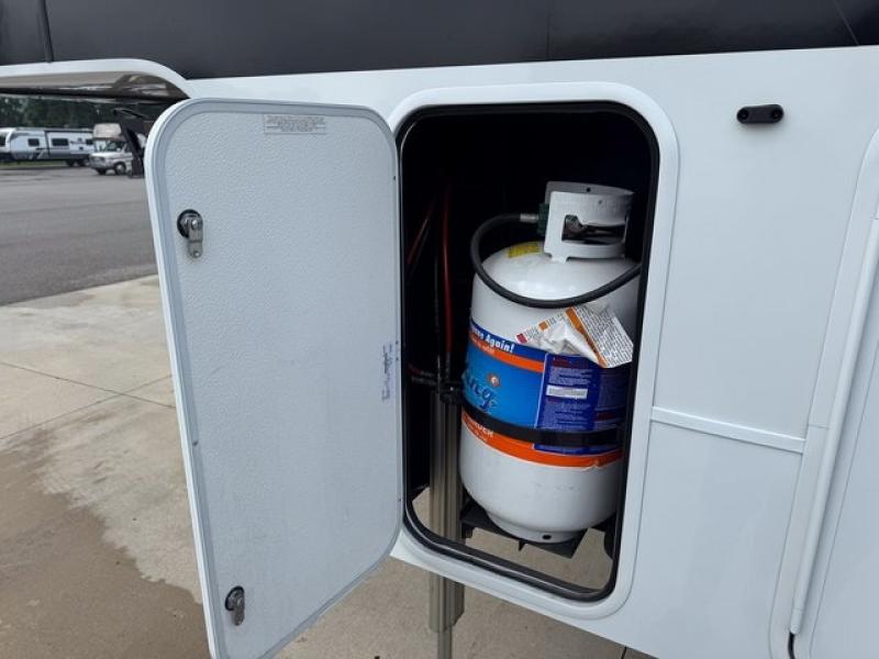 This Model Z luxury fifth wheel is bright and modern on the inside, with loads of amenities that will have you dreaming of your next trip! Enter and find a spacious combined living/kitchen space thanks to dual opposing slides. There is ample seating with a sliding desk/dining table, 62" theater seating, and a 72" tri-fold sofa along the rear wall. You can easily relax and enjoy the 50" Smart telescoping TV with a cozy fireplace below. The kitchen offers all that you need to prepare and cook meals just like home with a 16 cu. ft. refrigerator for your perishables, a 30" microwave oven, and three burner range top and oven. You will love the integrated spice rack, and the kitchen island all outfitted with dog bowls and double pull out trash bins with an integrated Stow 'N Go paper towel holder. There is also an 84" pantry with adjustable shelves for all of your canned and dry goods. Head up the steps to a private master suite with king bed slide. You can opt for the queen bed if you like. A sliding dresser top features hidden storage which is perfect for jewelry and other personal belongings. The front wardrobe features mirrored doors and the corner closet has been prepped for a stackable washer and dryer if you choose to add that option. Relax and enjoy a large bath featuring a linen cabinet, a 30" x 42" shower, and vanity with sink, plus medicine cabinet.