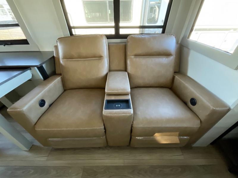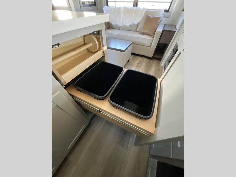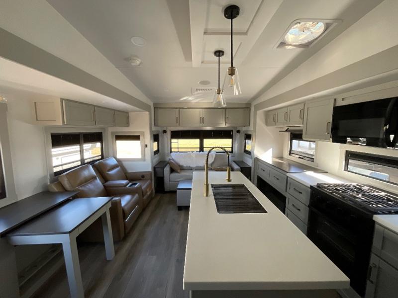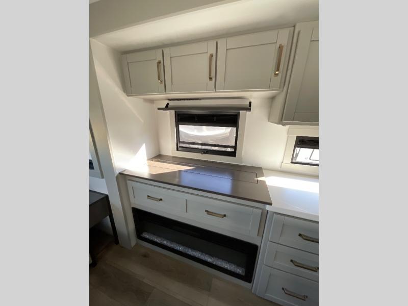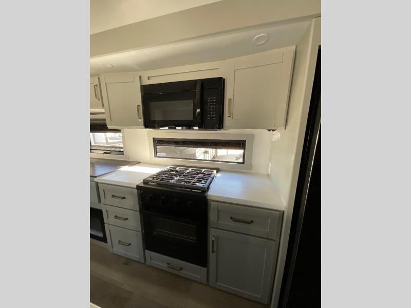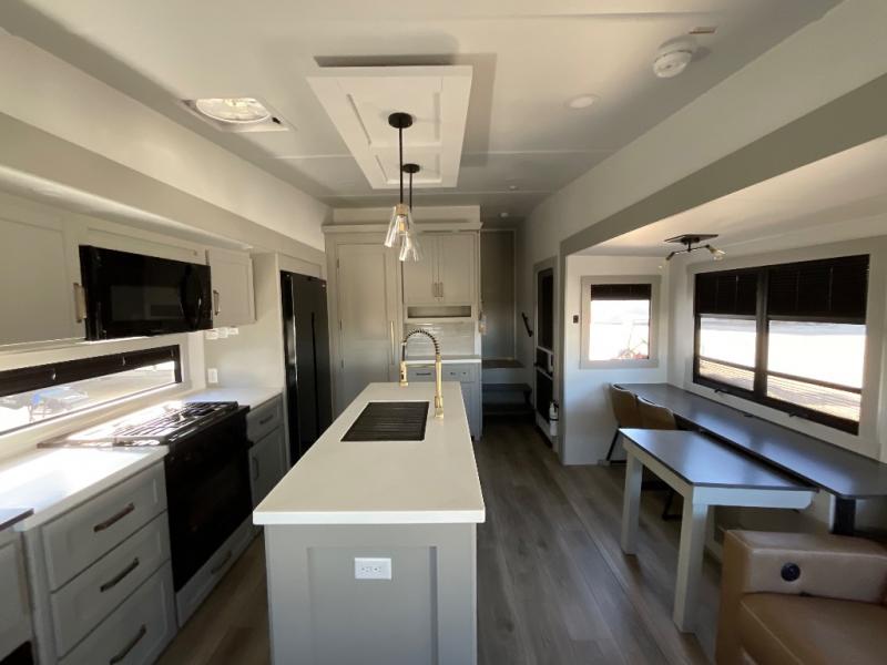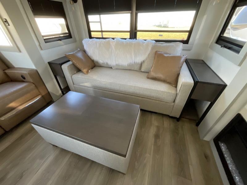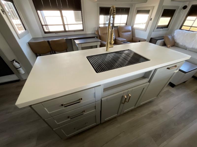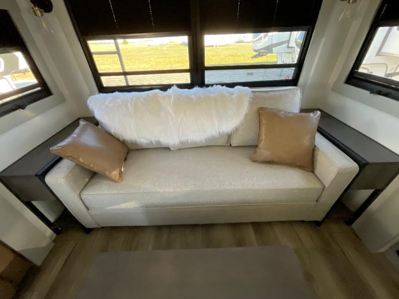 This Model Z luxury fifth wheel is bright and modern on the inside, with loads of amenities that will have you dreaming of your next trip! Enter and find a spacious combined living/kitchen space thanks to dual opposing slides. There is ample seating with a sliding desk/dining table, 62" theater seating, and a 72" tri-fold sofa along the rear wall. You can easily relax and enjoy the 50" Smart telescoping TV with a cozy fireplace below. The kitchen offers all that you need to prepare and cook meals just like home with a 16 cu. ft. refrigerator for your perishables, a 30" microwave oven, and three burner range top and oven. You will love the integrated spice rack, and the kitchen island all outfitted with dog bowls and double pull out trash bins with an integrated Stow 'N Go paper towel holder. There is also an 84" pantry with adjustable shelves for all of your canned and dry goods. Head up the steps to a private master suite with king bed slide. You can opt for the queen bed if you like. A sliding dresser top features hidden storage which is perfect for jewelry and other personal belongings. The front wardrobe features mirrored doors and the corner closet has been prepped for a stackable washer and dryer if you choose to add that option. Relax and enjoy a large bath featuring a linen cabinet, a 30" x 42" shower, and vanity with sink, plus medicine cabinet.