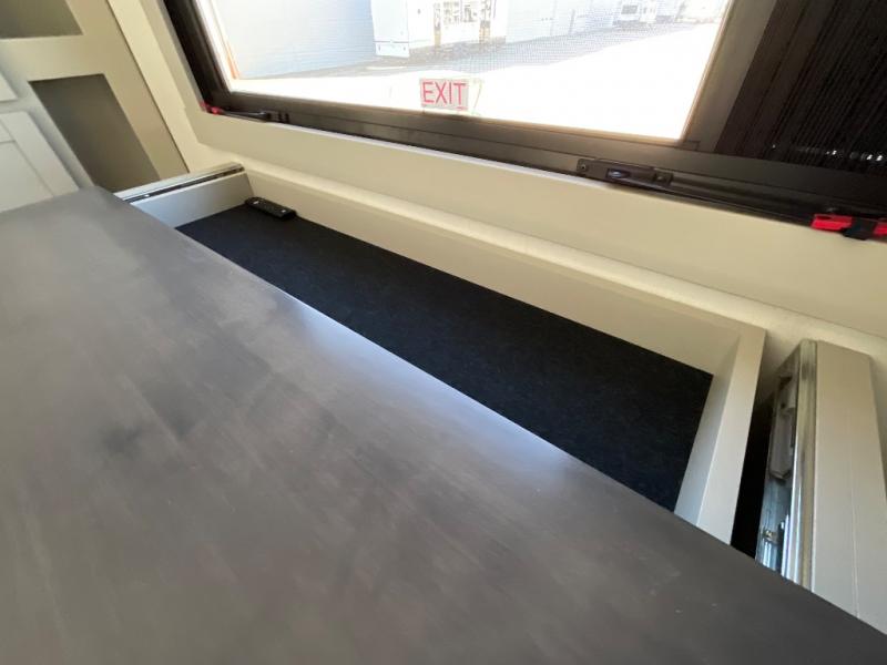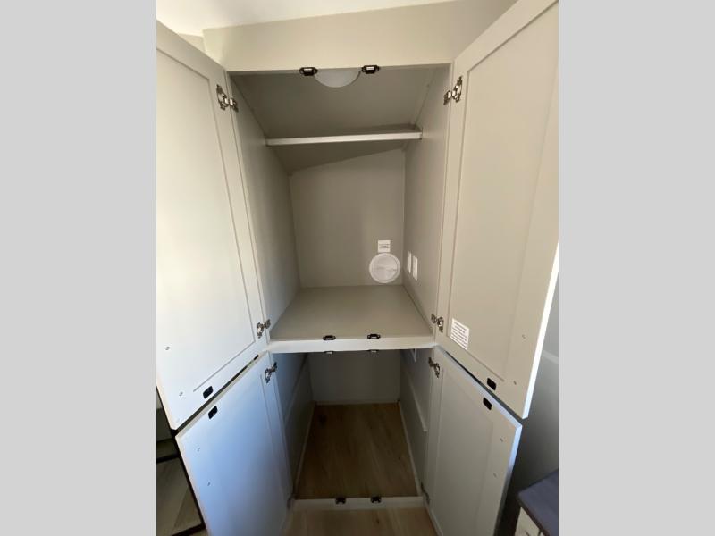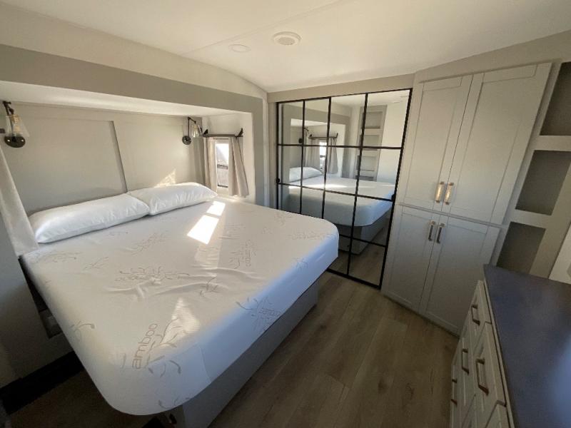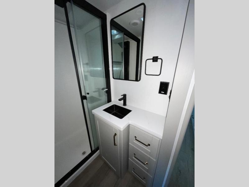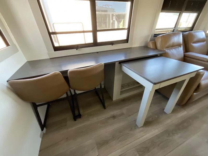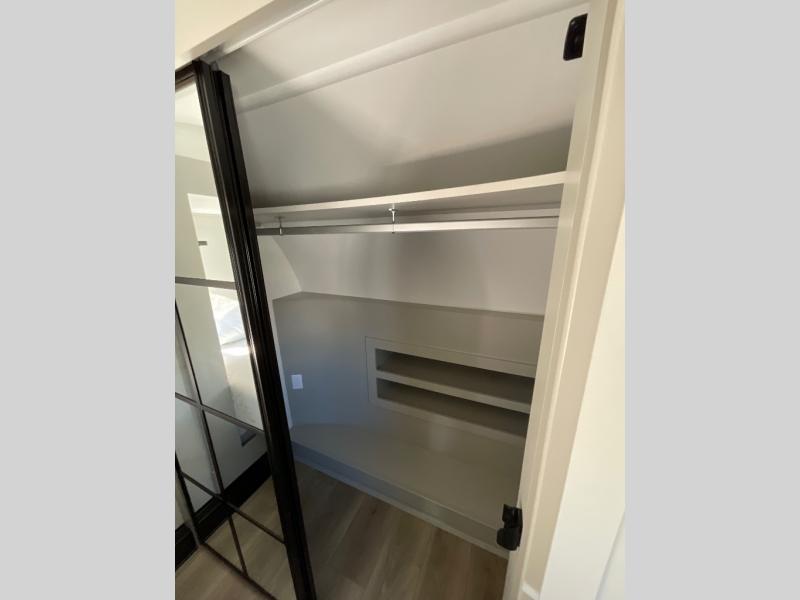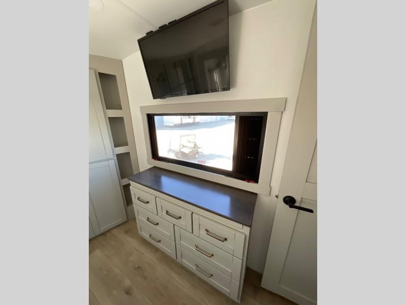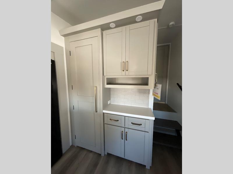 This Model Z luxury fifth wheel is bright and modern on the inside, with loads of amenities that will have you dreaming of your next trip! Enter and find a spacious combined living/kitchen space thanks to dual opposing slides. There is ample seating with a sliding desk/dining table, 62" theater seating, and a 72" tri-fold sofa along the rear wall. You can easily relax and enjoy the 50" Smart telescoping TV with a cozy fireplace below. The kitchen offers all that you need to prepare and cook meals just like home with a 16 cu. ft. refrigerator for your perishables, a 30" microwave oven, and three burner range top and oven. You will love the integrated spice rack, and the kitchen island all outfitted with dog bowls and double pull out trash bins with an integrated Stow 'N Go paper towel holder. There is also an 84" pantry with adjustable shelves for all of your canned and dry goods. Head up the steps to a private master suite with king bed slide. You can opt for the queen bed if you like. A sliding dresser top features hidden storage which is perfect for jewelry and other personal belongings. The front wardrobe features mirrored doors and the corner closet has been prepped for a stackable washer and dryer if you choose to add that option. Relax and enjoy a large bath featuring a linen cabinet, a 30" x 42" shower, and vanity with sink, plus medicine cabinet.