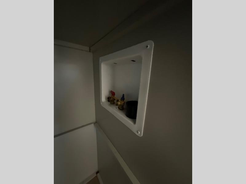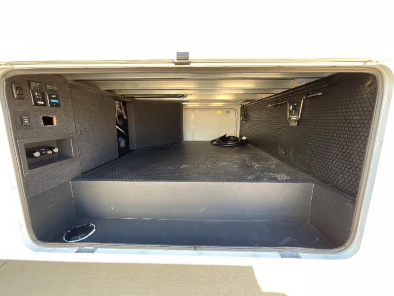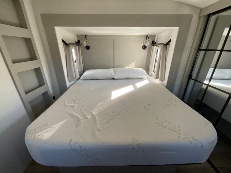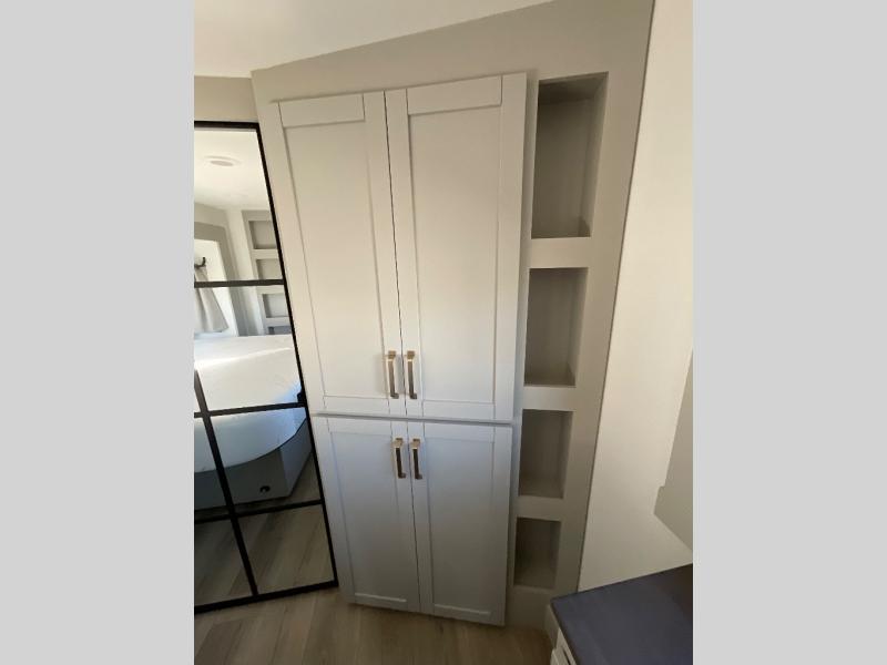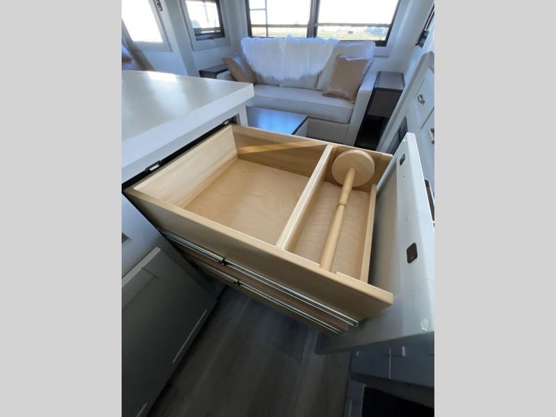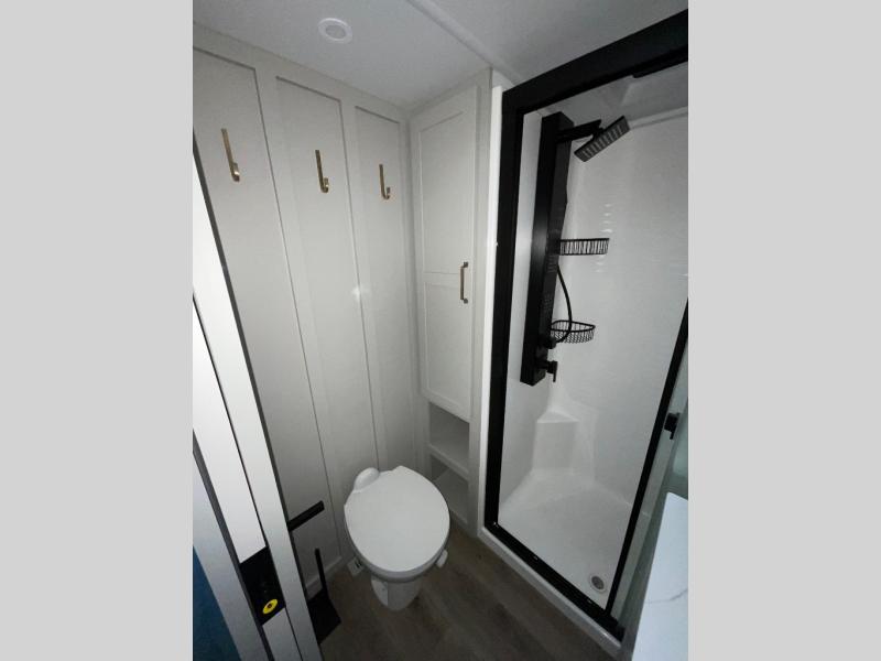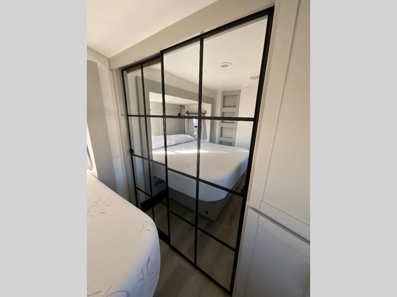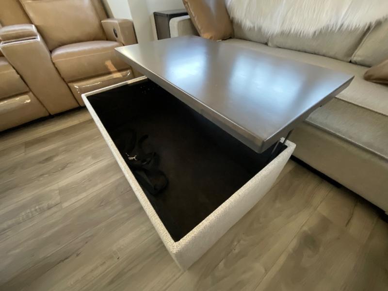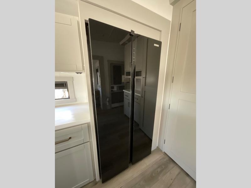 This Model Z luxury fifth wheel is bright and modern on the inside, with loads of amenities that will have you dreaming of your next trip! Enter and find a spacious combined living/kitchen space thanks to dual opposing slides. There is ample seating with a sliding desk/dining table, 62" theater seating, and a 72" tri-fold sofa along the rear wall. You can easily relax and enjoy the 50" Smart telescoping TV with a cozy fireplace below. The kitchen offers all that you need to prepare and cook meals just like home with a 16 cu. ft. refrigerator for your perishables, a 30" microwave oven, and three burner range top and oven. You will love the integrated spice rack, and the kitchen island all outfitted with dog bowls and double pull out trash bins with an integrated Stow 'N Go paper towel holder. There is also an 84" pantry with adjustable shelves for all of your canned and dry goods. Head up the steps to a private master suite with king bed slide. You can opt for the queen bed if you like. A sliding dresser top features hidden storage which is perfect for jewelry and other personal belongings. The front wardrobe features mirrored doors and the corner closet has been prepped for a stackable washer and dryer if you choose to add that option. Relax and enjoy a large bath featuring a linen cabinet, a 30" x 42" shower, and vanity with sink, plus medicine cabinet.
