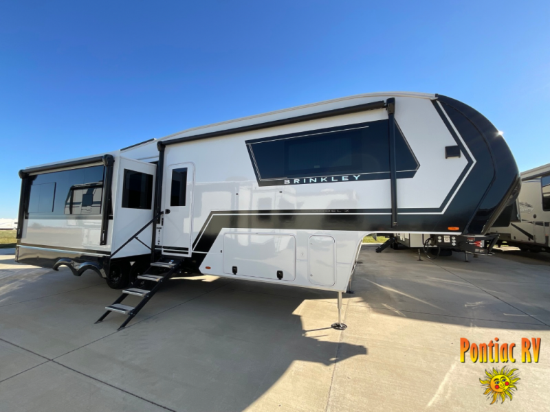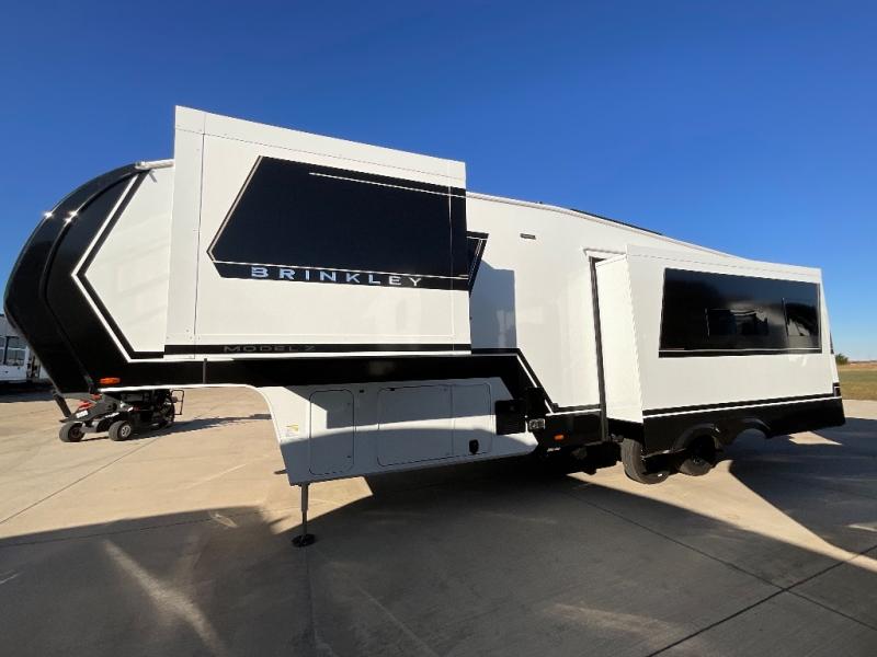 The Brinkley mid-profile Model Z fifth wheels bring you clean lines and an upscale look with plenty of style and exciting new features like the industry first brass plumbing connections. These units also feature an automotive grade front cap, plenty of exterior storage, dual exterior hot and cold showers, and wide stance leveling jacks for easy set up. Residential frameless windows provide a clean look and beautiful views, and ample electrical outlets and 6 USB/USB-C outlets allow all of your electronics and appliances to easily be used and charged.