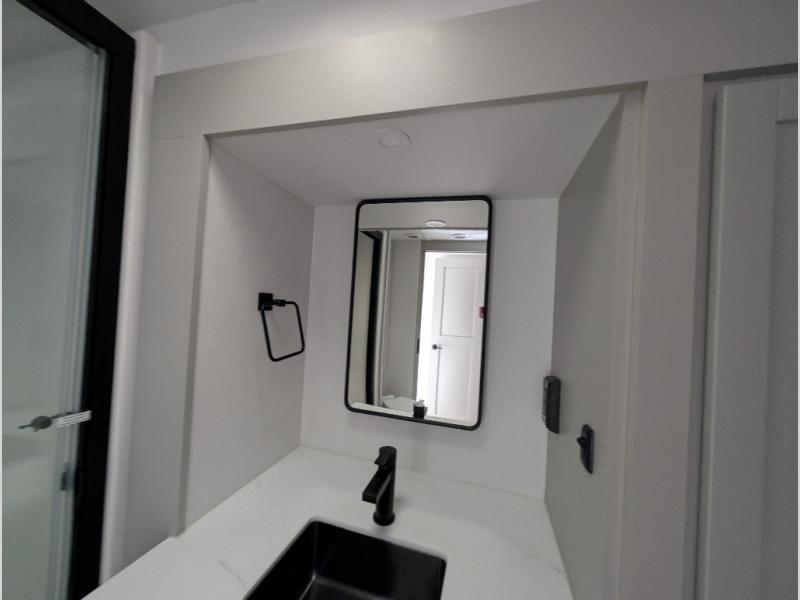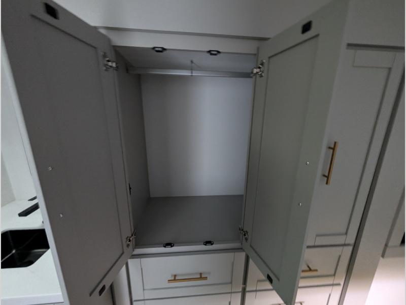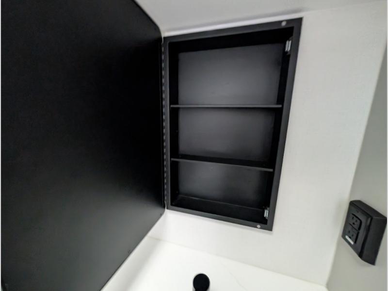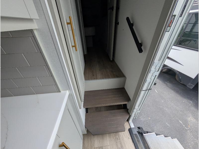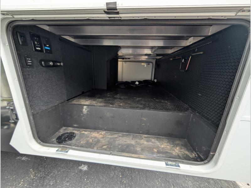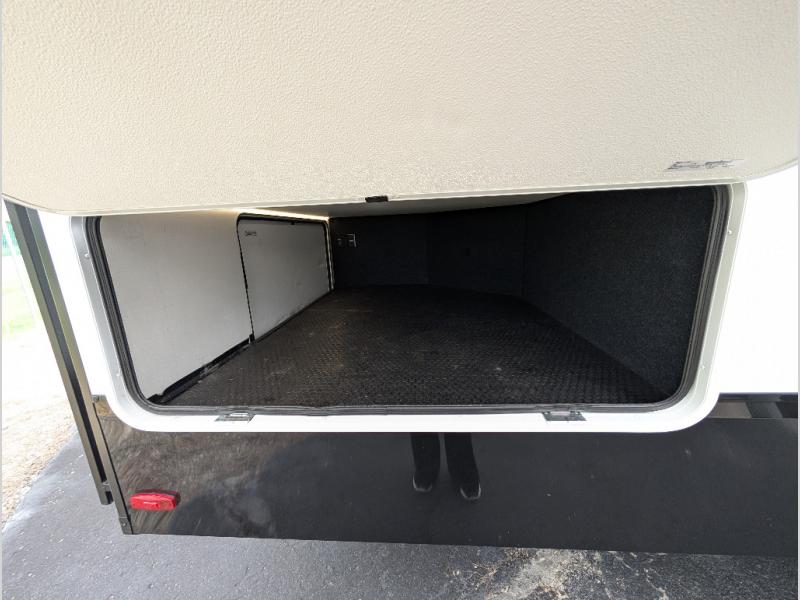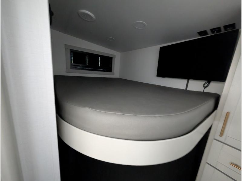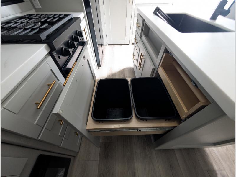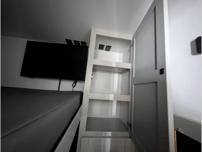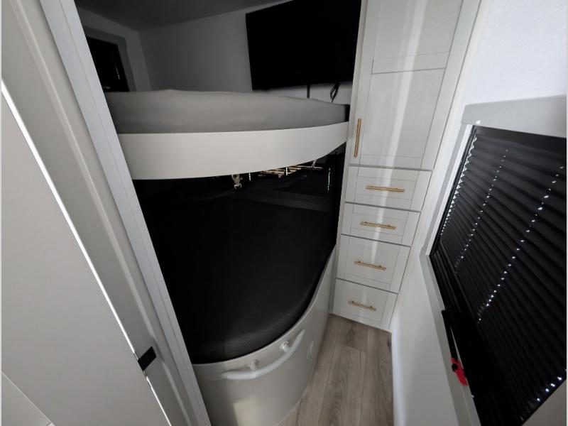 The perfect unit for your larger family, this Model Z can sleep eight! Step inside and find a wide open combined kitchen and living room. There is a large slide out theater seat with two recliners and seating for four, plus a 60" tri-fold sofa, and a televator and fireplace in the appliance slide along the roadside. The center island features dual trash bins and stow & go paper towel holder, a large sink, and even dog bowls for your favorite furry friend. A 16 cu. ft. refrigerator will house all of your perishables, and you will also have an 84" pantry with adjustable shelves for all of your dry goods and snacks. Head up the steps to your right, just inside the entry, to find a private master bedroom and bath at the end of the hall. Here you will find a queen bed, slide out wardrobe with a dresser, and the bathroom vanity. A large 30" x 42" shower will welcome you each morning or night to keep clean and refreshed. At the very back of the unit, guests will enjoy a private bunkhouse with 54" x 74" bunk beds, a TV, and wardrobe with drawers beneath. The outside features over 160 cu. ft. of exterior storage with mid-coach pass-through and exterior storage access, plus two awnings for added outdoor living.