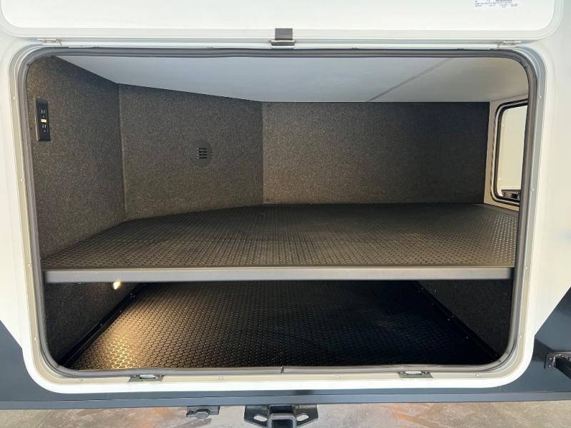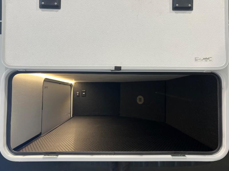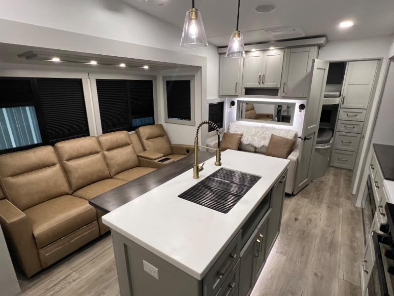 The perfect unit for your larger family, this Model Z can sleep eight! Step inside and find a wide open combined kitchen and living room. There is a large slide out theater seat with two recliners and seating for four, plus a 60" tri-fold sofa, and a televator and fireplace in the appliance slide along the roadside. The center island features dual trash bins and stow & go paper towel holder, a large sink, and even dog bowls for your favorite furry friend. A 16 cu. ft. refrigerator will house all of your perishables, and you will also have an 84" pantry with adjustable shelves for all of your dry goods and snacks. Head up the steps to your right, just inside the entry, to find a private master bedroom and bath at the end of the hall. Here you will find a queen bed, slide out wardrobe with a dresser, and the bathroom vanity. A large 30" x 42" shower will welcome you each morning or night to keep clean and refreshed. At the very back of the unit, guests will enjoy a private bunkhouse with 54" x 74" bunk beds, a TV, and wardrobe with drawers beneath. The outside features over 160 cu. ft. of exterior storage with mid-coach pass-through and exterior storage access, plus two awnings for added outdoor living.