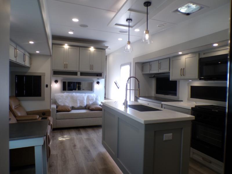 You're going to love every minute spent in this triple slide out fifth wheel! Once you arrive at the campground, you can put out the two side awnings, set up the rear patio and awning, then make lunch on the outdoor kitchen! There is also an outdoor TV here, a bar sink, and a refrigerator to keep drinks close by! Inside, the chef will find everything they need if the weather isn't cooperating, including a 30" residential microwave, 16 cu. ft. refrigerator, plus a large kitchen island, complete with dual trash bins and dog bowls at the foot. Your crew can get cozy on the tri-fold sofa that extends to a 54" x 70" bed for guests, and there is theater seating across from the televator and fireplace for easy viewing! You will find the front private bedroom ultra accommodating with its king bed slide out, sliding dresser top with hidden storage, your own TV, and a front wardrobe with shelves and a shoe rack. There is even washer and dryer prep if you want the option to make laundry day that much easier!