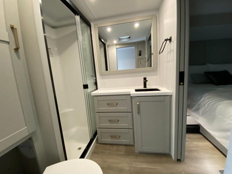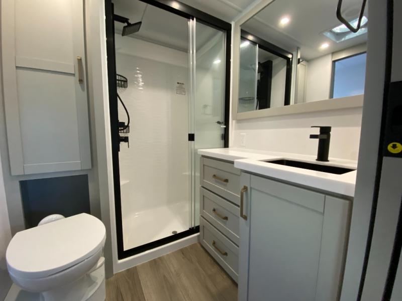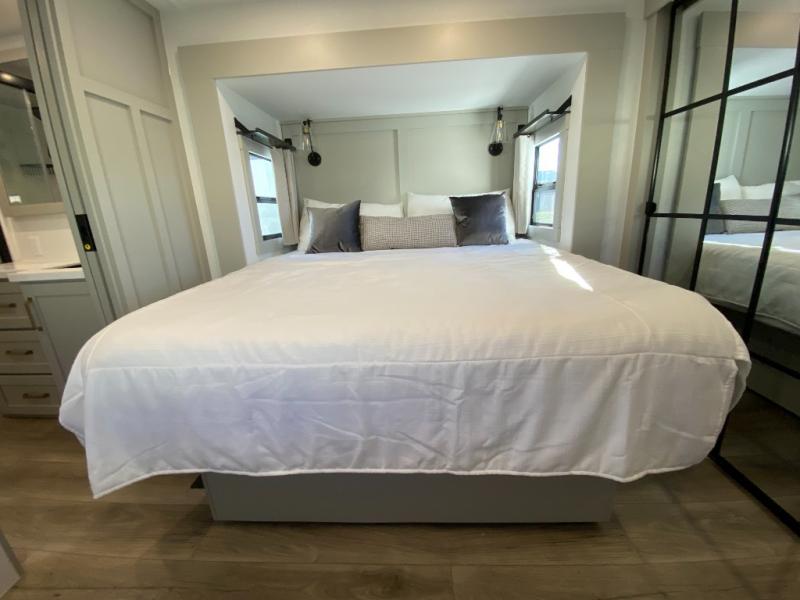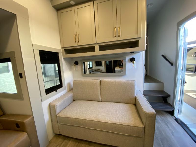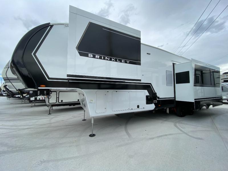 The Brinkley mid-profile Model Z fifth wheels bring you clean lines and an upscale look with plenty of style and exciting new features like the industry first brass plumbing connections. These units also feature an automotive grade front cap, plenty of exterior storage, exterior hot and cold showers, and wide stance leveling jacks for easy set up. Residential frameless windows provide a clean look and beautiful views, and ample electrical outlets and 6 USB/USB-C outlets allow all of your electronics and appliances to easily be used and charged.