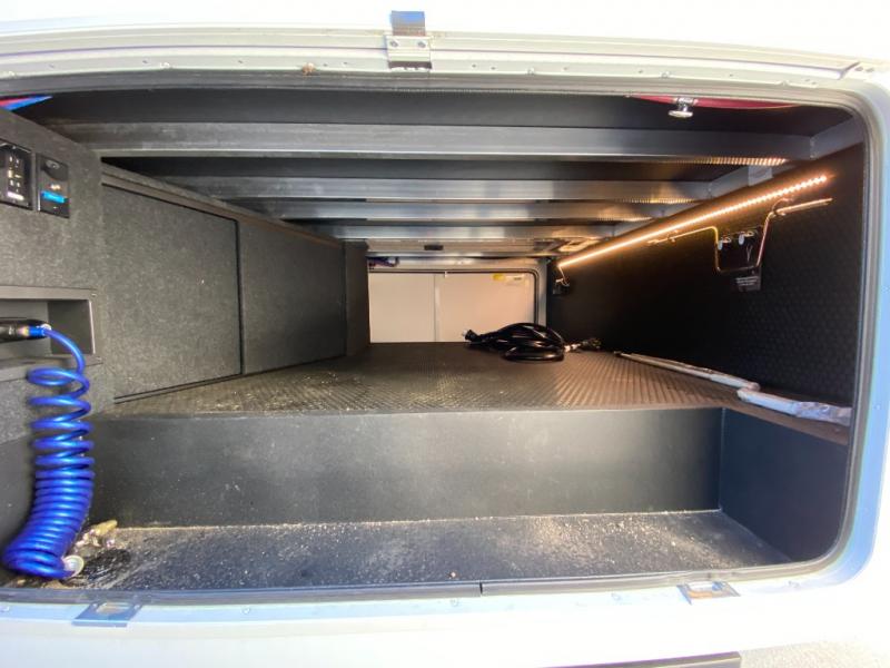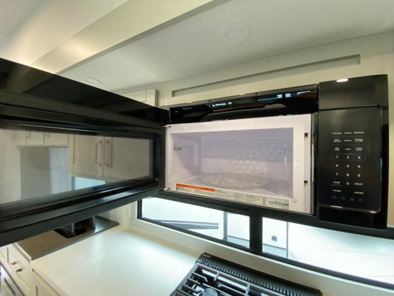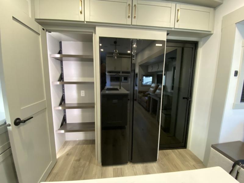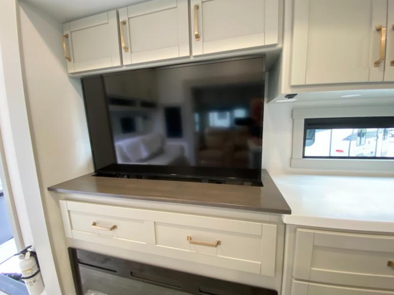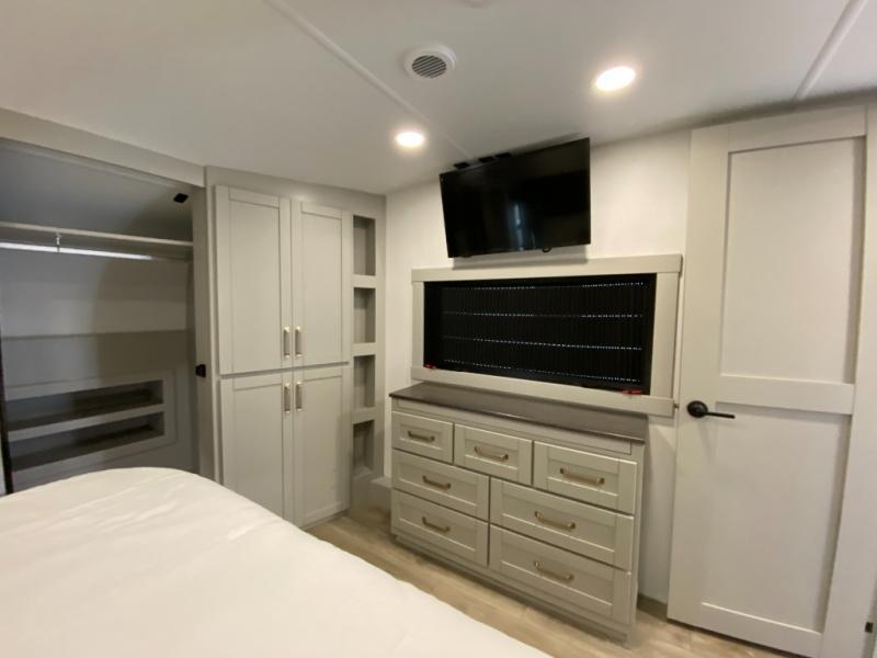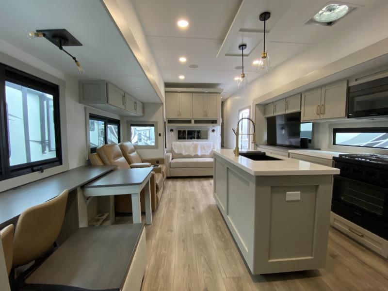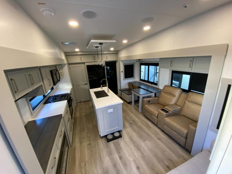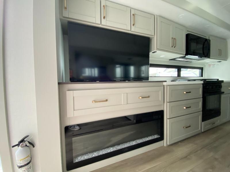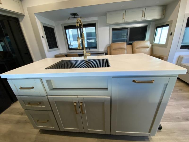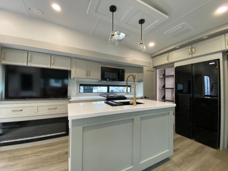 You're going to love every minute spent in this triple slide out fifth wheel! Once you arrive at the campground, you can put out the two side awnings, set up the rear patio and awning, then make lunch on the outdoor kitchen! There is also an outdoor TV here, a bar sink, and a refrigerator to keep drinks close by! Inside, the chef will find everything they need if the weather isn't cooperating, including a 30" residential microwave, 16 cu. ft. refrigerator, plus a large kitchen island, complete with dual trash bins and dog bowls at the foot. Your crew can get cozy on the tri-fold sofa that extends to a 54" x 70" bed for guests, and there is theater seating across from the televator and fireplace for easy viewing! You will find the front private bedroom ultra accommodating with its king bed slide out, sliding dresser top with hidden storage, your own TV, and a front wardrobe with shelves and a shoe rack. There is even washer and dryer prep if you want the option to make laundry day that much easier!