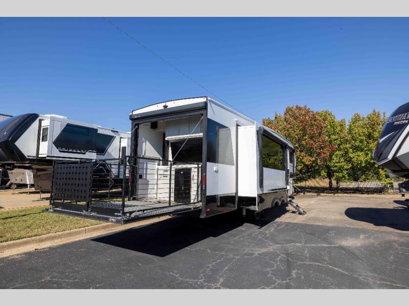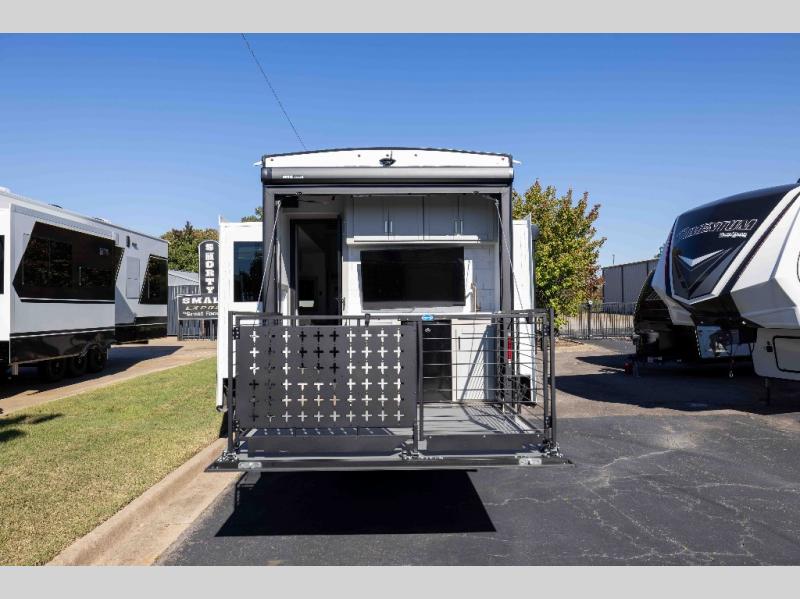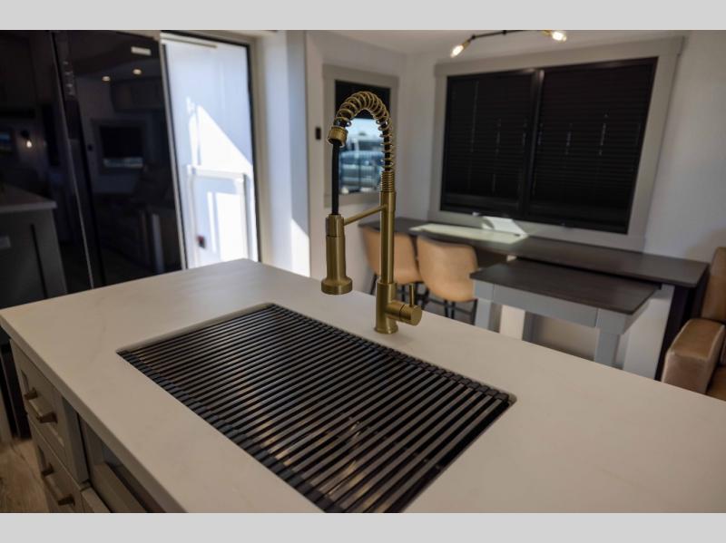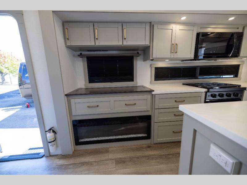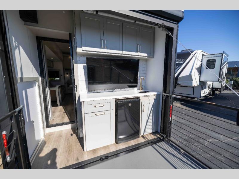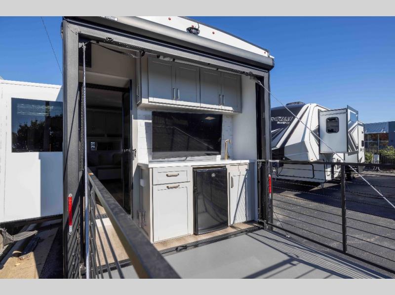 You're going to love every minute spent in this triple slide out fifth wheel! Once you arrive at the campground, you can put out the two side awnings, set up the rear patio and awning, then make lunch on the outdoor kitchen! There is also an outdoor TV here, a bar sink, and a refrigerator to keep drinks close by! Inside, the chef will find everything they need if the weather isn't cooperating, including a 30" residential microwave, 16 cu. ft. refrigerator, plus a large kitchen island, complete with dual trash bins and dog bowls at the foot. Your crew can get cozy on the tri-fold sofa that extends to a 54" x 70" bed for guests, and there is theater seating across from the televator and fireplace for easy viewing! You will find the front private bedroom ultra accommodating with its king bed slide out, sliding dresser top with hidden storage, your own TV, and a front wardrobe with shelves and a shoe rack. There is even washer and dryer prep if you want the option to make laundry day that much easier!
