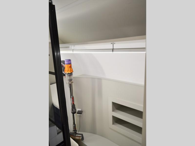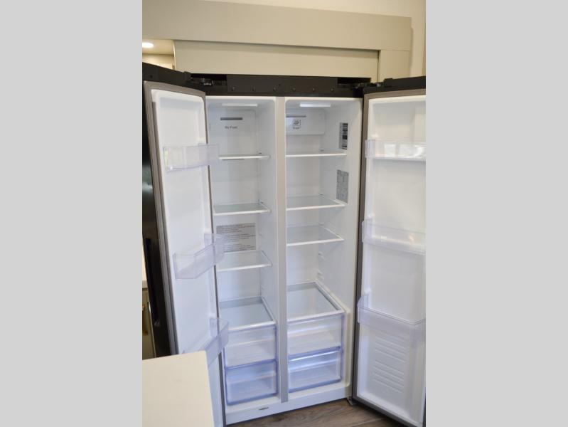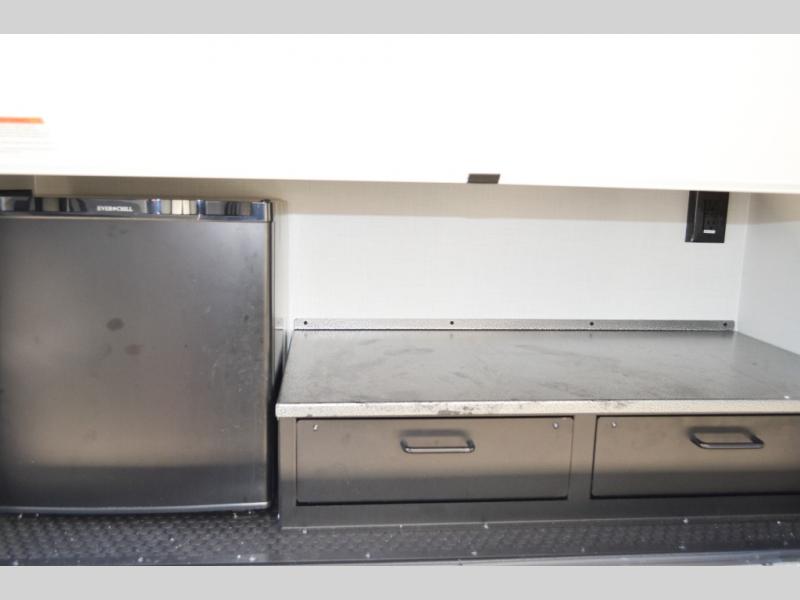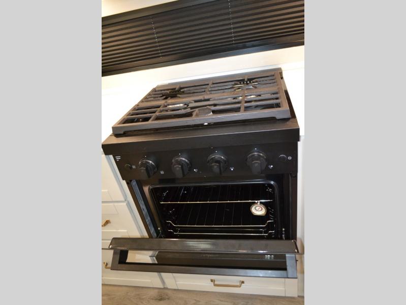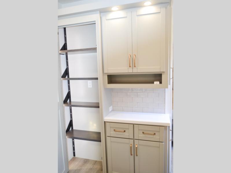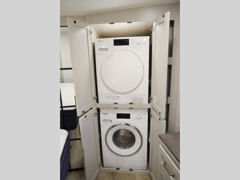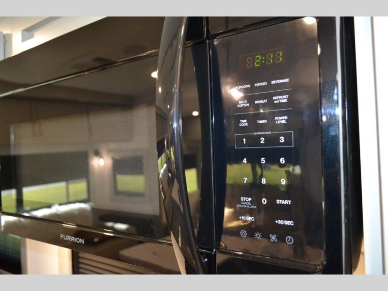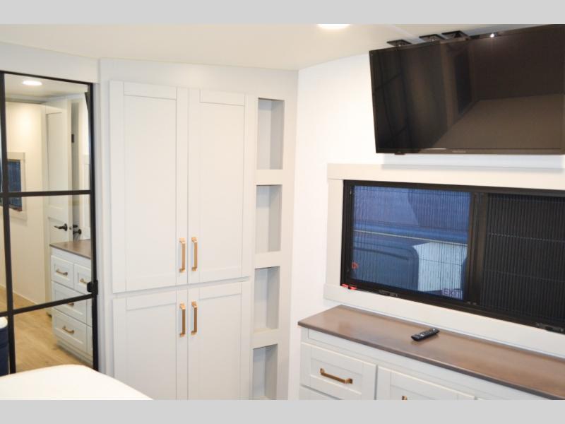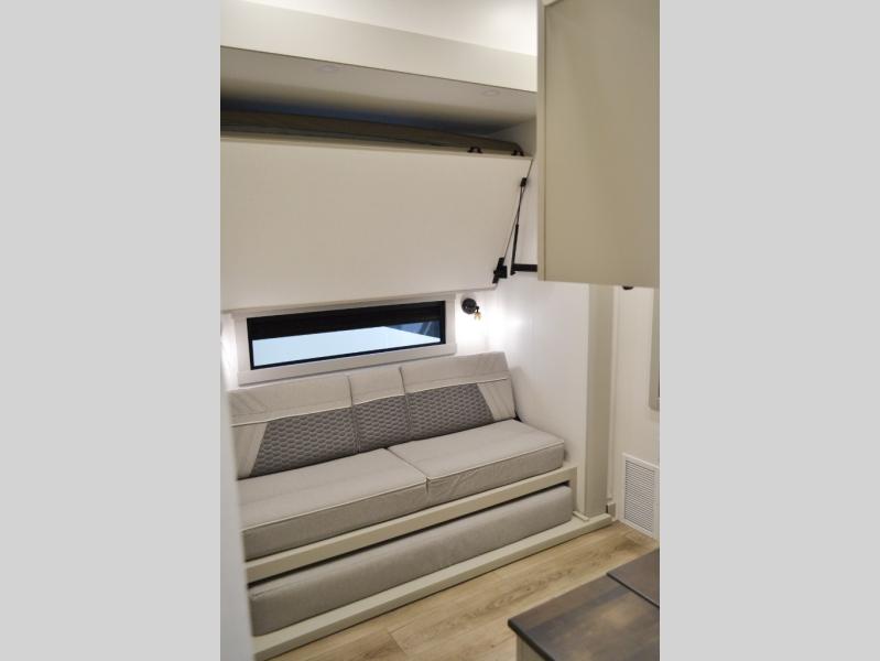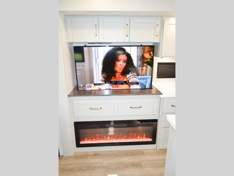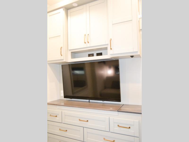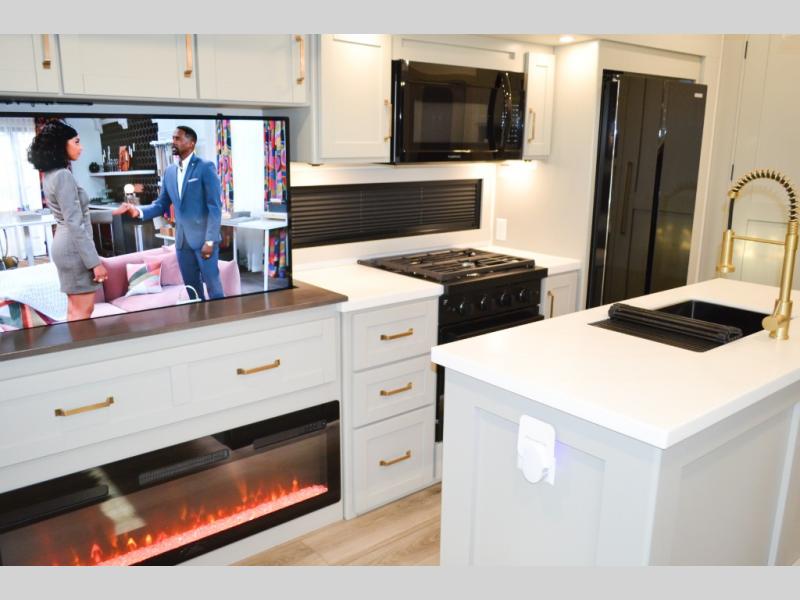 This unit is perfect for your family that needs sleeping space for eight! There is ample seating with a sliding desk/dining table, 62" theater seating, and a 72" tri-fold sofa along the rear wall. You can easily relax and enjoy the telescoping TV with a cozy fireplace below. The kitchen offers all that you need to prepare and cook meals just like home with a 16 cu. ft. refrigerator for your perishables, a 30" residential microwave oven, and three burner range top and oven. You will love the kitchen island all outfitted with pull-out pet bowls and double pull out trash bins with an integrated Stow & Go paper towel holder. There is also an 84" pantry with adjustable shelves for all of your canned and dry goods. Mid-coach, just ahead through the main entry, is a bonus room that can be used as a bedroom featuring a sofa bed with flip-up overhead bunk and trundle below, or an office with pull-out desk so that you can work easily while you travel, or it could also be used as a gaming room since there is also a 50" Smart TV. Head up the steps to a bathroom on your left and a private master suite with king bed slide all the way up front. A sliding dresser top features hidden storage which is perfect for jewelry and other personal belongings. The front wardrobe features mirrored doors and the corner closet has been prepped for a stackable washer and dryer if you choose to add that option.