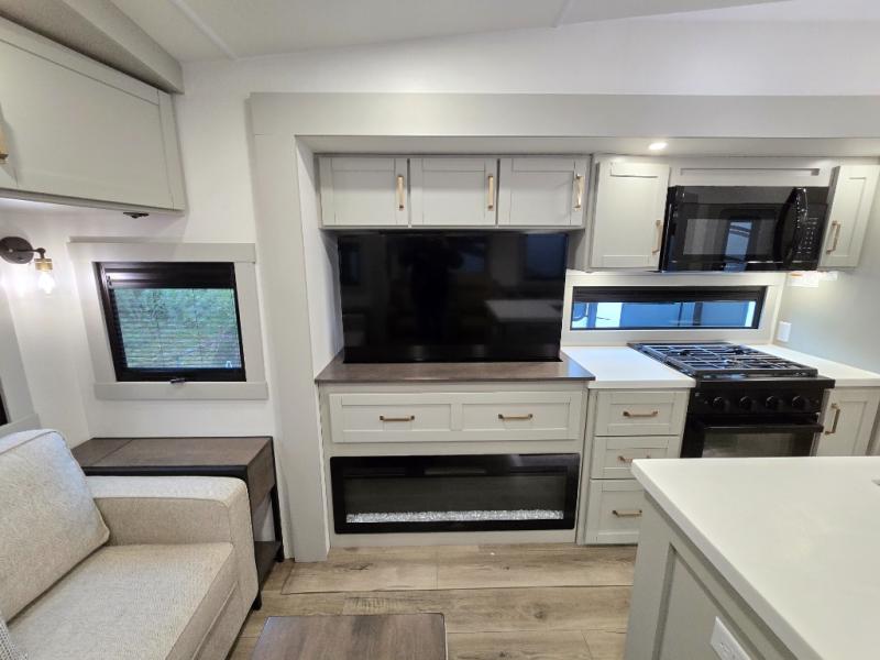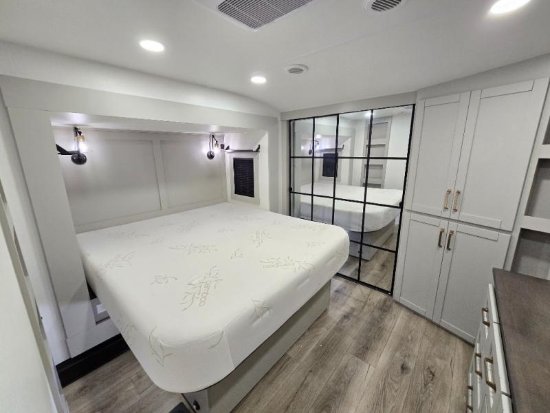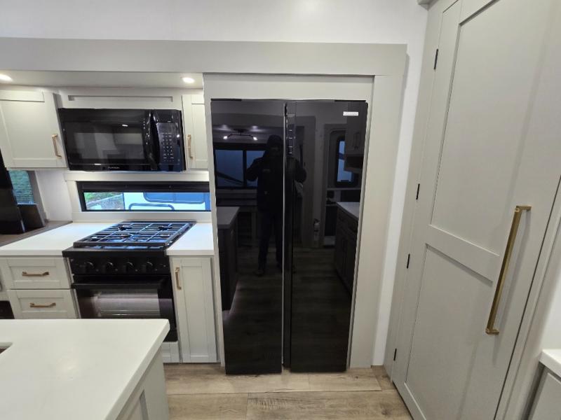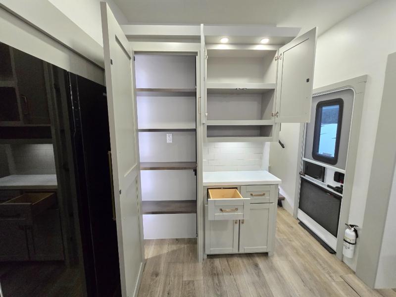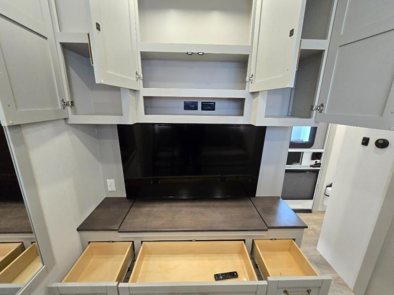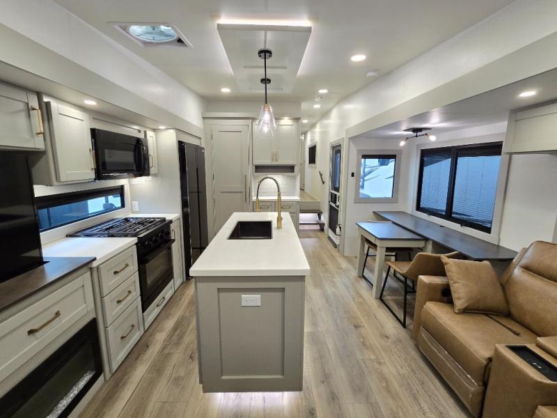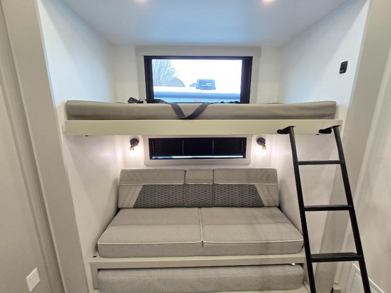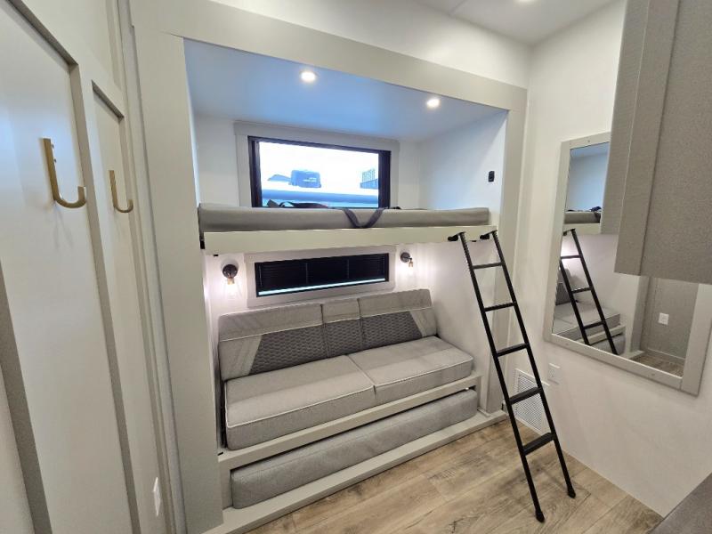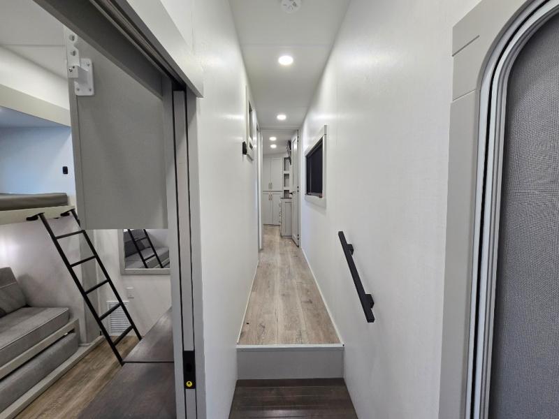 This unit is perfect for your family that needs sleeping space for eight! There is ample seating with a sliding desk/dining table, 62" theater seating, and a 72" tri-fold sofa along the rear wall. You can easily relax and enjoy the telescoping TV with a cozy fireplace below. The kitchen offers all that you need to prepare and cook meals just like home with a 16 cu. ft. refrigerator for your perishables, a 30" residential microwave oven, and three burner range top and oven. You will love the kitchen island all outfitted with pull-out pet bowls and double pull out trash bins with an integrated Stow & Go paper towel holder. There is also an 84" pantry with adjustable shelves for all of your canned and dry goods. Mid-coach, just ahead through the main entry, is a bonus room that can be used as a bedroom featuring a sofa bed with flip-up overhead bunk and trundle below, or an office with pull-out desk so that you can work easily while you travel, or it could also be used as a gaming room since there is also a 50" Smart TV. Head up the steps to a bathroom on your left and a private master suite with king bed slide all the way up front. A sliding dresser top features hidden storage which is perfect for jewelry and other personal belongings. The front wardrobe features mirrored doors and the corner closet has been prepped for a stackable washer and dryer if you choose to add that option.