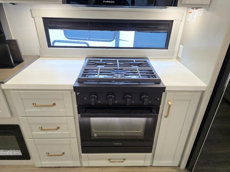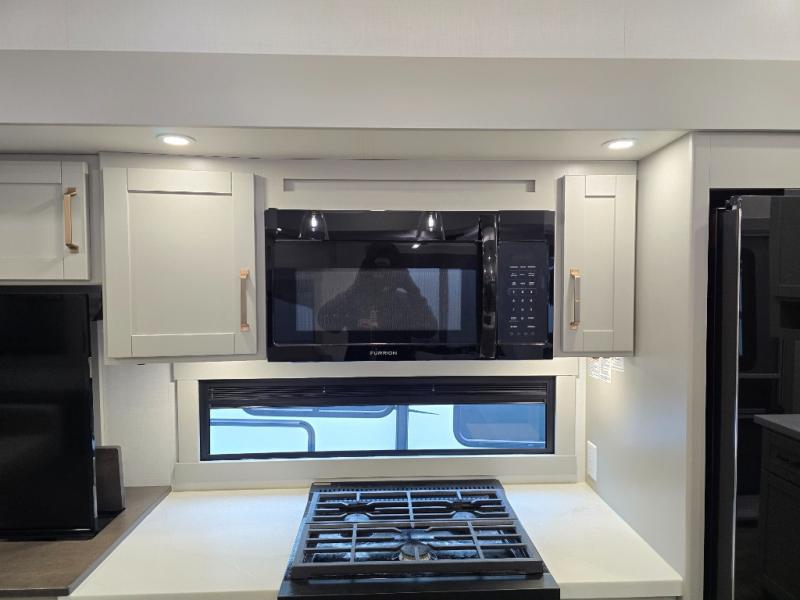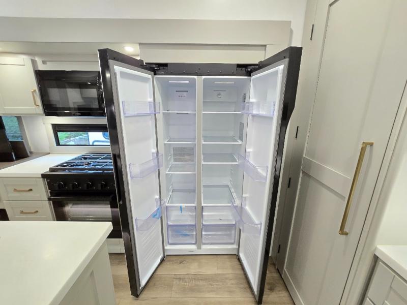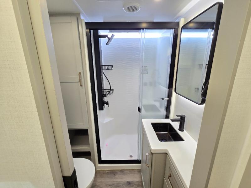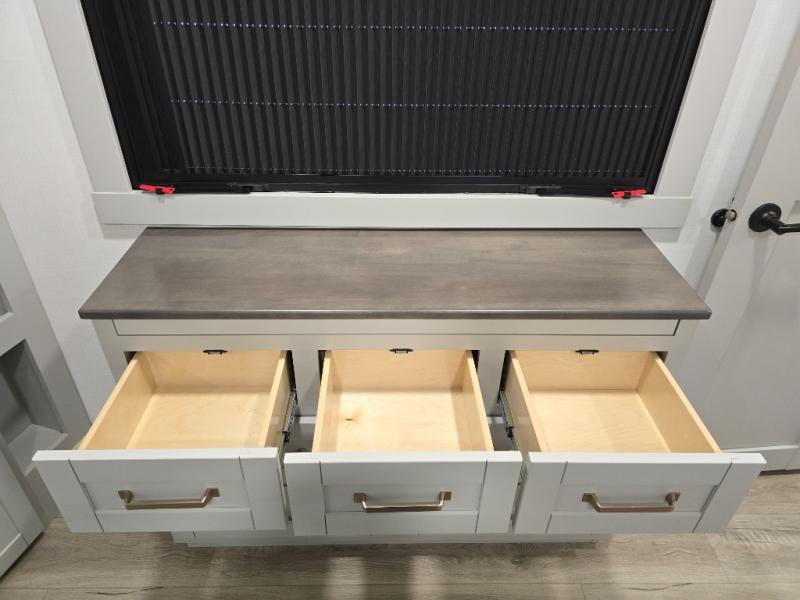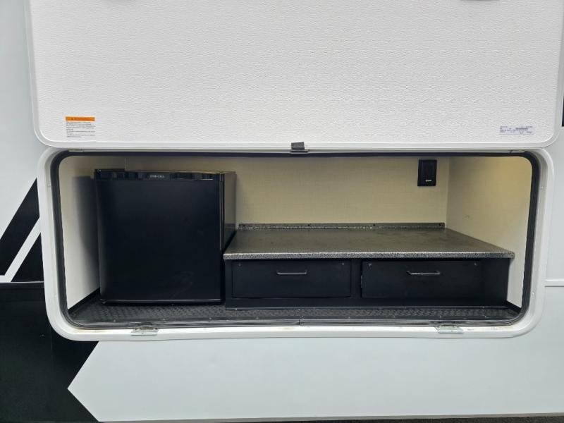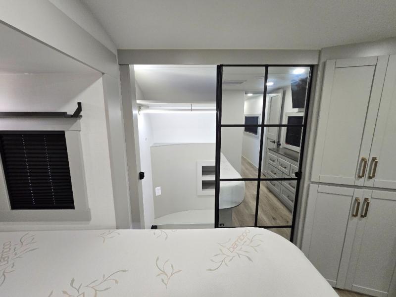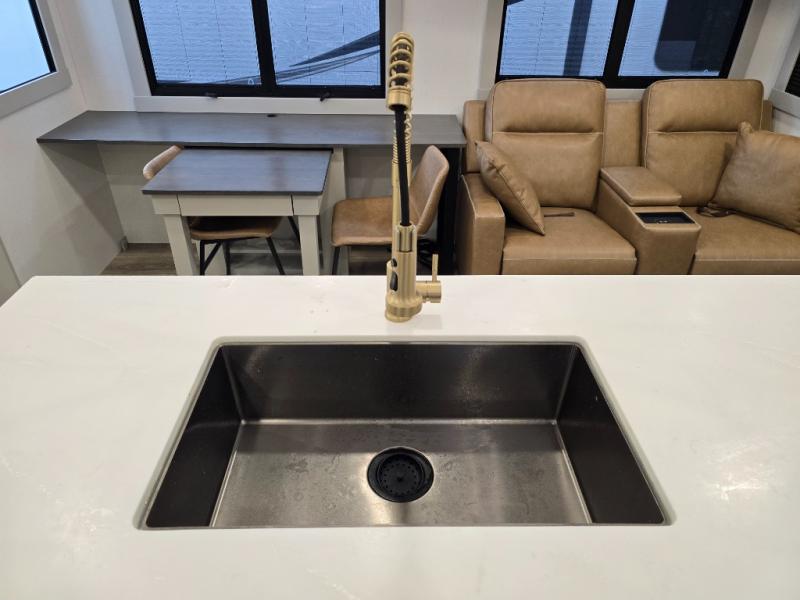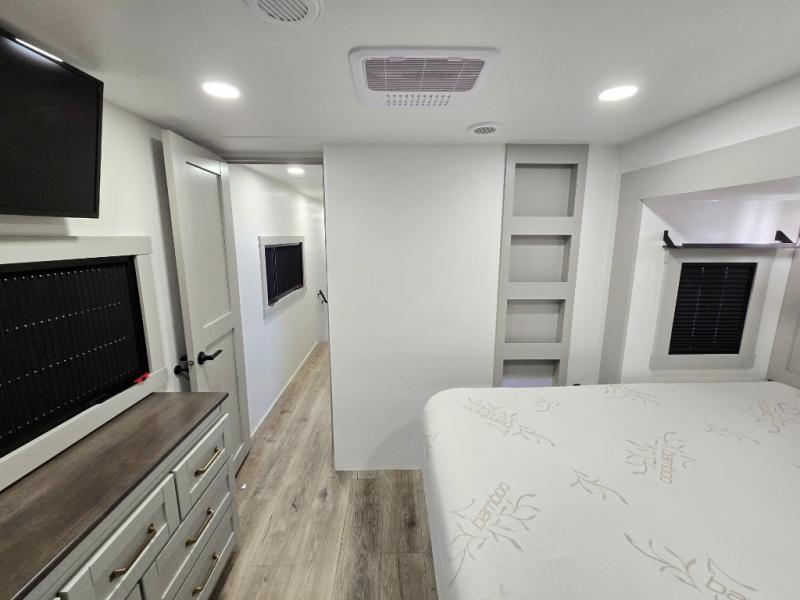 This unit is perfect for your family that needs sleeping space for eight! There is ample seating with a sliding desk/dining table, 62" theater seating, and a 72" tri-fold sofa along the rear wall. You can easily relax and enjoy the telescoping TV with a cozy fireplace below. The kitchen offers all that you need to prepare and cook meals just like home with a 16 cu. ft. refrigerator for your perishables, a 30" residential microwave oven, and three burner range top and oven. You will love the kitchen island all outfitted with pull-out pet bowls and double pull out trash bins with an integrated Stow & Go paper towel holder. There is also an 84" pantry with adjustable shelves for all of your canned and dry goods. Mid-coach, just ahead through the main entry, is a bonus room that can be used as a bedroom featuring a sofa bed with flip-up overhead bunk and trundle below, or an office with pull-out desk so that you can work easily while you travel, or it could also be used as a gaming room since there is also a 50" Smart TV. Head up the steps to a bathroom on your left and a private master suite with king bed slide all the way up front. A sliding dresser top features hidden storage which is perfect for jewelry and other personal belongings. The front wardrobe features mirrored doors and the corner closet has been prepped for a stackable washer and dryer if you choose to add that option.