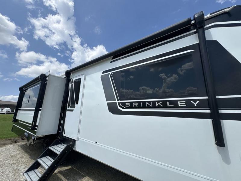 With any Model Z Air travel trailer by Brinkley, you will enjoy premium features at every turn. The industry-first low maintenance roof is sure to be appreciated, plus there are industry-first brass plumbing connections for excellent resistance to corrosion. The drop-frame chassis with over 45 cu. ft. of exterior storage will allow you to bring along camp gear galore, plus there are motion lighting and power outlets for added convenience! You'll also find two hot/cold showers outdoors, along with a 370-watt solar panel, a custom LP box with locked battery storage, and a premium utility center with a retractable 65' water hose to wash off mud from the lake. The interior is just as accommodating with its solid surface countertops, Brinkley CraftSense wood trim construction, integrated window screens and insulated blackout blinds, and the list of luxury features goes on!