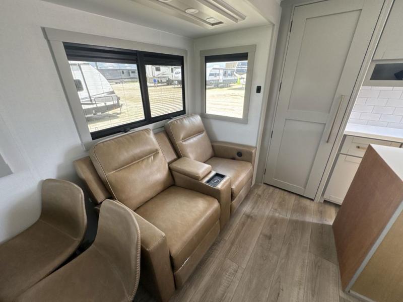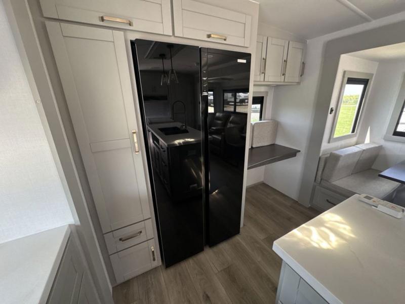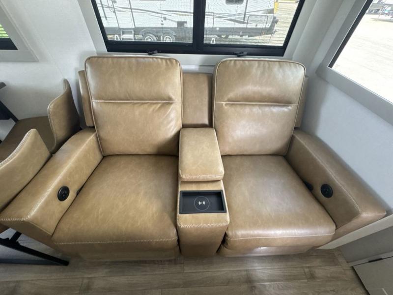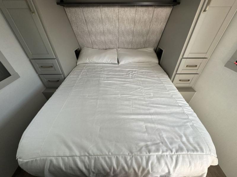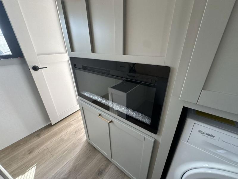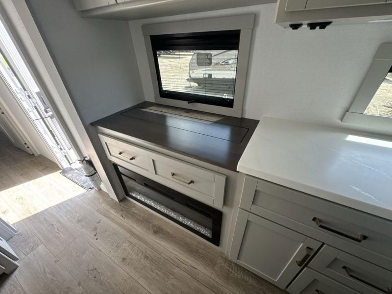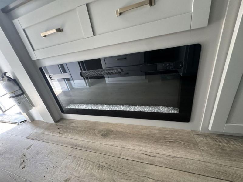 You are going to love every adventure in this cozy coach! In front, a private bedroom awaits you each night providing a comfortable place to get a good night sleep with built-in bedside and under bed storage including outlets and USB ports for your electronics. There are four drawers under the bed, two on each side for more clothing storage. There is also a fireplace in this room as well. A full bath next to the bedroom includes a 30" x 42" one-piece fiberglass shower so you can stay clean and refreshed throughout your trip. The combined kitchen and living area at the rear of the unit will be a favorite place to visit together since there is theater seating and a dinette with bench seat and two chairs. In the slide opposite, you will find a television and fireplace, that makes two fireplaces! You will also enjoy the kitchen island with bar stools, along with additional kitchen counter space, a pantry with adjustable shelves, and a spacious 16 cu. ft. refrigerator that can still open when the slide out is in. Head outside to find a drop-frame pass-thru storage and rear storage, two patio awnings, LED chassis lighting, quad step entry, and more!