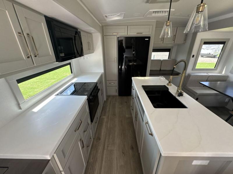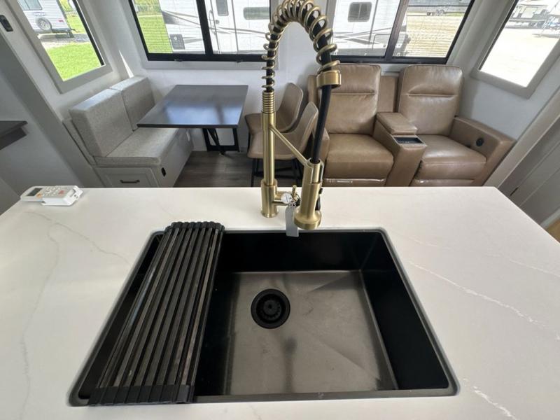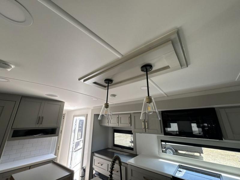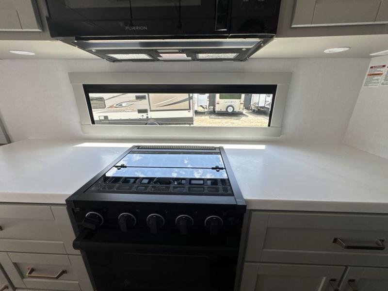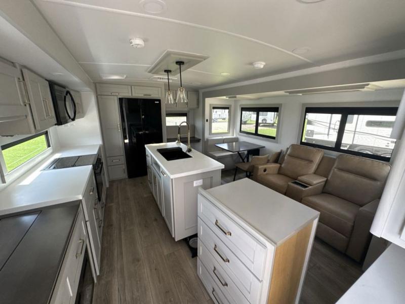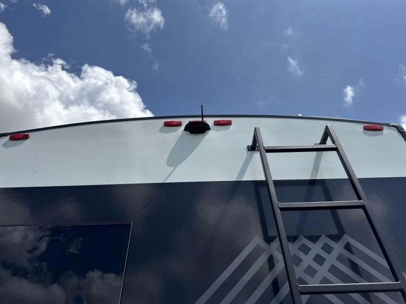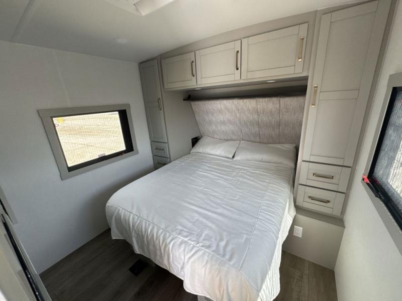 You are going to love every adventure in this cozy coach! In front, a private bedroom awaits you each night providing a comfortable place to get a good night sleep with built-in bedside and under bed storage including outlets and USB ports for your electronics. There are four drawers under the bed, two on each side for more clothing storage. There is also a fireplace in this room as well. A full bath next to the bedroom includes a 30" x 42" one-piece fiberglass shower so you can stay clean and refreshed throughout your trip. The combined kitchen and living area at the rear of the unit will be a favorite place to visit together since there is theater seating and a dinette with bench seat and two chairs. In the slide opposite, you will find a television and fireplace, that makes two fireplaces! You will also enjoy the kitchen island with bar stools, along with additional kitchen counter space, a pantry with adjustable shelves, and a spacious 16 cu. ft. refrigerator that can still open when the slide out is in. Head outside to find a drop-frame pass-thru storage and rear storage, two patio awnings, LED chassis lighting, quad step entry, and more!