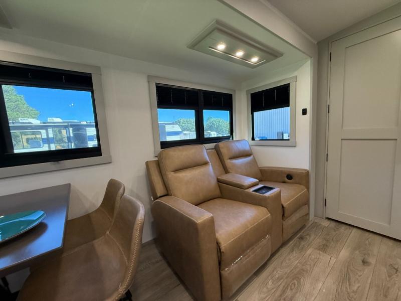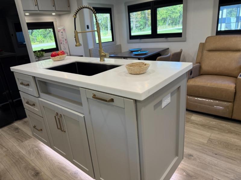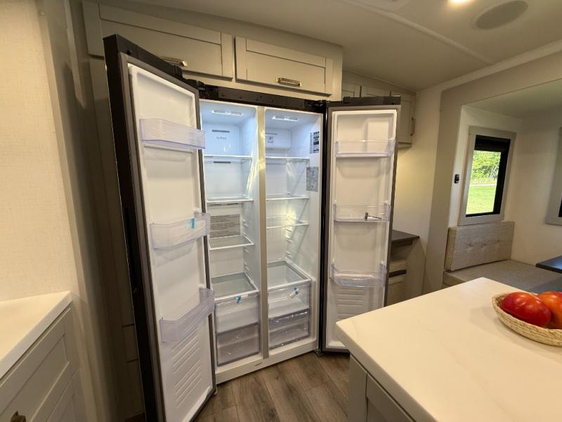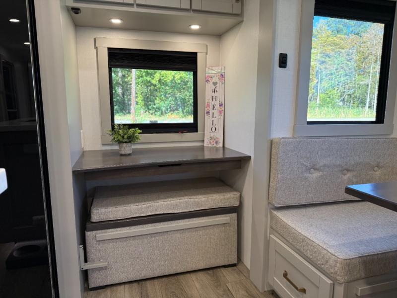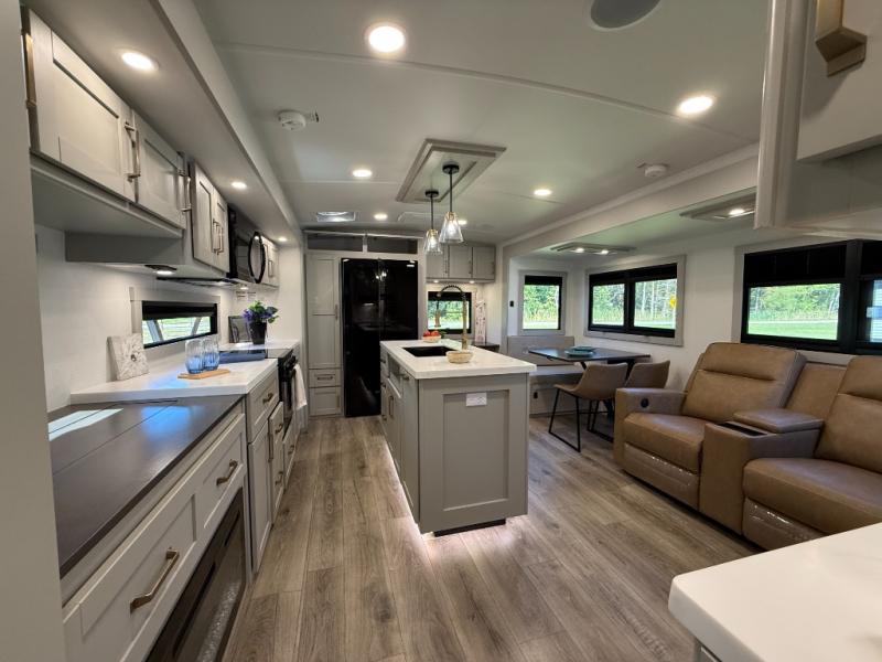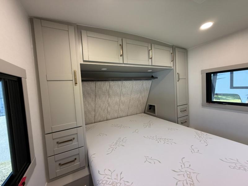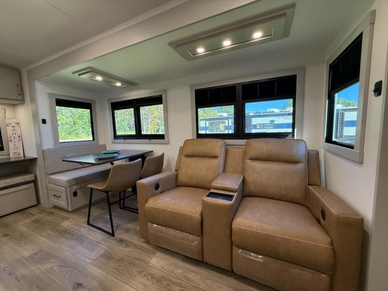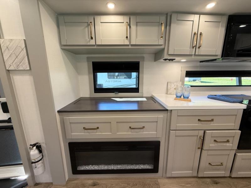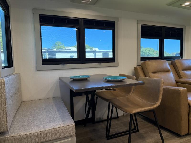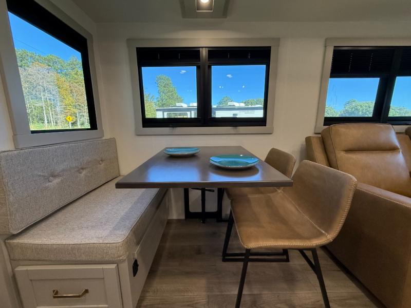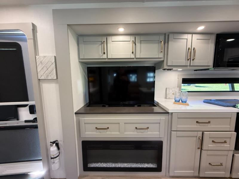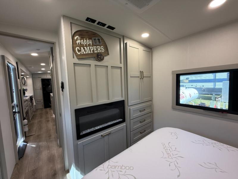 You are going to love every adventure in this cozy coach! In front, a private bedroom awaits you each night providing a comfortable place to get a good night sleep with built-in bedside and under bed storage including outlets and USB ports for your electronics. There are four drawers under the bed, two on each side for more clothing storage. There is also a fireplace in this room as well. A full bath next to the bedroom includes a 30" x 42" one-piece fiberglass shower so you can stay clean and refreshed throughout your trip. The combined kitchen and living area at the rear of the unit will be a favorite place to visit together since there is theater seating and a dinette with bench seat and two chairs. In the slide opposite, you will find a television and fireplace, that makes two fireplaces! You will also enjoy the kitchen island with bar stools, along with additional kitchen counter space, a pantry with adjustable shelves, and a spacious 16 cu. ft. refrigerator that can still open when the slide out is in. Head outside to find a drop-frame pass-thru storage and rear storage, two patio awnings, LED chassis lighting, quad step entry, and more!