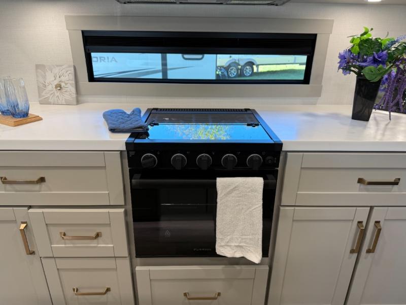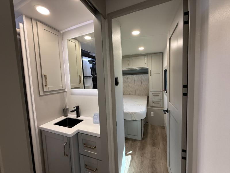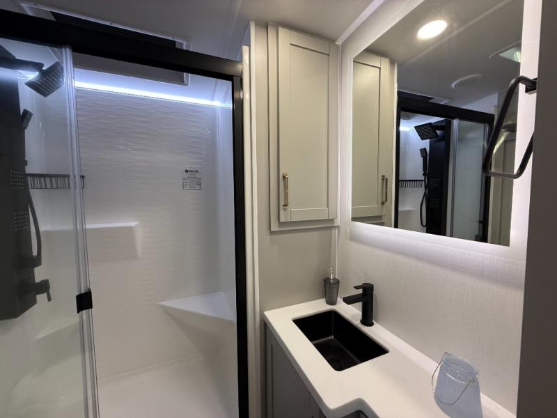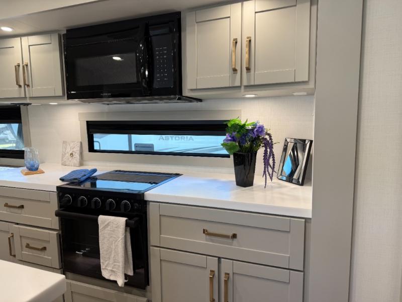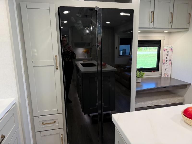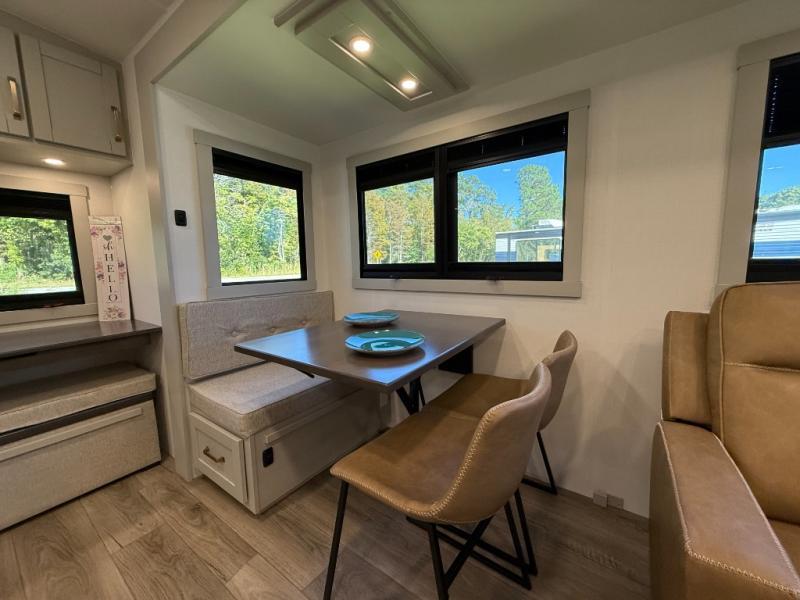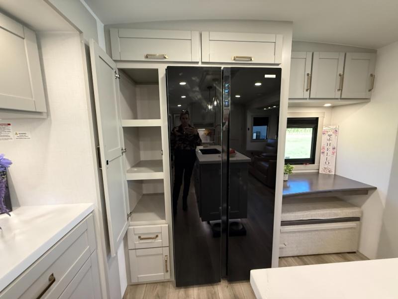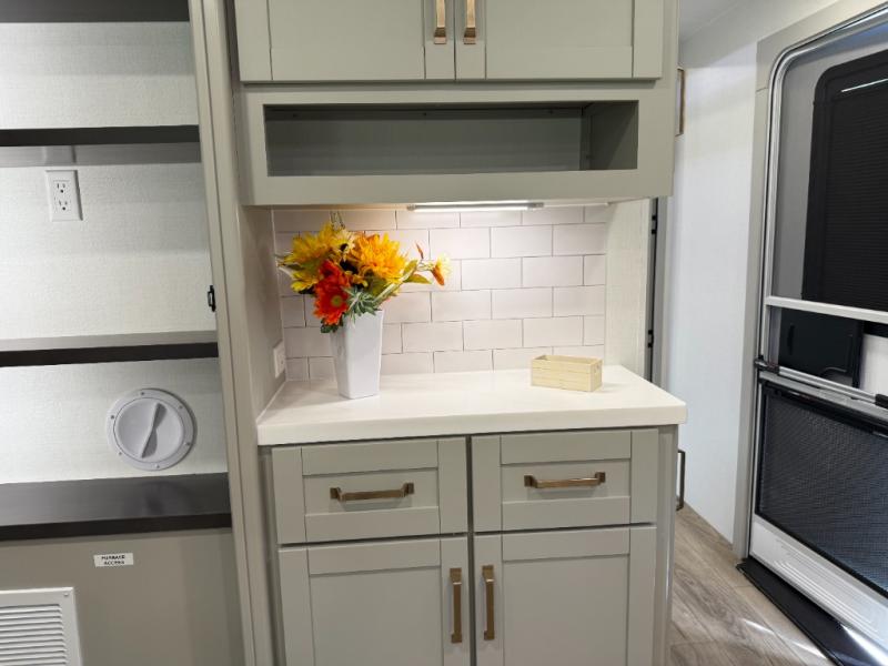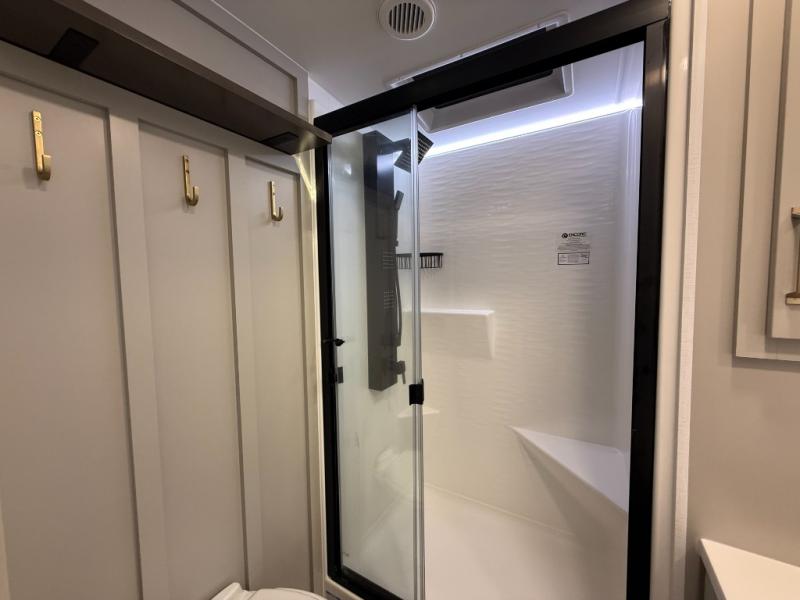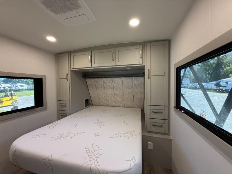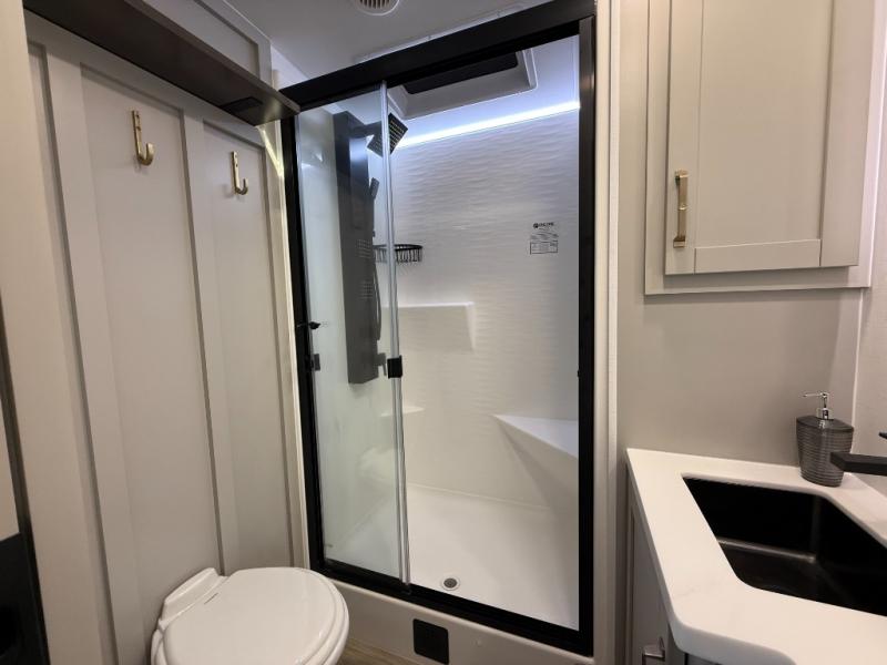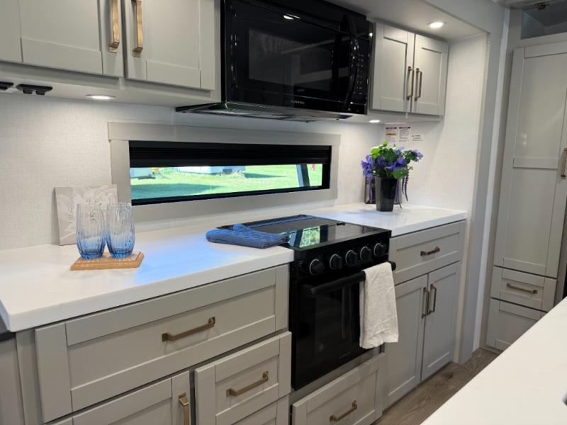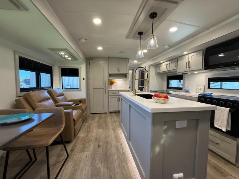 You are going to love every adventure in this cozy coach! In front, a private bedroom awaits you each night providing a comfortable place to get a good night sleep with built-in bedside and under bed storage including outlets and USB ports for your electronics. There are four drawers under the bed, two on each side for more clothing storage. There is also a fireplace in this room as well. A full bath next to the bedroom includes a 30" x 42" one-piece fiberglass shower so you can stay clean and refreshed throughout your trip. The combined kitchen and living area at the rear of the unit will be a favorite place to visit together since there is theater seating and a dinette with bench seat and two chairs. In the slide opposite, you will find a television and fireplace, that makes two fireplaces! You will also enjoy the kitchen island with bar stools, along with additional kitchen counter space, a pantry with adjustable shelves, and a spacious 16 cu. ft. refrigerator that can still open when the slide out is in. Head outside to find a drop-frame pass-thru storage and rear storage, two patio awnings, LED chassis lighting, quad step entry, and more!