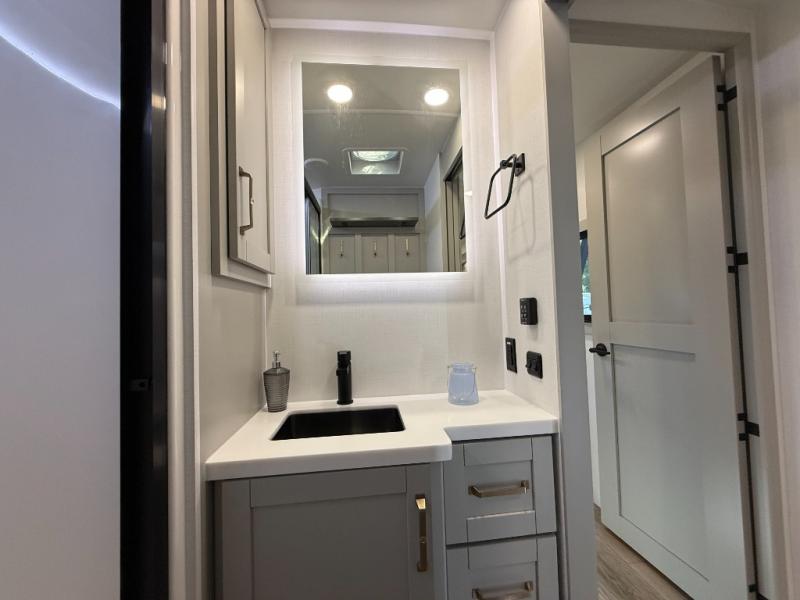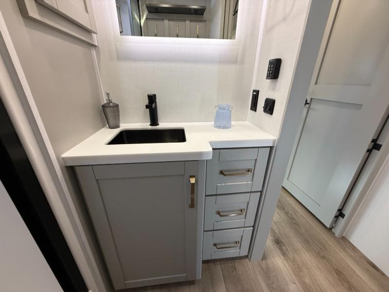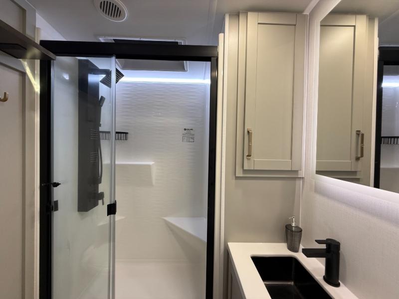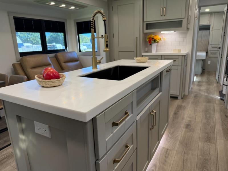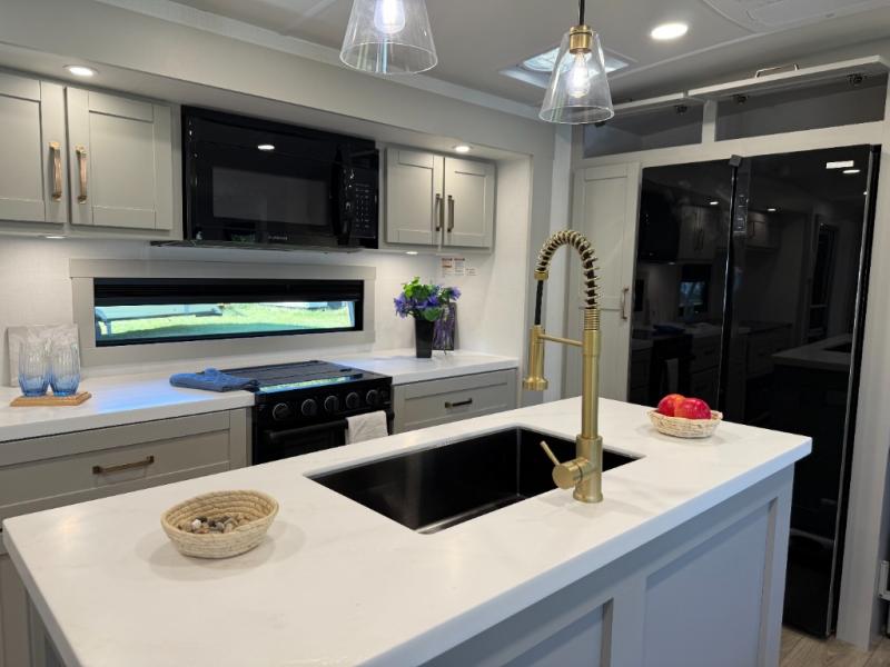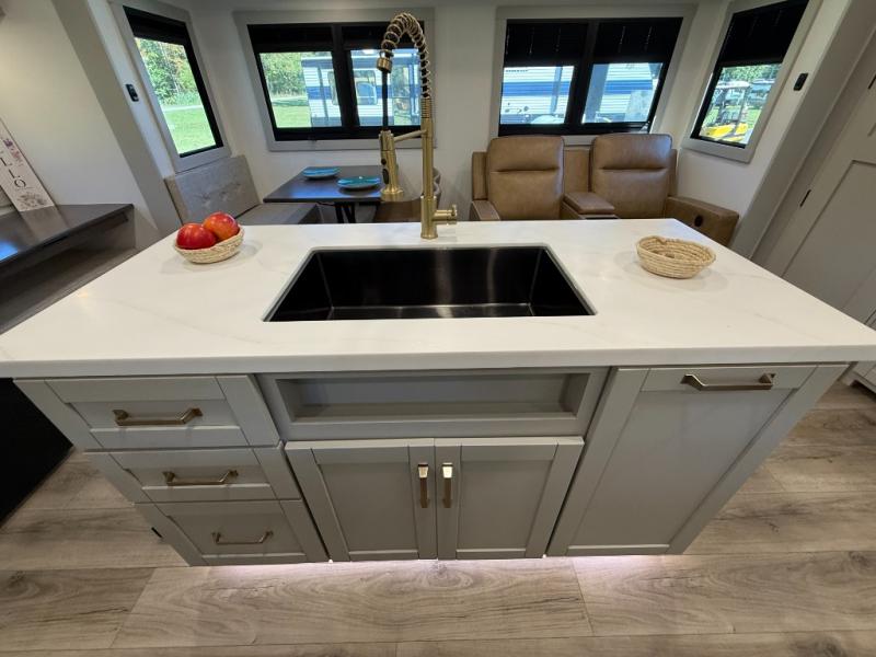 With any Model Z Air travel trailer by Brinkley, you will enjoy premium features at every turn. The industry-first low maintenance roof is sure to be appreciated, plus there are industry-first brass plumbing connections for excellent resistance to corrosion. The drop-frame chassis with over 45 cu. ft. of exterior storage will allow you to bring along camp gear galore, plus there are motion lighting and power outlets for added convenience! You'll also find two hot/cold showers outdoors, along with a 370-watt solar panel, a custom LP box with locked battery storage, and a premium utility center with a retractable 65' water hose to wash off mud from the lake. The interior is just as accommodating with its solid surface countertops, Brinkley CraftSense wood trim construction, integrated window screens and insulated blackout blinds, and the list of luxury features goes on!