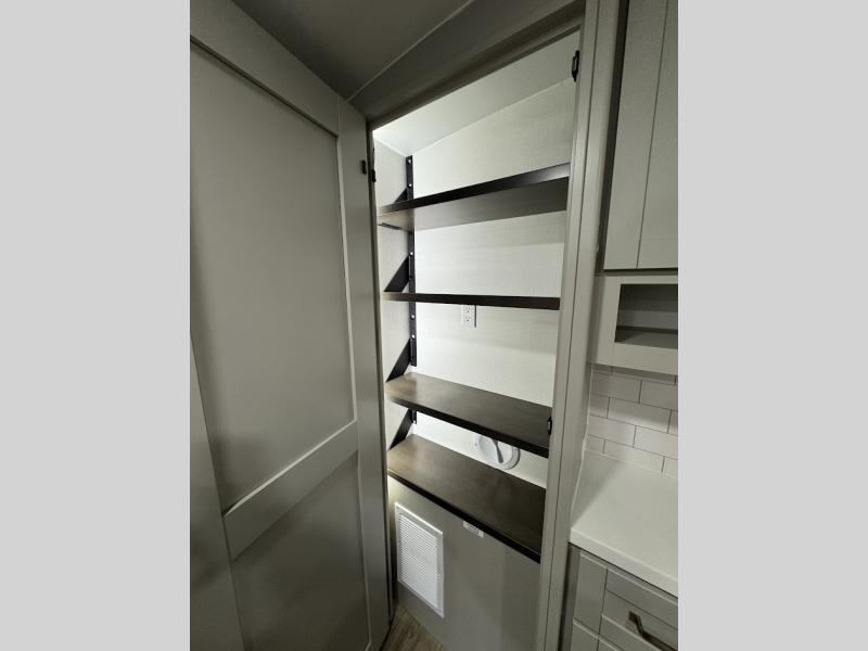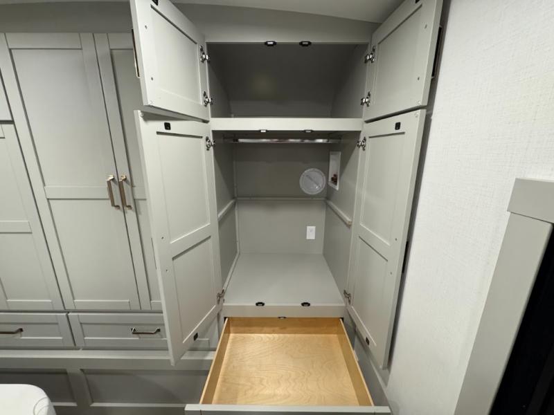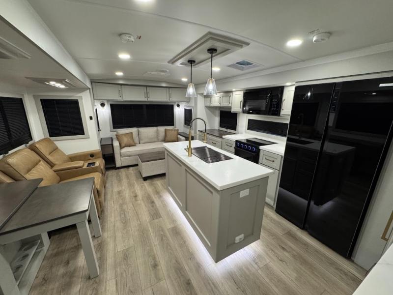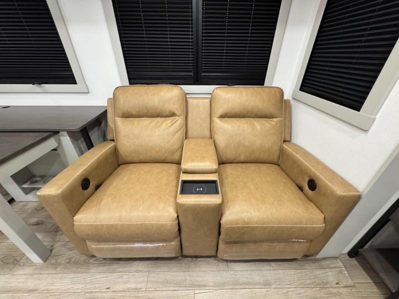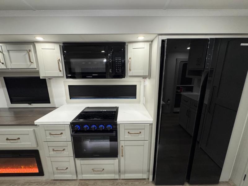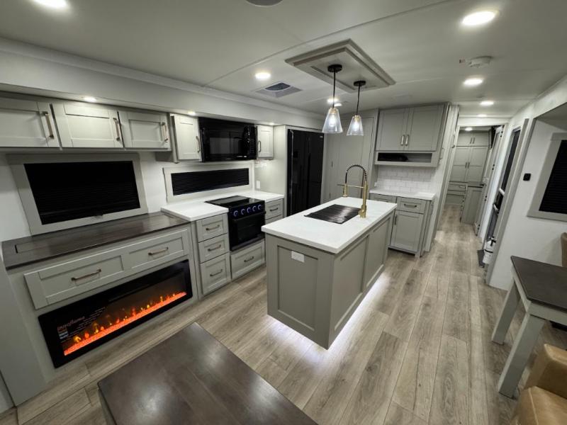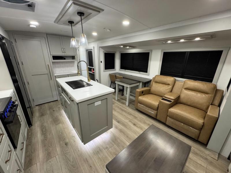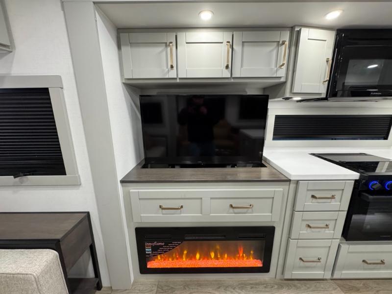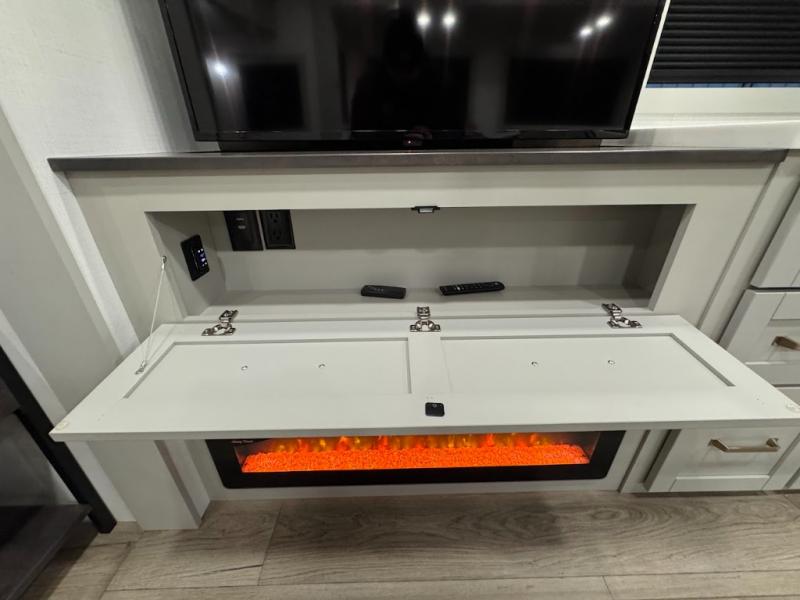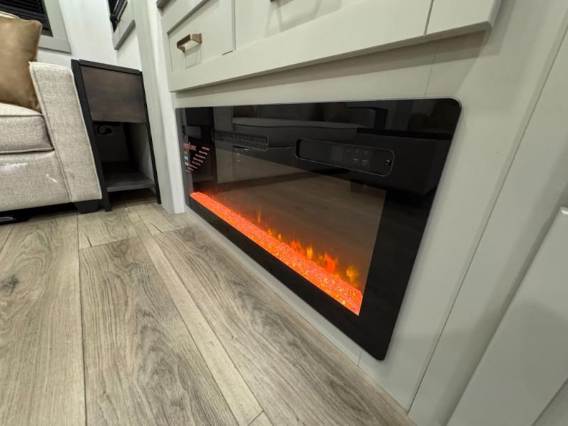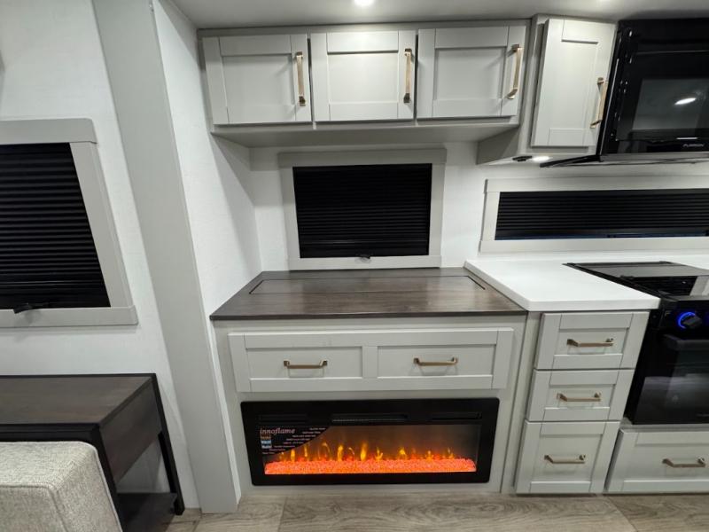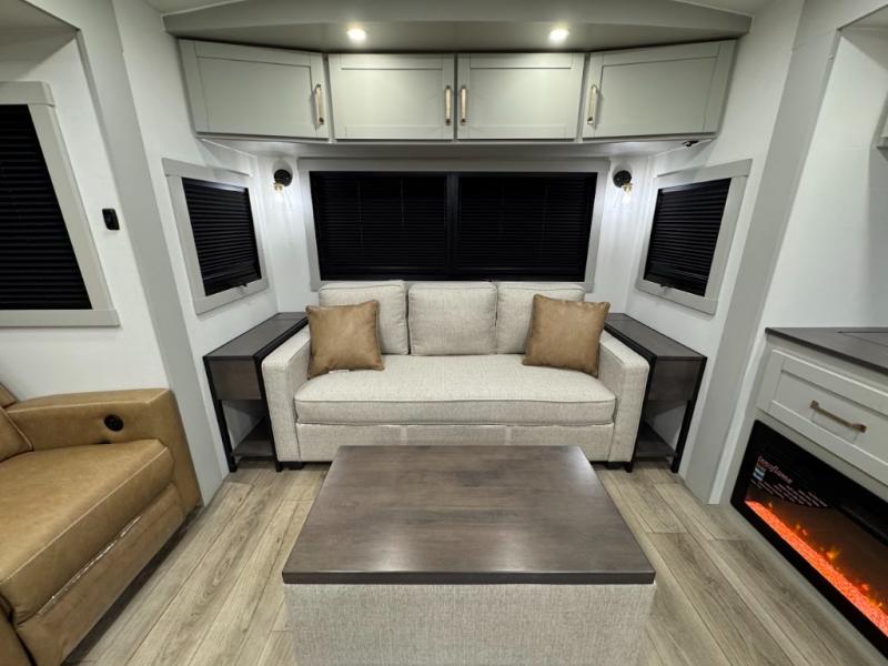 You will love all the space and features in this travel trailer! A luxurious rear living room offers plenty of room to spread out, with a 72" tri-fold sofa plus theater seats, all arranged with a perfect view of the 50" TV over the fireplace. A central kitchen area includes an island with hidden pet bowls. Find even more storage with the hutch plus pantry with adjustable shelves. The front bedroom comes with a queen bed, but if you'd like you can upgrade to a king for even more room. No matter which you choose, you will enjoy watching the 32" bedroom TV. The full-width wardrobe has room for all of your clothes and also includes prep for an optional washer and dryer. And the full bath includes a 30" x 42" one-piece fiberglass shower. Outside you'll enjoy two awnings, pass-through storage, and LED chassis lighting.