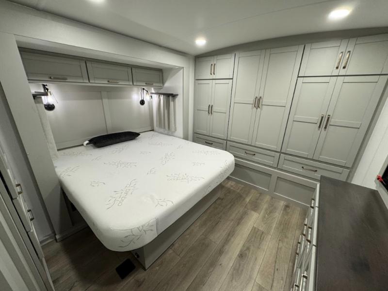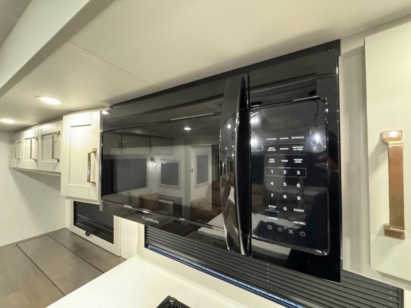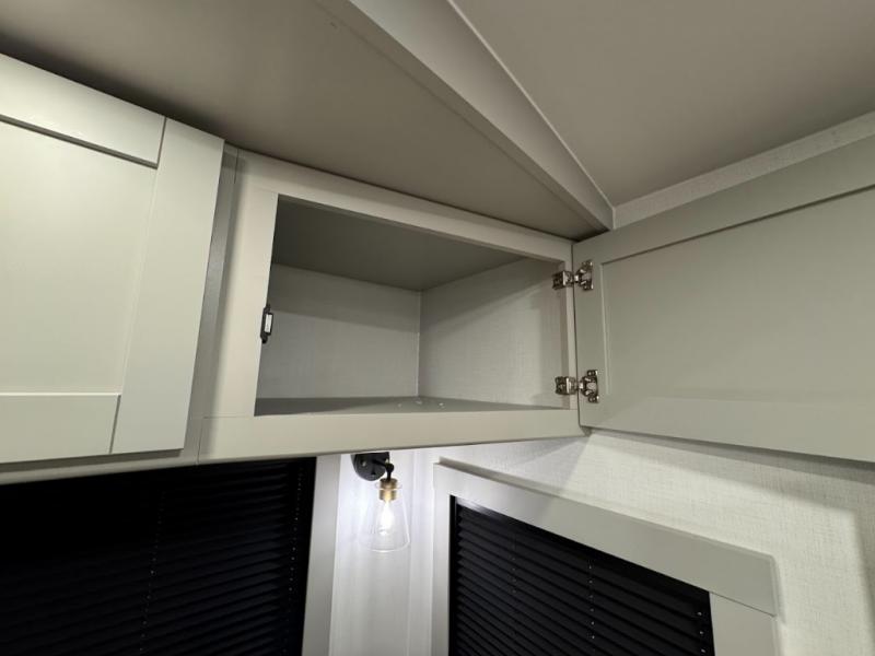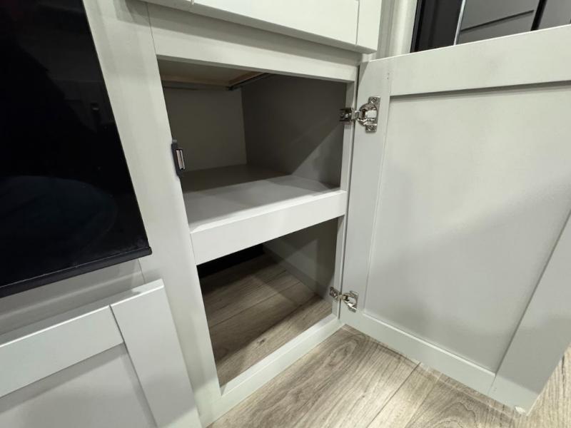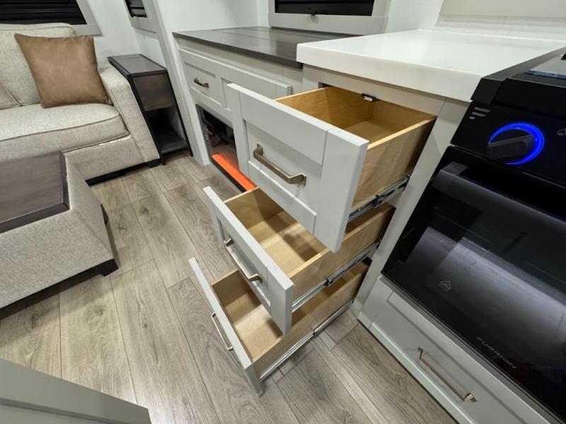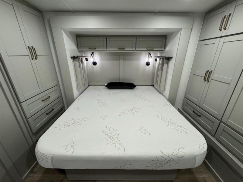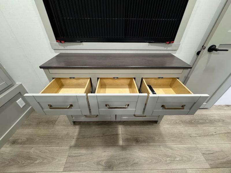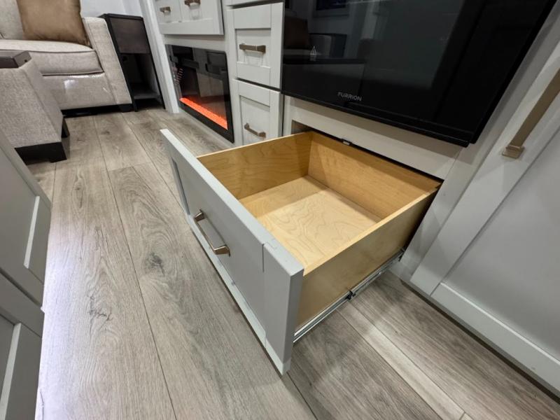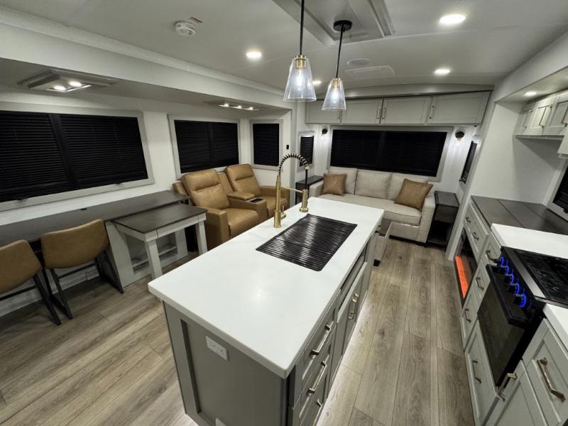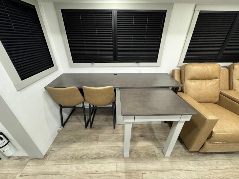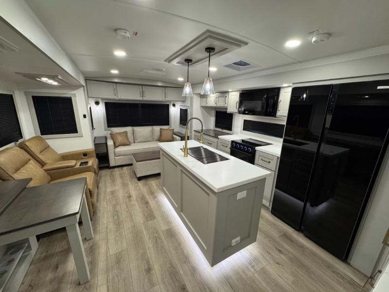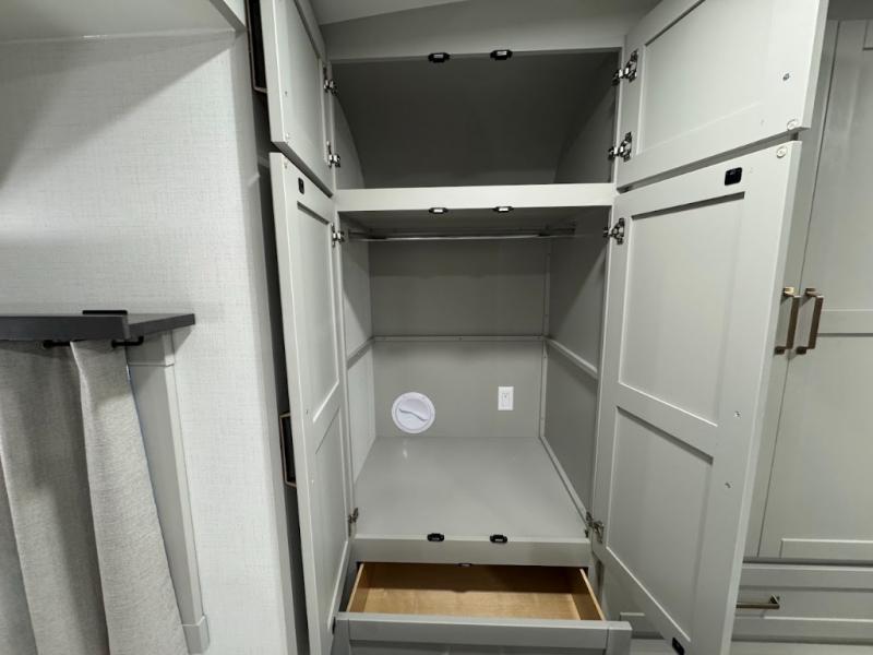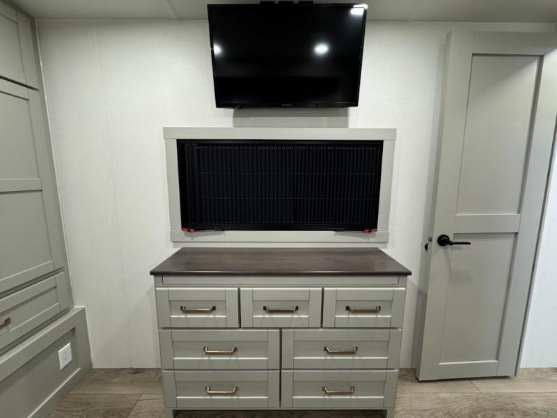 You will love all the space and features in this travel trailer! A luxurious rear living room offers plenty of room to spread out, with a 72" tri-fold sofa plus theater seats, all arranged with a perfect view of the 50" TV over the fireplace. A central kitchen area includes an island with hidden pet bowls. Find even more storage with the hutch plus pantry with adjustable shelves. The front bedroom comes with a queen bed, but if you'd like you can upgrade to a king for even more room. No matter which you choose, you will enjoy watching the 32" bedroom TV. The full-width wardrobe has room for all of your clothes and also includes prep for an optional washer and dryer. And the full bath includes a 30" x 42" one-piece fiberglass shower. Outside you'll enjoy two awnings, pass-through storage, and LED chassis lighting.