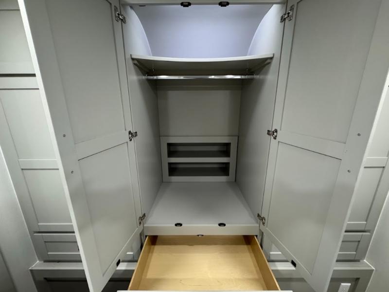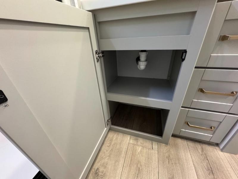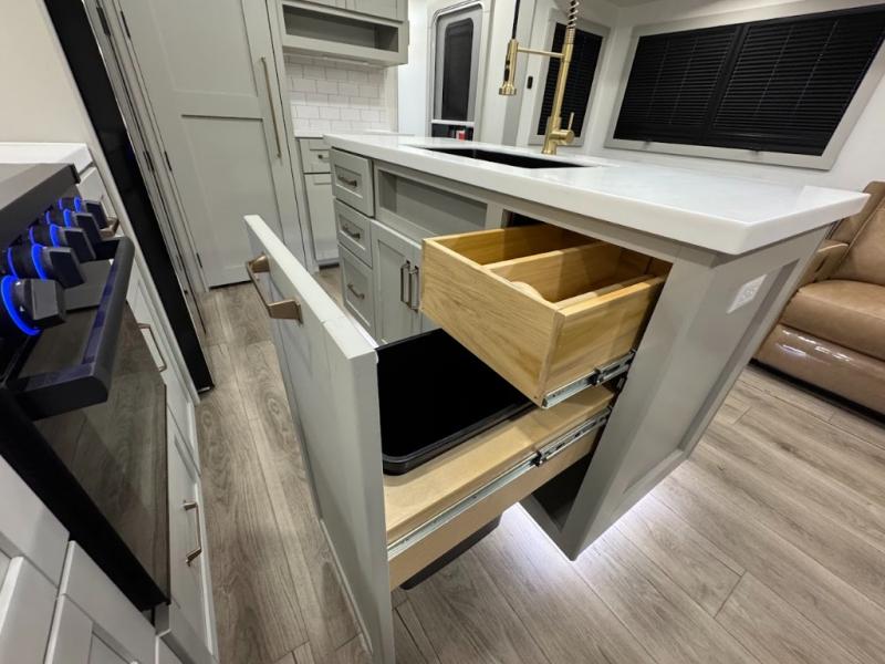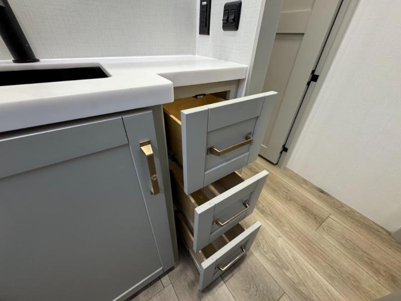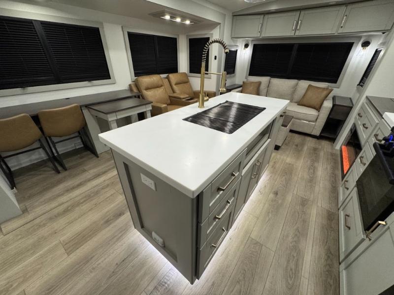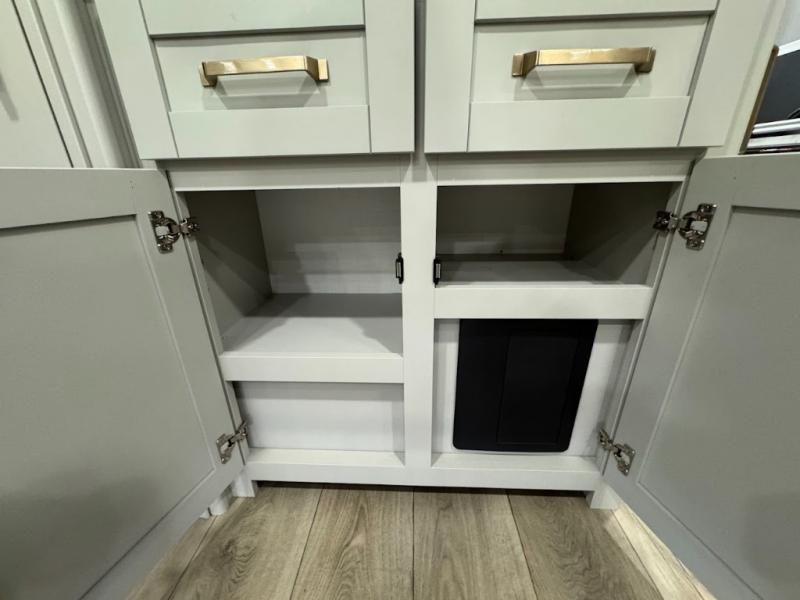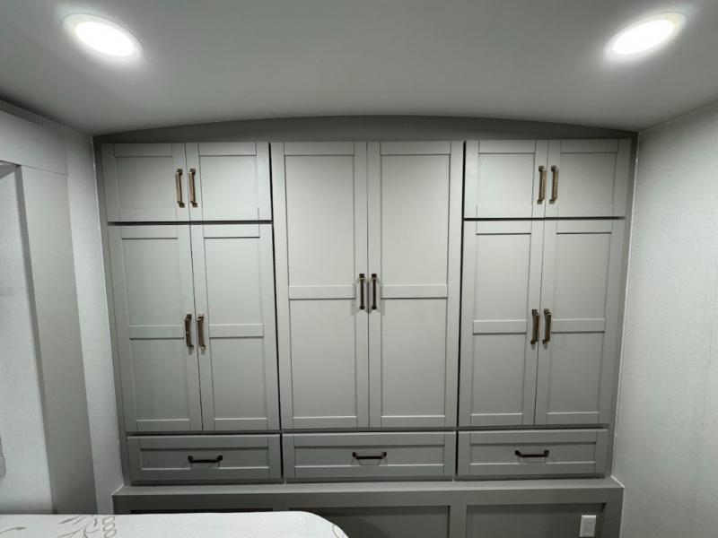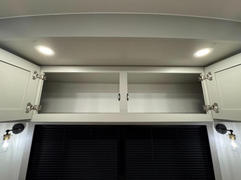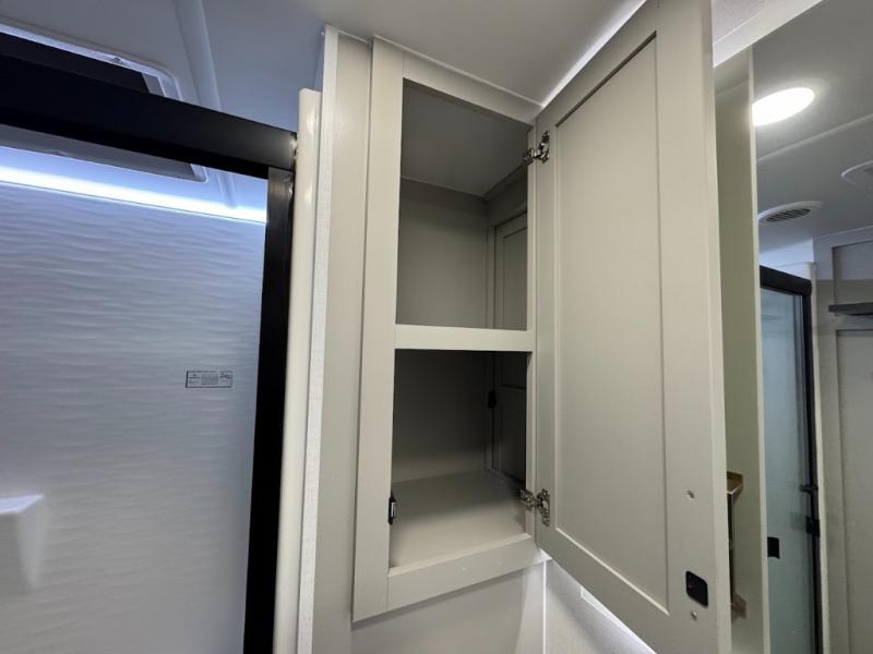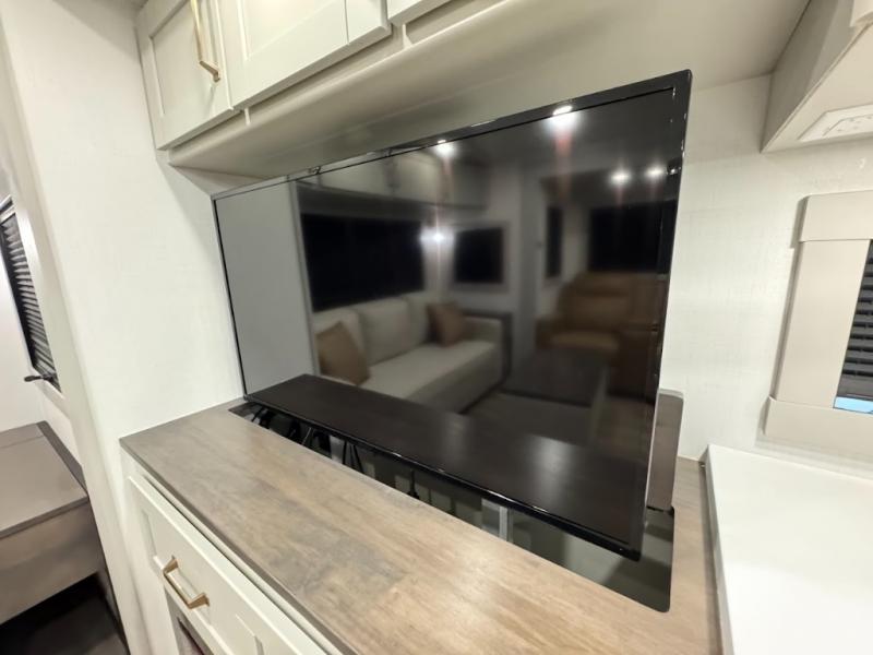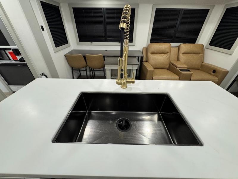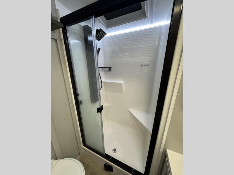 You will love all the space and features in this travel trailer! A luxurious rear living room offers plenty of room to spread out, with a 72" tri-fold sofa plus theater seats, all arranged with a perfect view of the 50" TV over the fireplace. A central kitchen area includes an island with hidden pet bowls. Find even more storage with the hutch plus pantry with adjustable shelves. The front bedroom comes with a queen bed, but if you'd like you can upgrade to a king for even more room. No matter which you choose, you will enjoy watching the 32" bedroom TV. The full-width wardrobe has room for all of your clothes and also includes prep for an optional washer and dryer. And the full bath includes a 30" x 42" one-piece fiberglass shower. Outside you'll enjoy two awnings, pass-through storage, and LED chassis lighting.