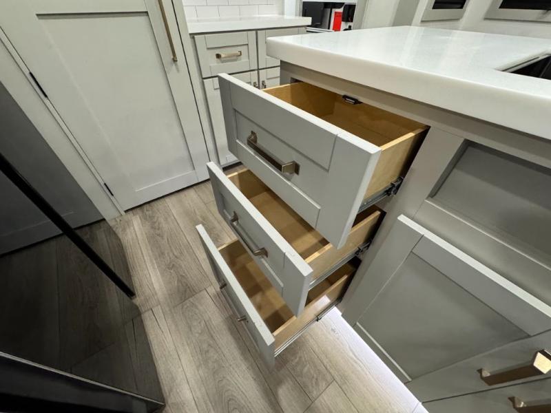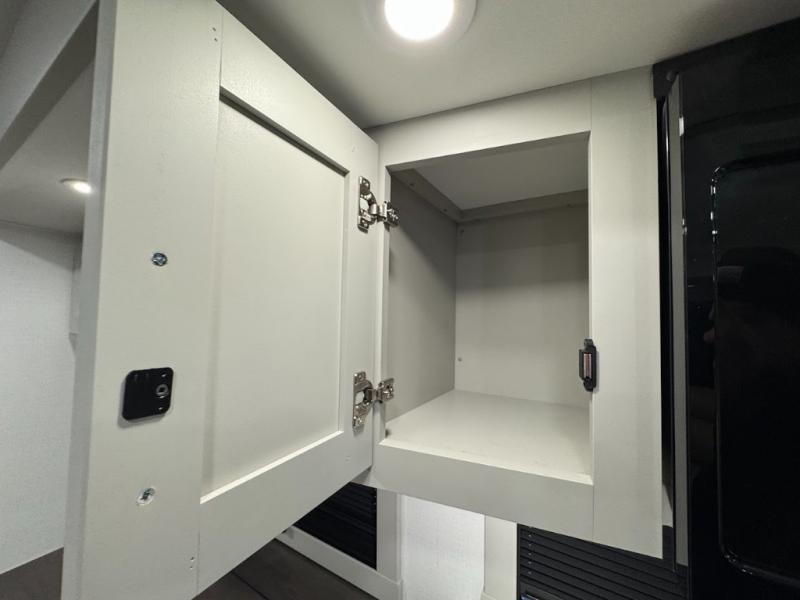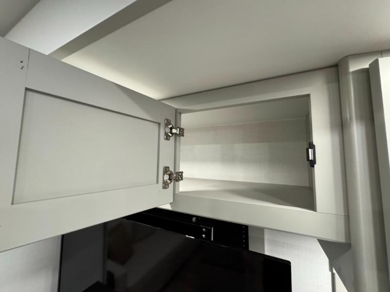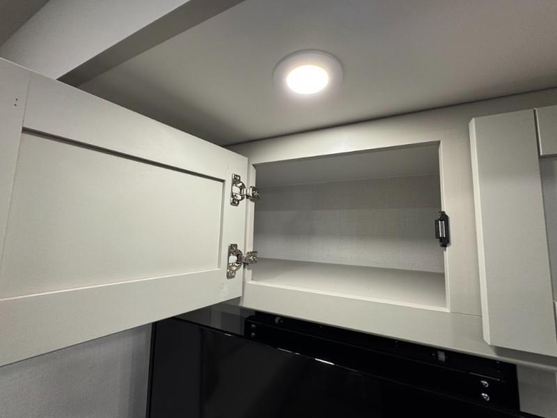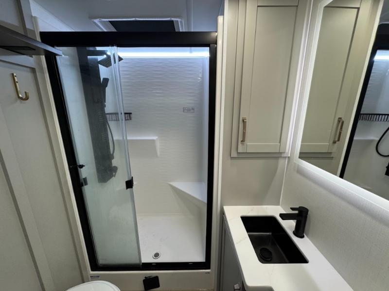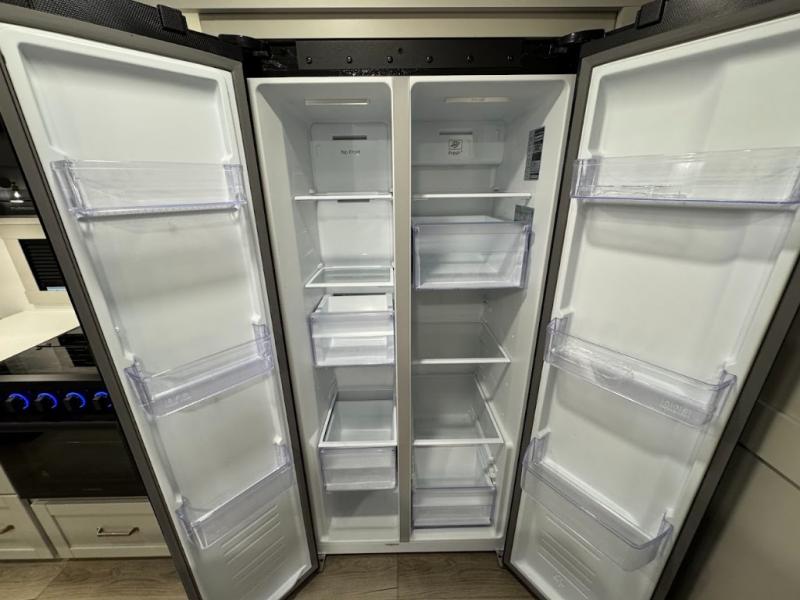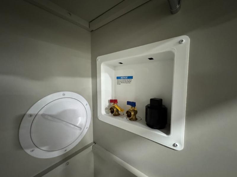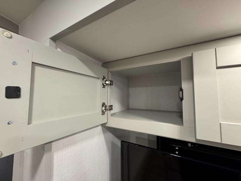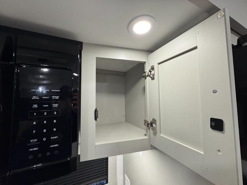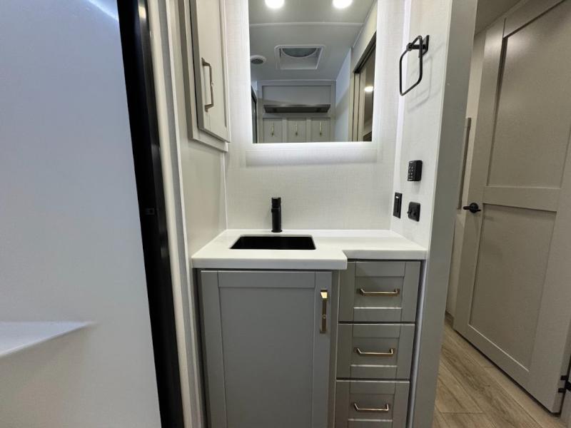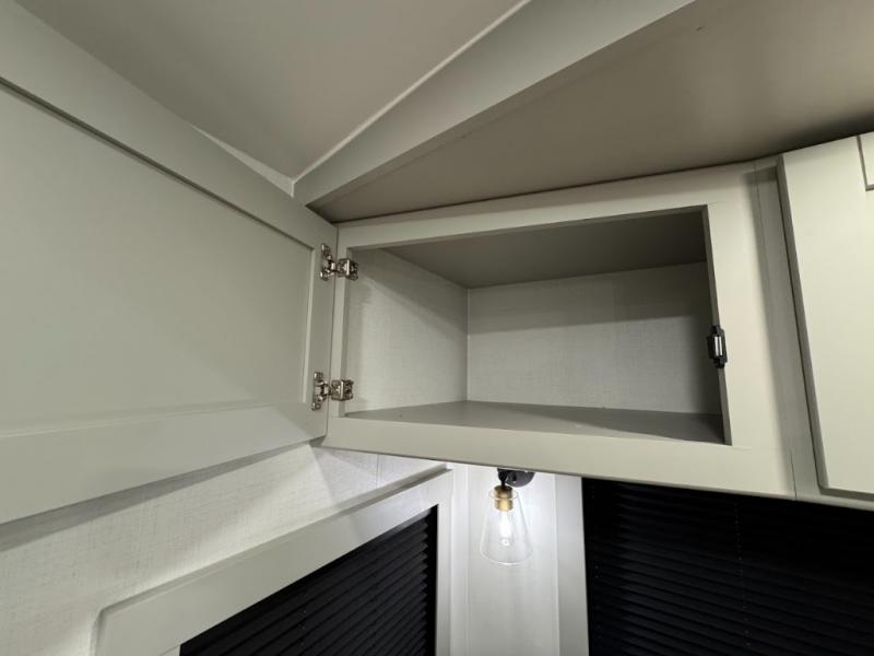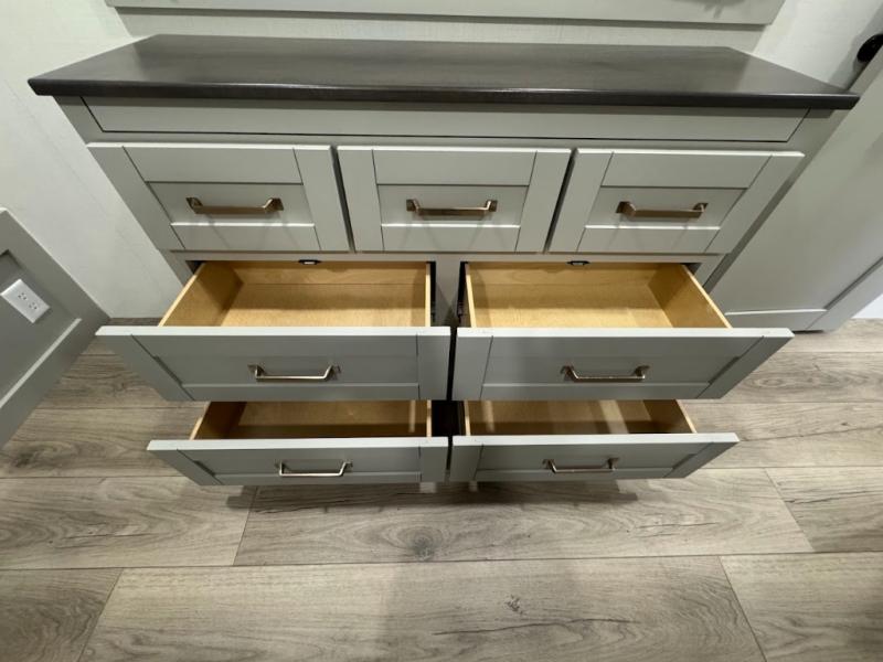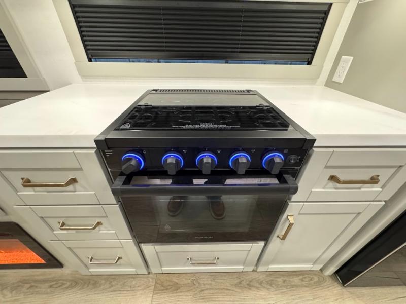 You will love all the space and features in this travel trailer! A luxurious rear living room offers plenty of room to spread out, with a 72" tri-fold sofa plus theater seats, all arranged with a perfect view of the 50" TV over the fireplace. A central kitchen area includes an island with hidden pet bowls. Find even more storage with the hutch plus pantry with adjustable shelves. The front bedroom comes with a queen bed, but if you'd like you can upgrade to a king for even more room. No matter which you choose, you will enjoy watching the 32" bedroom TV. The full-width wardrobe has room for all of your clothes and also includes prep for an optional washer and dryer. And the full bath includes a 30" x 42" one-piece fiberglass shower. Outside you'll enjoy two awnings, pass-through storage, and LED chassis lighting.