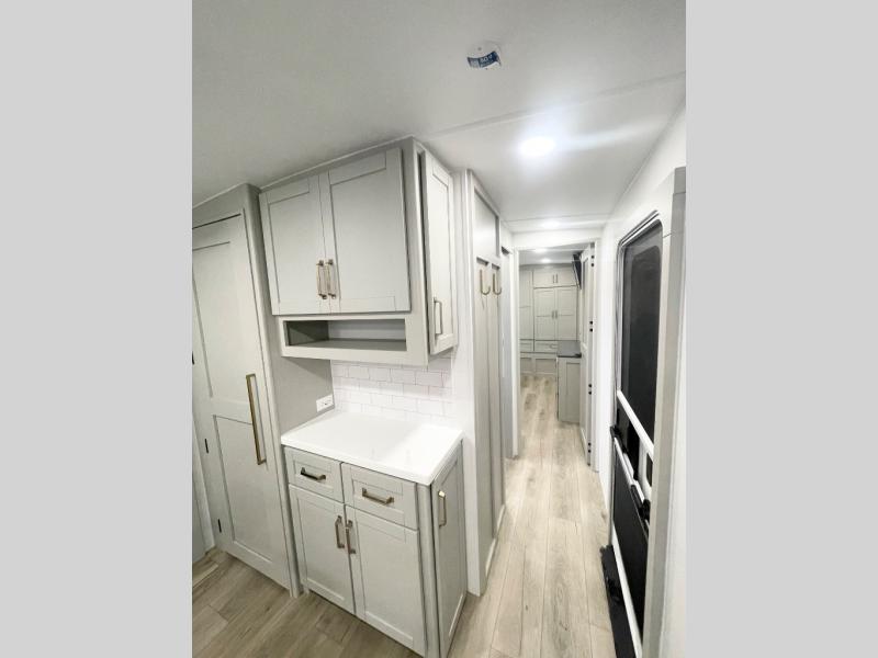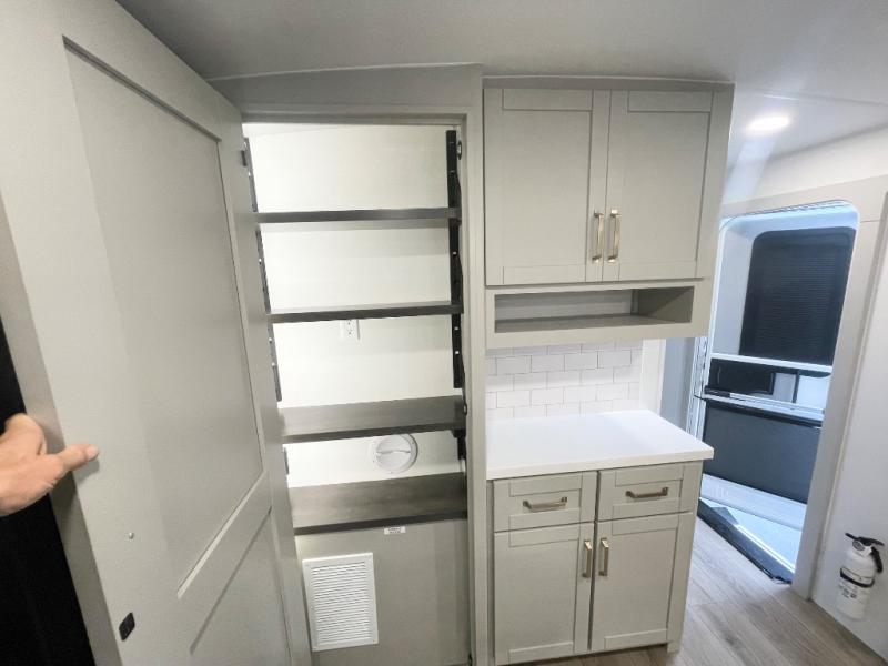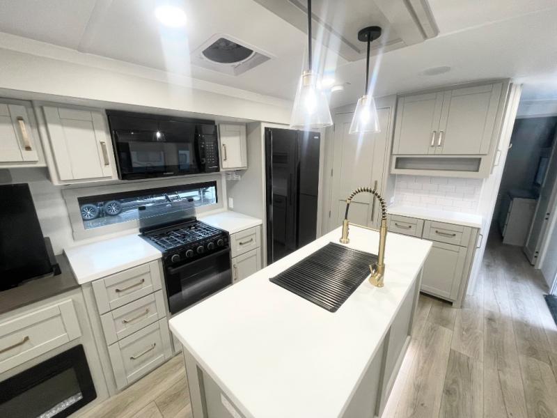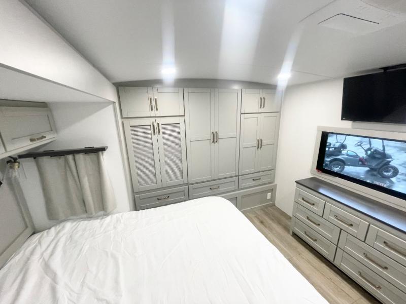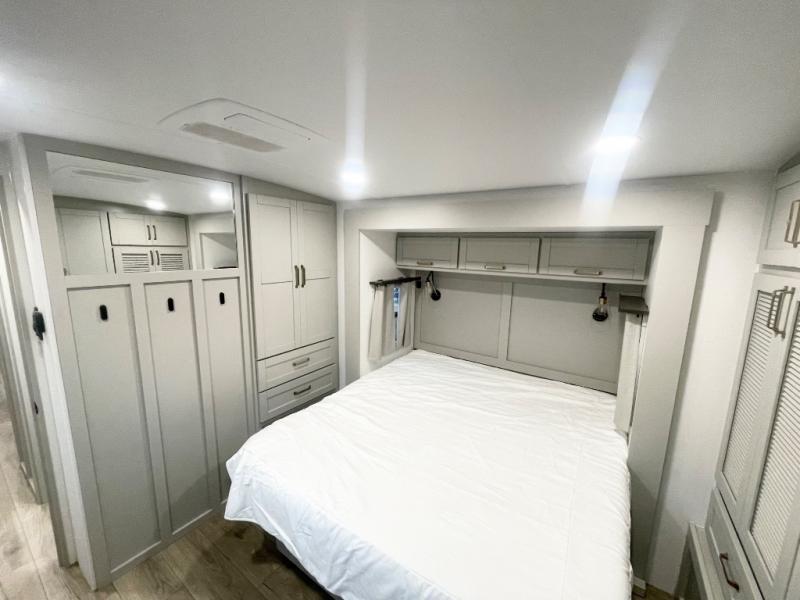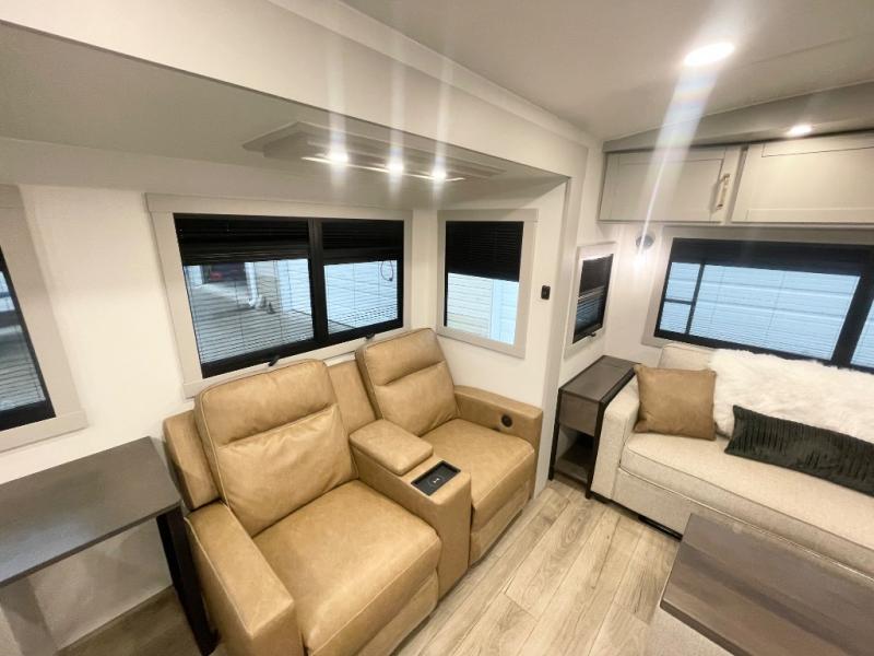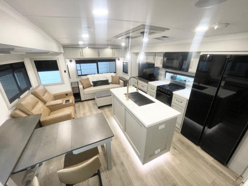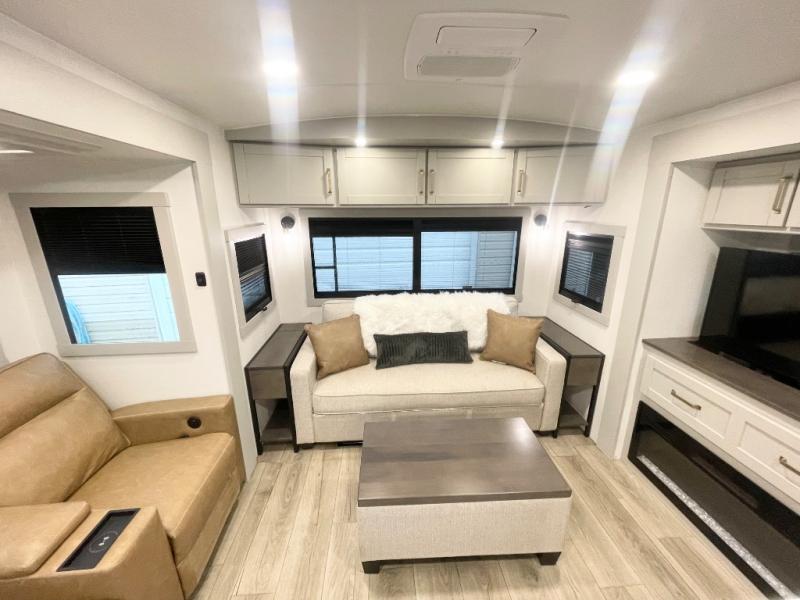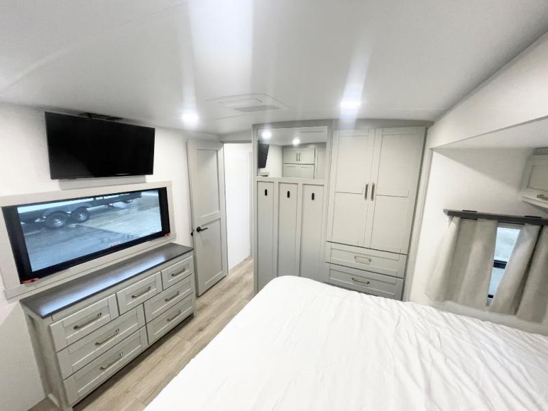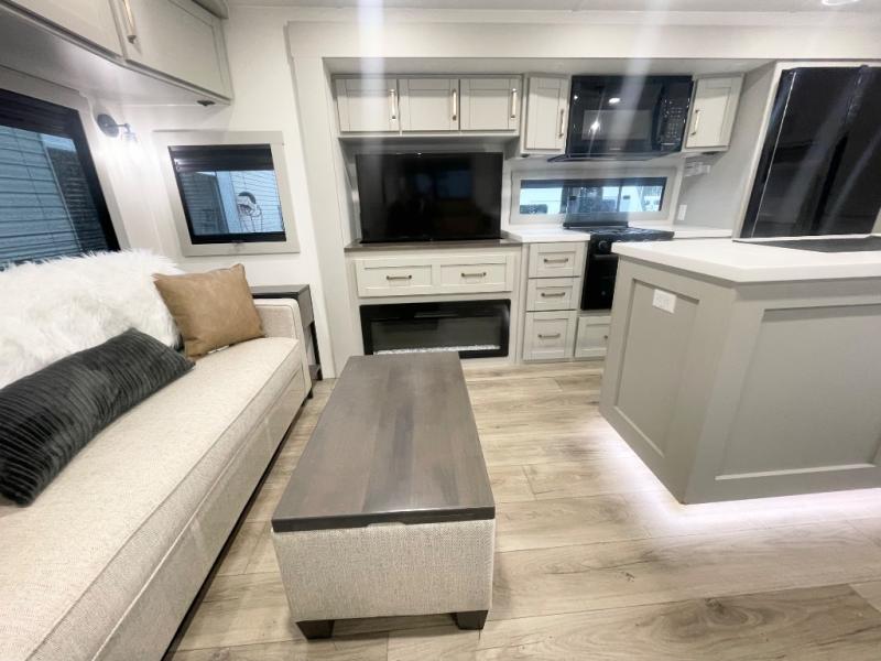 You will love all the space and features in this travel trailer! A luxurious rear living room offers plenty of room to spread out, with a 72" tri-fold sofa plus theater seats, all arranged with a perfect view of the 50" TV over the fireplace. A central kitchen area includes an island with hidden pet bowls. Find even more storage with the hutch plus pantry with adjustable shelves. The front bedroom comes with a queen bed, but if you'd like you can upgrade to a king for even more room. No matter which you choose, you will enjoy watching the 32" bedroom TV. The full-width wardrobe has room for all of your clothes and also includes prep for an optional washer and dryer. And the full bath includes a 30" x 42" one-piece fiberglass shower. Outside you'll enjoy two awnings, pass-through storage, and LED chassis lighting.
