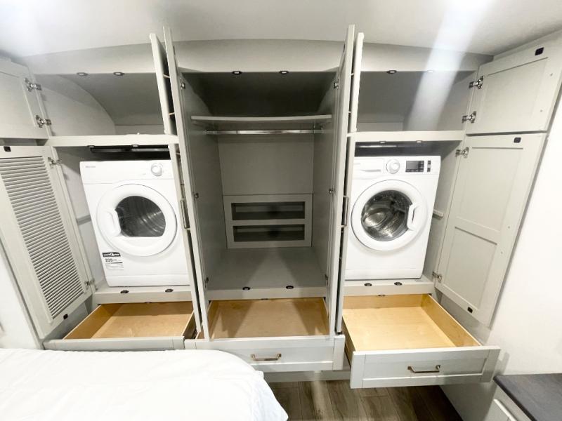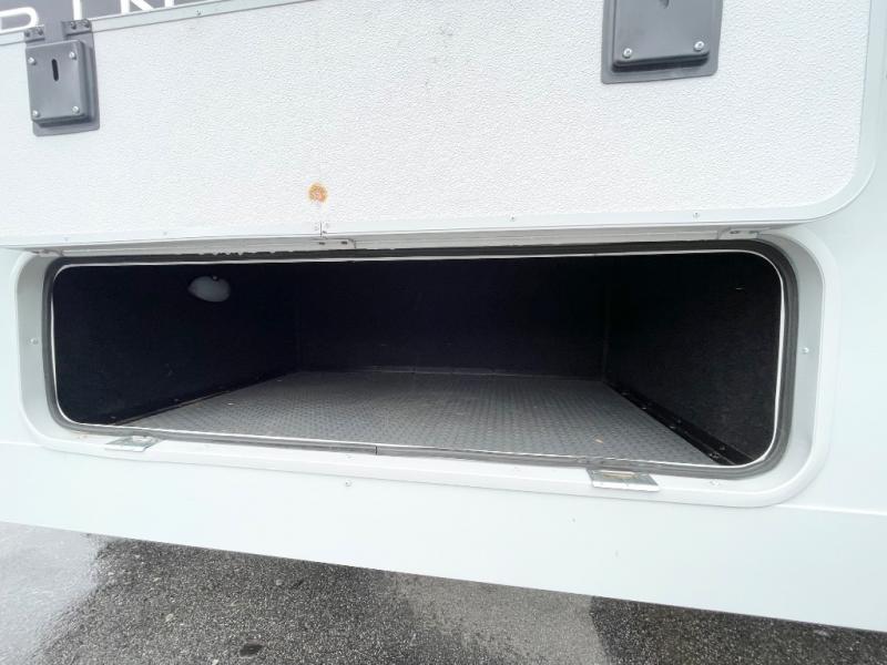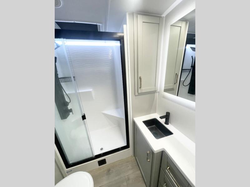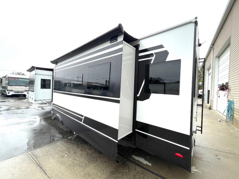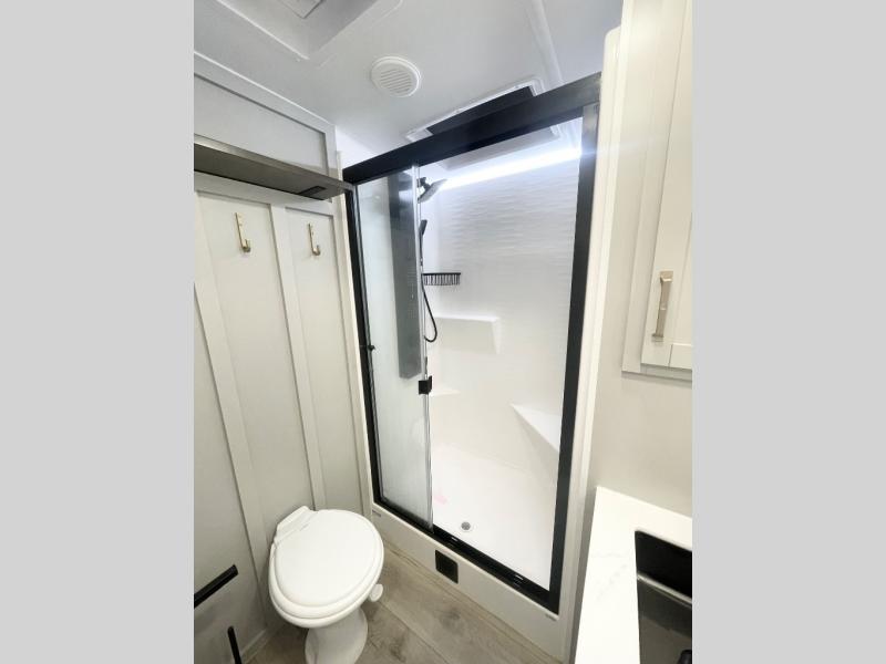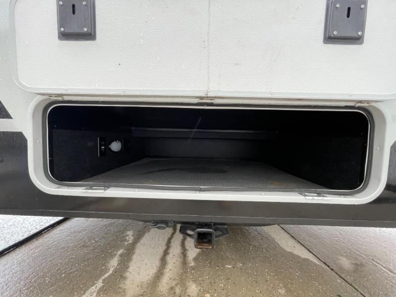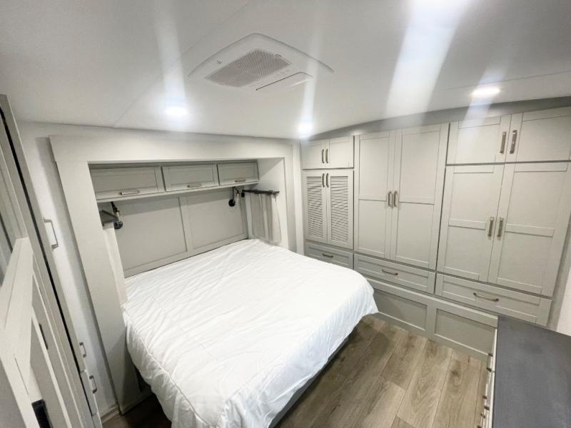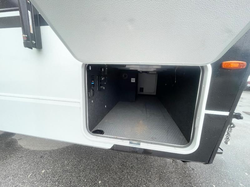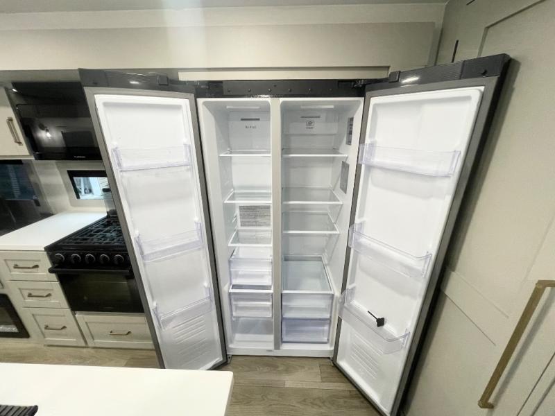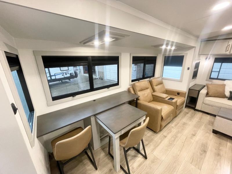 You will love all the space and features in this travel trailer! A luxurious rear living room offers plenty of room to spread out, with a 72" tri-fold sofa plus theater seats, all arranged with a perfect view of the 50" TV over the fireplace. A central kitchen area includes an island with hidden pet bowls. Find even more storage with the hutch plus pantry with adjustable shelves. The front bedroom comes with a queen bed, but if you'd like you can upgrade to a king for even more room. No matter which you choose, you will enjoy watching the 32" bedroom TV. The full-width wardrobe has room for all of your clothes and also includes prep for an optional washer and dryer. And the full bath includes a 30" x 42" one-piece fiberglass shower. Outside you'll enjoy two awnings, pass-through storage, and LED chassis lighting.
