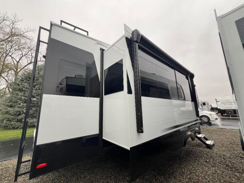 You're going to love every minute spent in this spacious fifth wheel that can sleep four. There is an inviting rear living area with a 72" tri-fold sofa and theater seating across from the telescoping entertainment center and fireplace. The chef of your group can whip up dinner on the three burner cooktop or in the 30" residential microwave, and there is a 16 cu. ft. refrigerator that even opens when with the slide out is in. You will also enjoy the kitchen island with a farmhouse sink and roller cover, dual trash bins with a Stow N' Go paper towel holder, plus convenient dog bowls for your furry friends. You can store all your paper goods and snacks in the 84" pantry with adjustable shelving, and there is a hutch for nice dishes plus shoe storage in this model as well. Head to the front master bedroom where you'll find a queen bed with a TV, a large slide out with a wardrobe and a chest of drawers, plus a spacious bath.