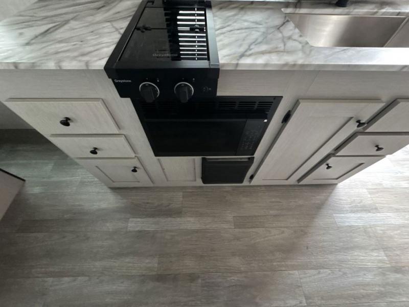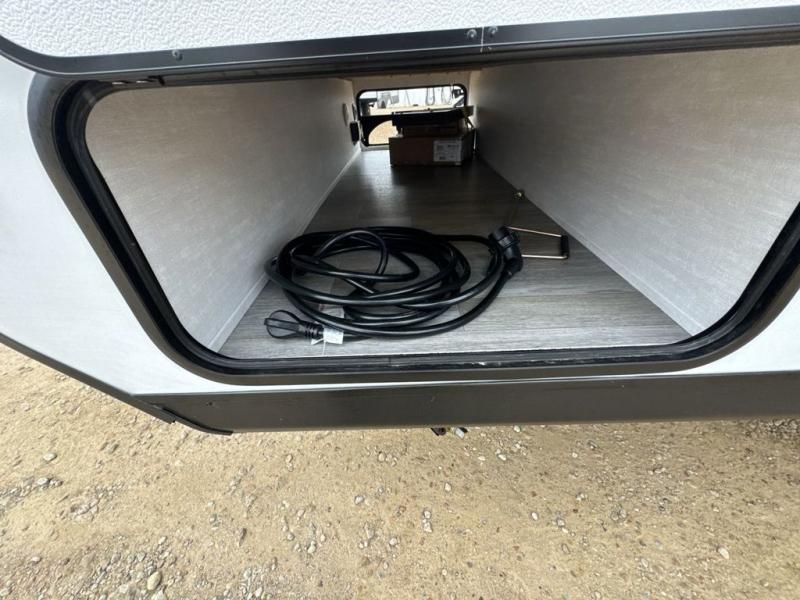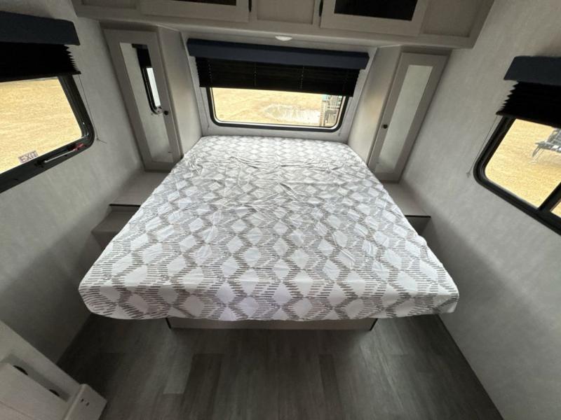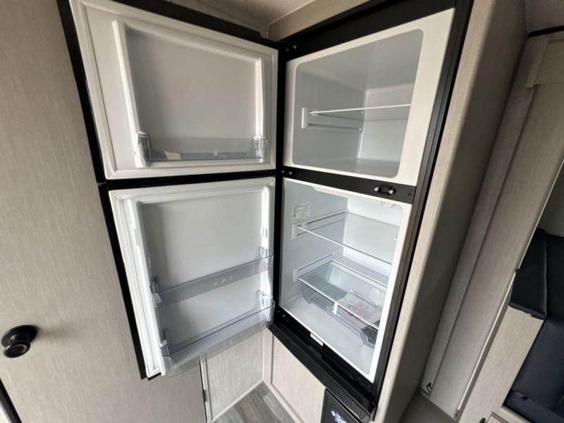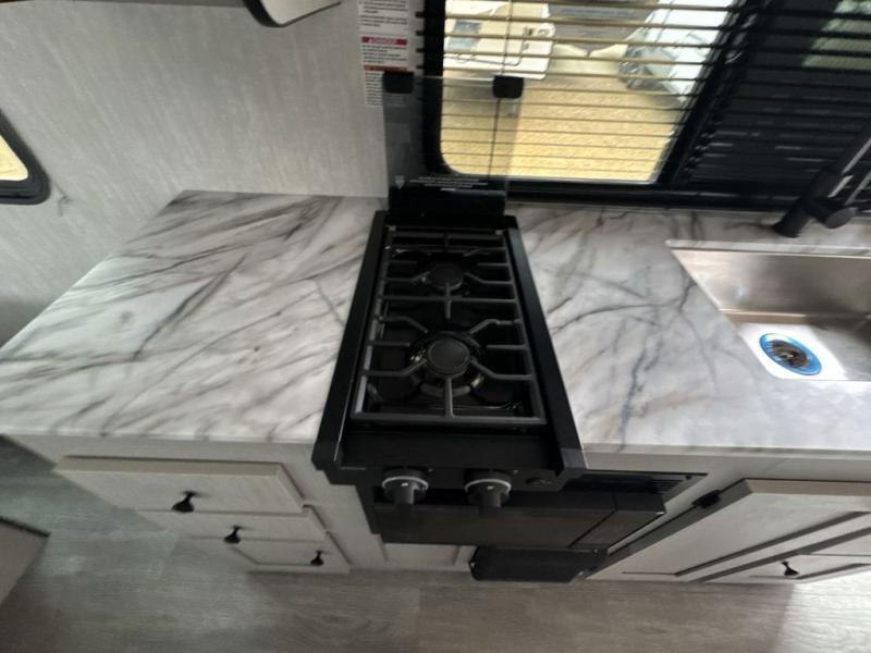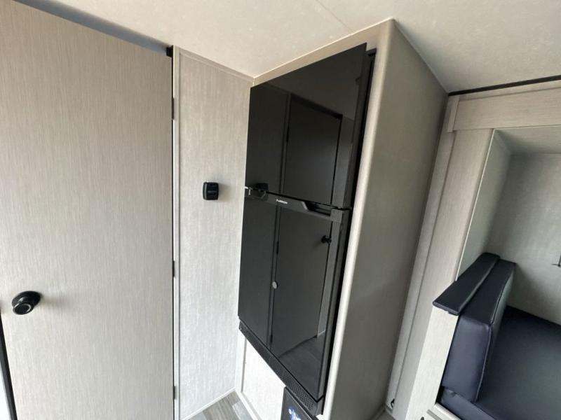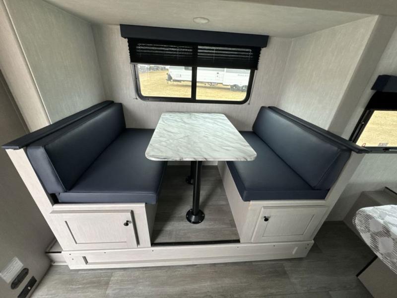 Whether you camp with friends, family or solo, this trailer gives you space for all with a spacious main living and kitchen area thanks to the booth dinette slide! The rear full bath offers a shower, sink, toilet and a wardrobe so you can get ready in privacy. A two burner cooktop and microwave underneath will let you make meals each day, and the 12V refrigerator will be perfect for perishables. The walk-around queen-size bed provides convenience when getting in and out of bed and there are two wardrobes and overhead cabinets to keep your belongings up and away. The power awning protects you from the elements when relaxing outside, and the exterior pass-through storage gives you a place to stow the outdoor equipment like camping chairs, tables, fishing poles and charcoal.