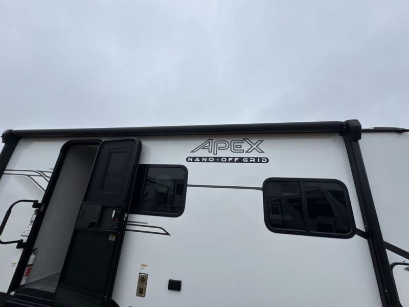 You will find comfort, convenience, and a sturdy construction with each of these Coachmen RV Apex Nano travel trailers! They are held together with an aluma-cage construction, an I-beam chassis, plus vacuum-bonded laminated dual Azdel fiberglass walls for double the protection against the elements. The 200-watt solar panel with a 30 amp control charger is included within the Off-Grid Package, along with two 20 lb. LP tanks, a high velocity power roof vent, plus 12V outlets to keep you powered up. More exterior feature include a hot/cold shower, four stabilizer jacks, a power awning with LED lighting, and magnetic baggage door catches to easily pack and unload your gear. You will love the interior of your Apex Nano with Congoleum residential flooring, one-piece seamless edge countertops, matte black hardware in the galley, and a hand-crafted wood medicine cabinet in the bath.