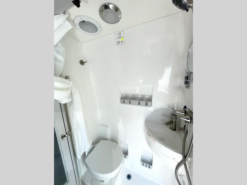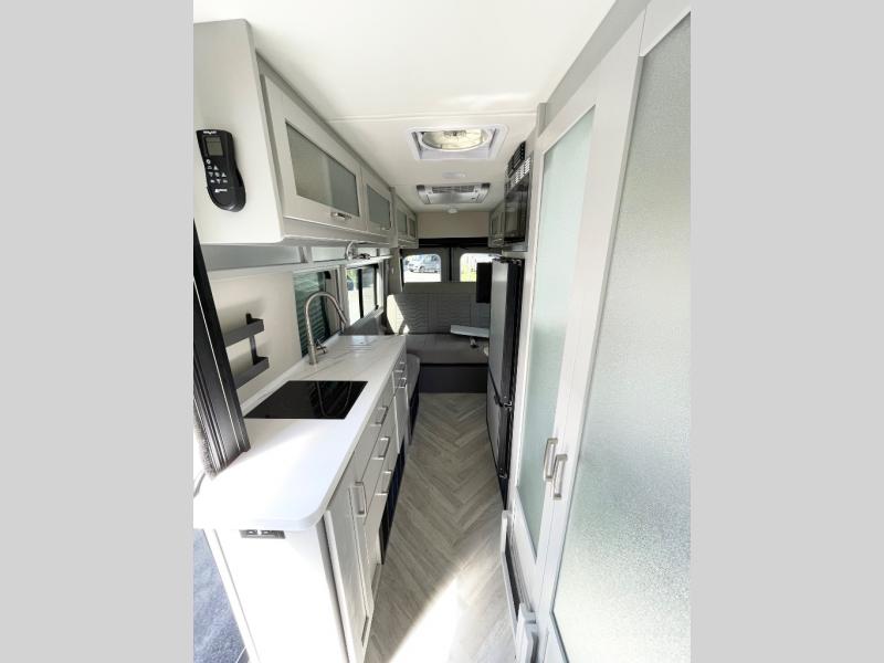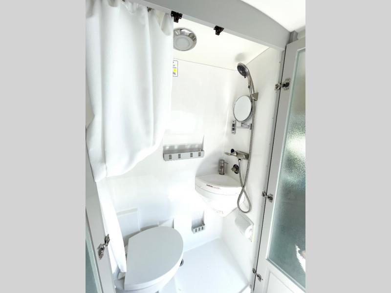 This all-wheel drive coach is perfect for trips near and far. Once you park, you can swivel the captain's seats around to enjoy lunch at the removeable table, and you can freshen up in the convenient wet bath before heading out to stretch your legs. There is an induction cooktop, a round sink, plus a Nova Kool compressor refrigerator for your perishables. The two jump seats and rear power sofa will convert to a comfortable bed at night, and the lagun table in between will allow you to play a game of cards before bed. And don't worry about storage space since this model includes overhead compartments and a wardrobe to keep your clothes wrinkle-free!