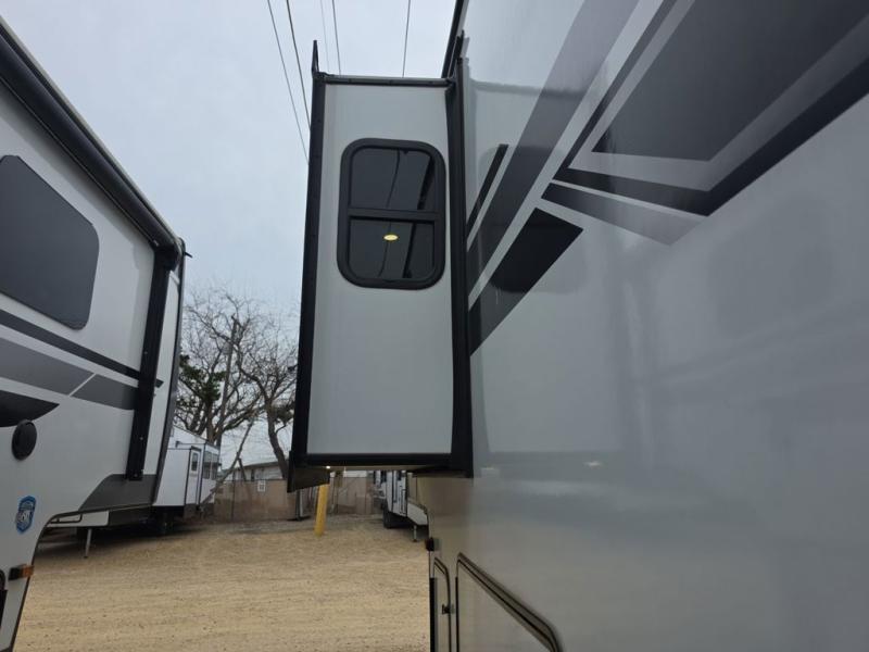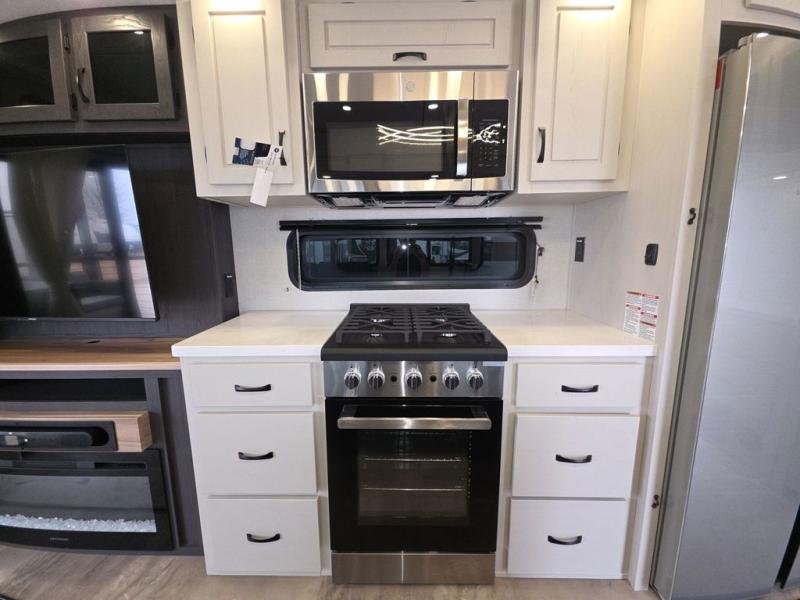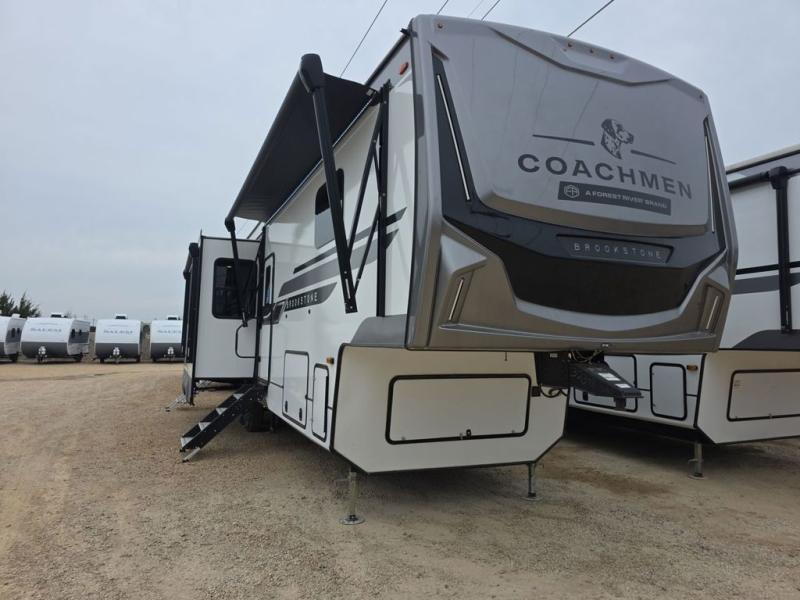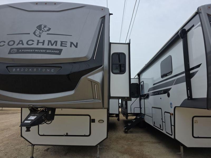 The Brookstone fifth wheels by Coachmen are coming to you with wide-body comfort, home-like amenities, and unique designs for a truly luxurious RV. The Weather Shield+ consists of a 6X double Azdel aluminum cage sidewall system, a Radiant Pro weather barrier system, and more that will help you extend your camping season or go full-time. Head inside to find solid surface countertops in the kitchen, an 4K Smart LED TV in the living room, slow rise roller night shades, and the list of comforts goes on! The Brookstone also includes 6-point electric auto-leveling, four Solid Step entry steps, an electric awning with LED lights, and many more exterior conveniences!