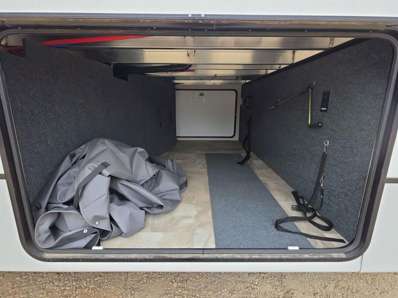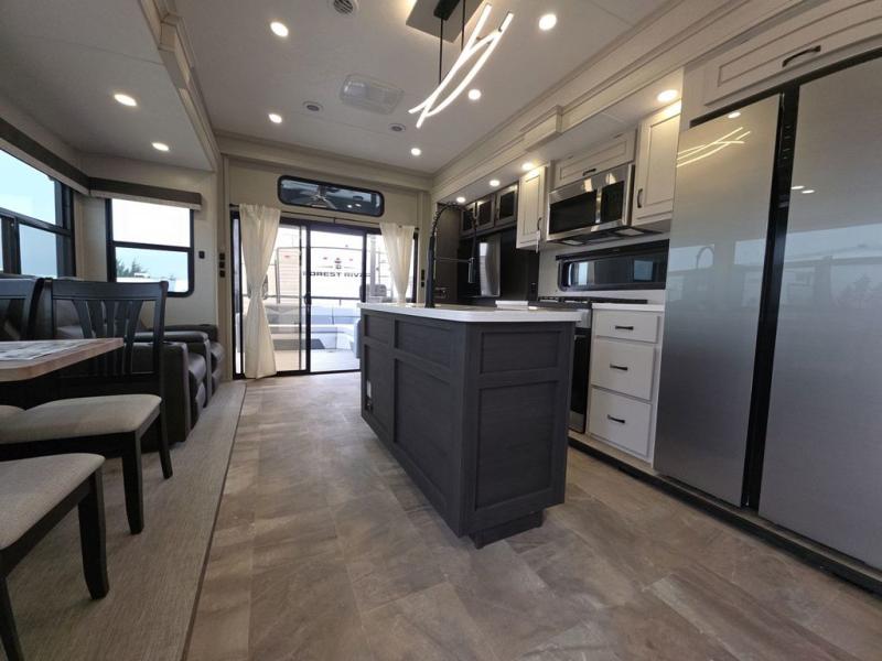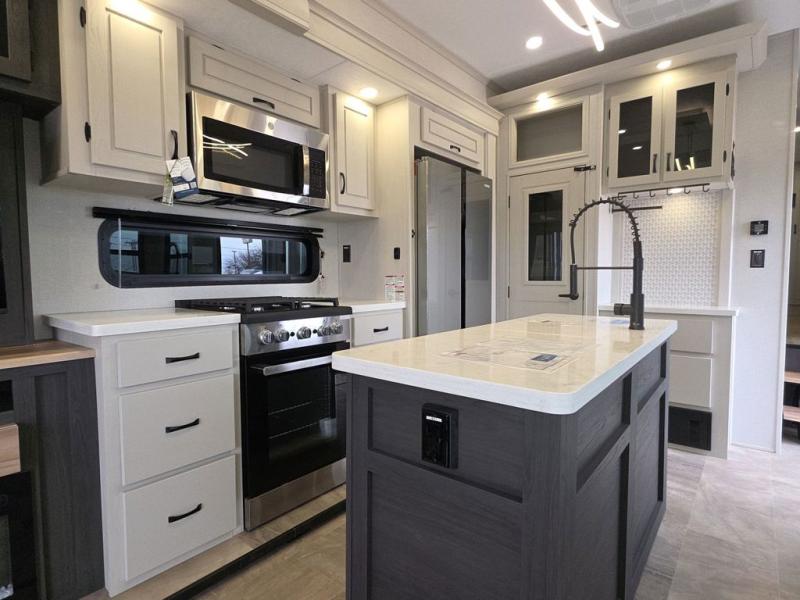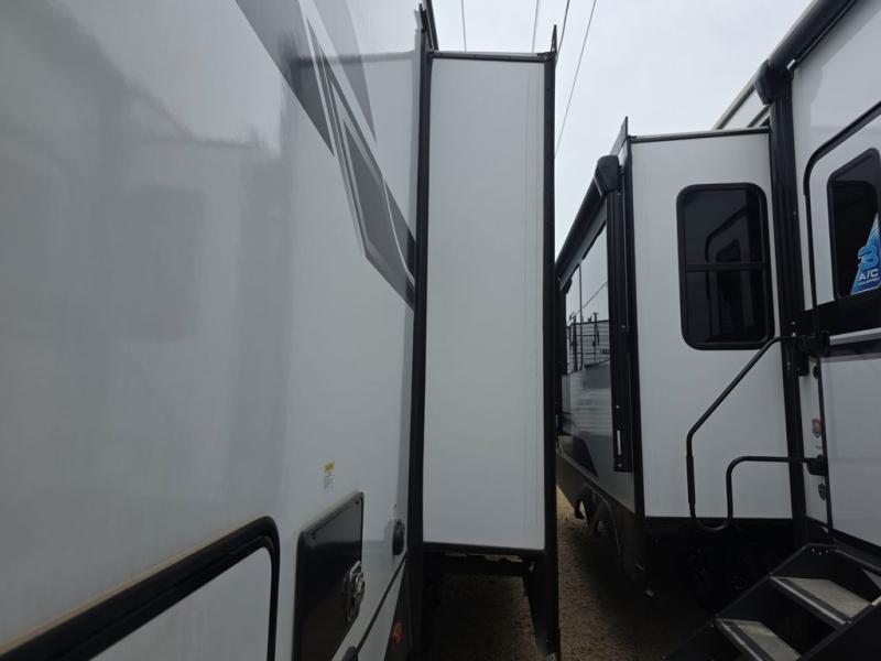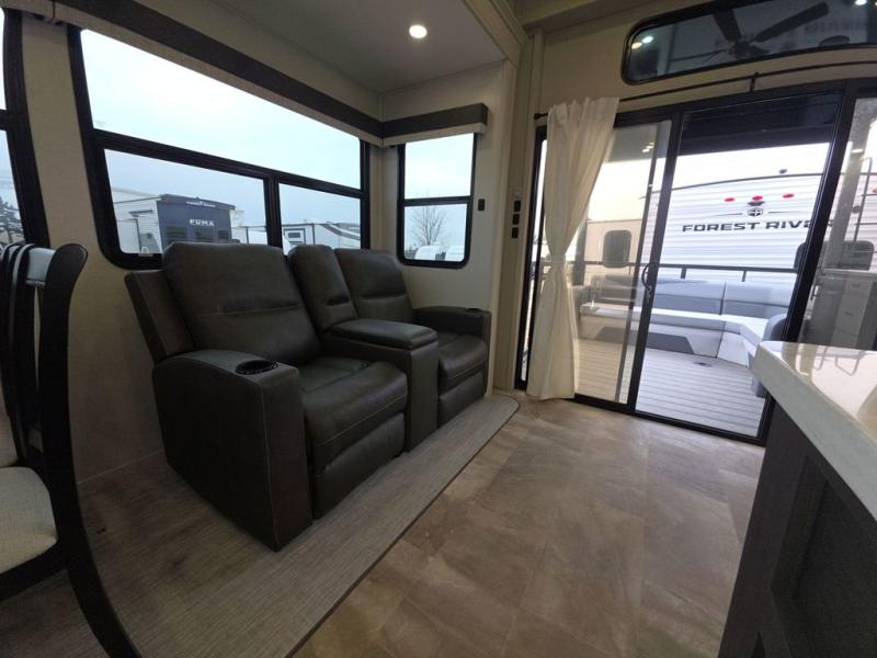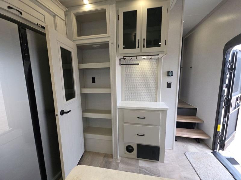 Step outside and enjoy the fresh air on our covered patio, complete with a refrigerator and optional L-shaped sofa, which is the perfect place to relax and unwind after a long day of adventure. Inside, the kitchen/living room area will make you feel an at-home experience, featuring overhead cabinets, an entertainment center, theater seating, a free-spanning table, a kitchen island, a microwave, a refrigerator, and a pantry. Perfect for cooking up a storm, entertaining friends and family, or simply relaxing and enjoying the comforts of home. The full bathroom is a spacious oasis, complete with a shower with a seat, a linen closet, and more. Plus, with a front bedroom featuring a king bed, dresser, washer and dryer prep, and a large wardrobe, you'll have the perfect place to rest and recharge after a long day of adventure. With two entry/exit doors and a massive 20’ awning, you'll have easy access to the RV and plenty of shade and protection from the weather.