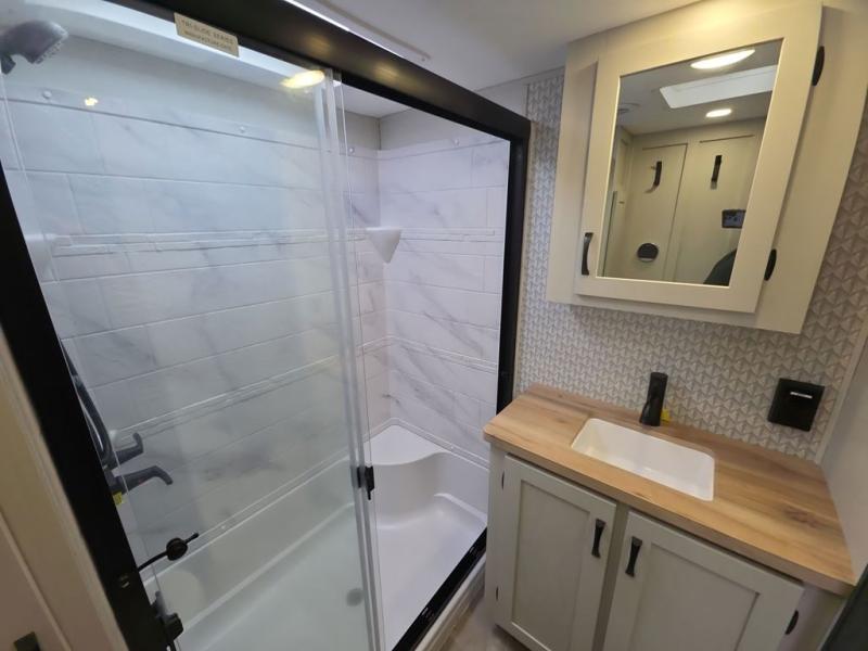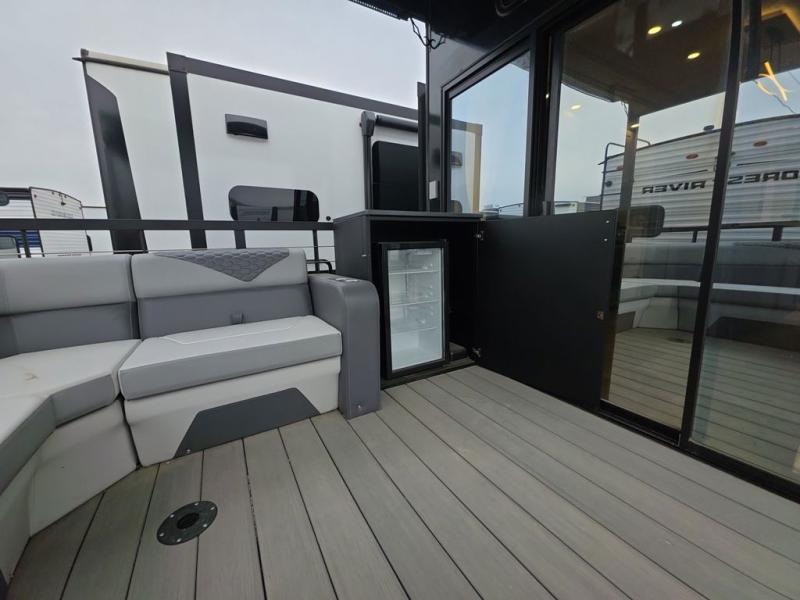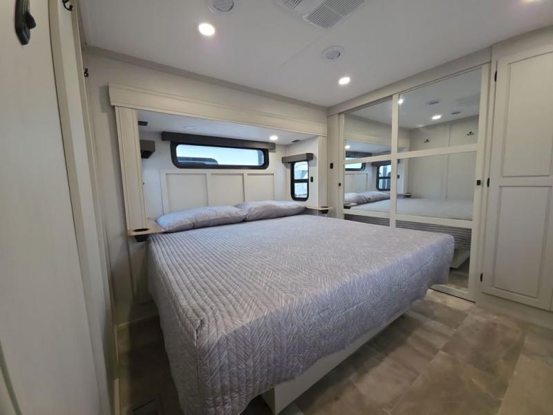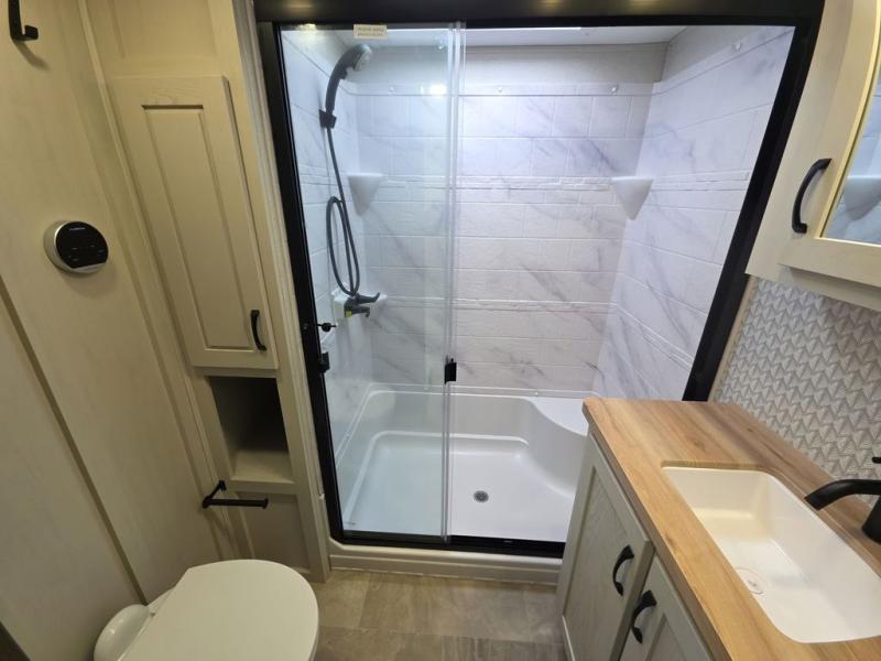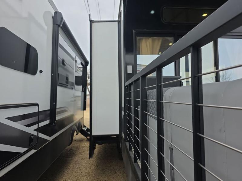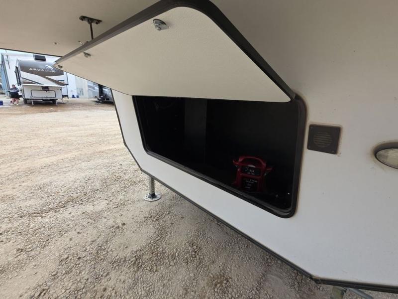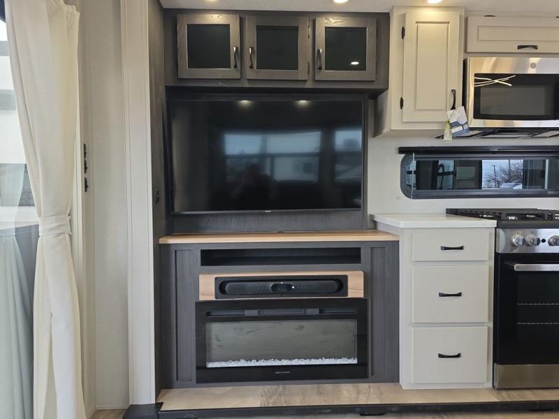 Step outside and enjoy the fresh air on our covered patio, complete with a refrigerator and optional L-shaped sofa, which is the perfect place to relax and unwind after a long day of adventure. Inside, the kitchen/living room area will make you feel an at-home experience, featuring overhead cabinets, an entertainment center, theater seating, a free-spanning table, a kitchen island, a microwave, a refrigerator, and a pantry. Perfect for cooking up a storm, entertaining friends and family, or simply relaxing and enjoying the comforts of home. The full bathroom is a spacious oasis, complete with a shower with a seat, a linen closet, and more. Plus, with a front bedroom featuring a king bed, dresser, washer and dryer prep, and a large wardrobe, you'll have the perfect place to rest and recharge after a long day of adventure. With two entry/exit doors and a massive 20’ awning, you'll have easy access to the RV and plenty of shade and protection from the weather.
