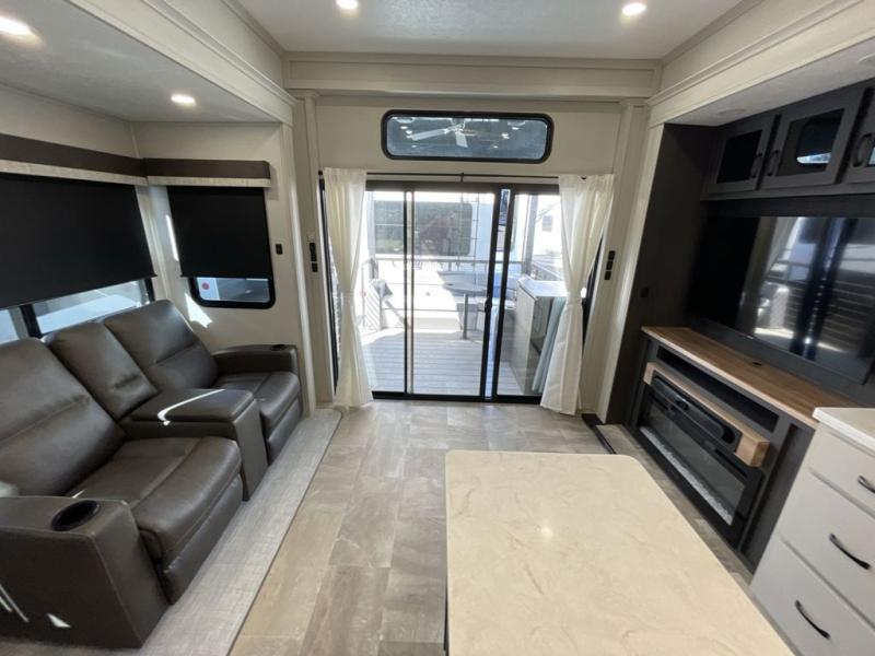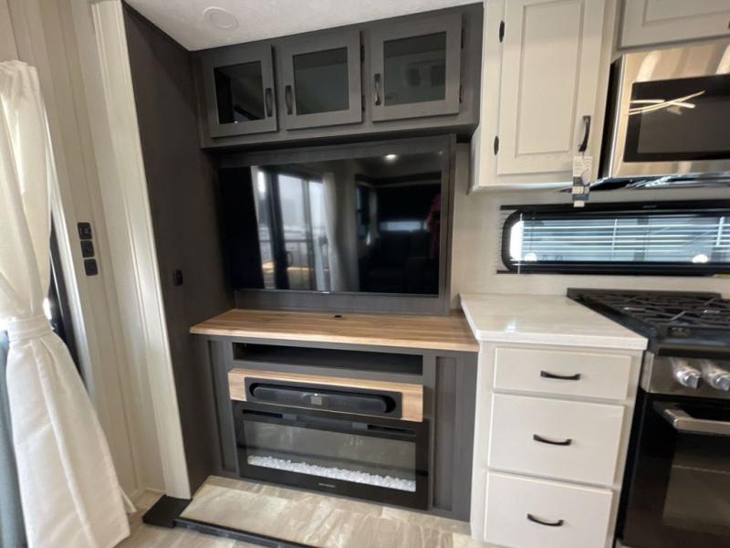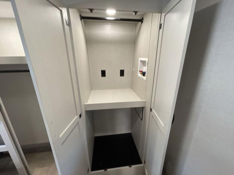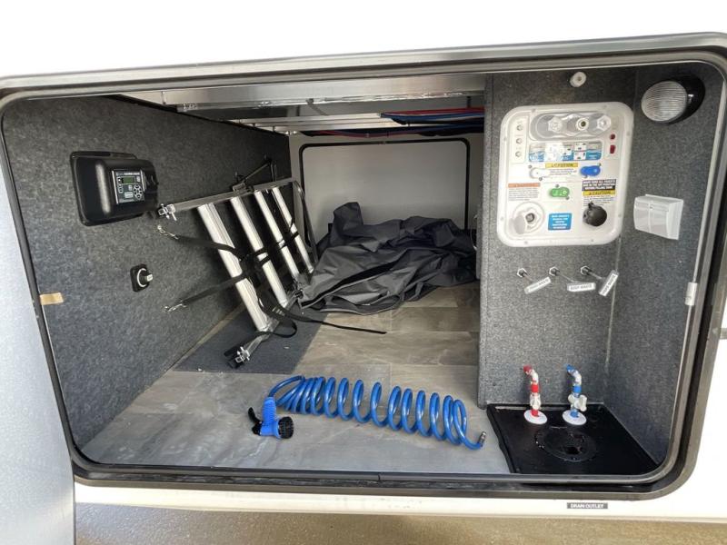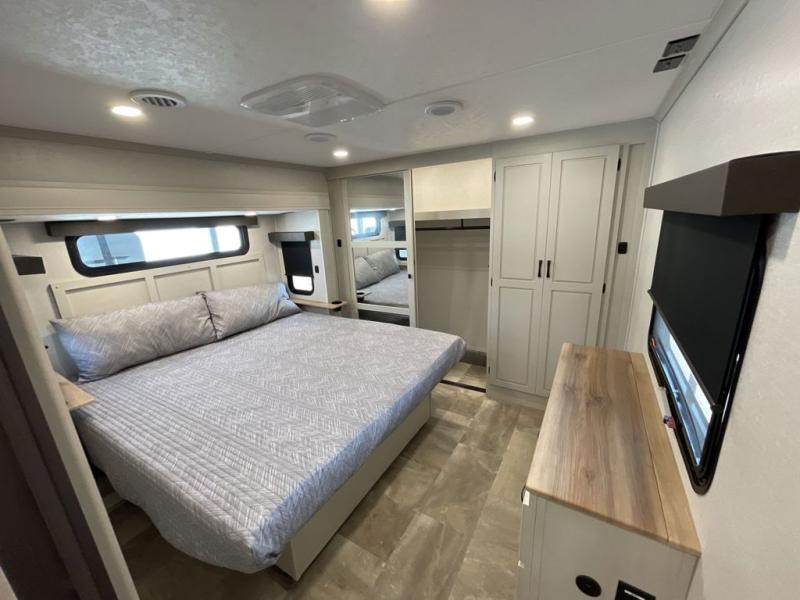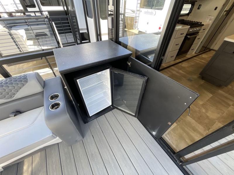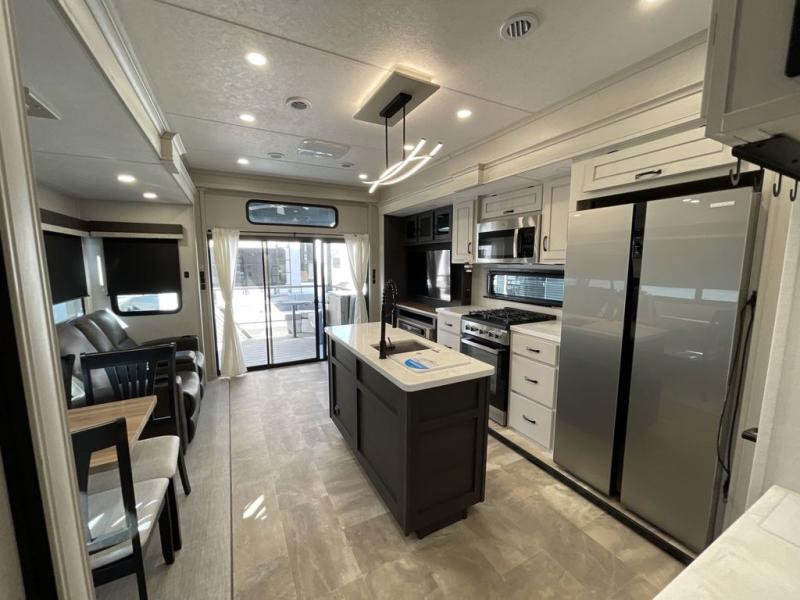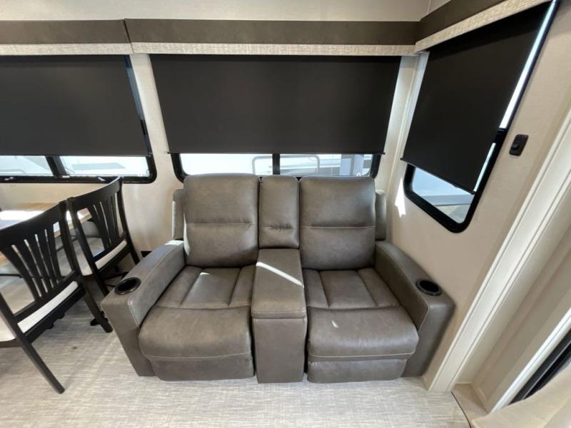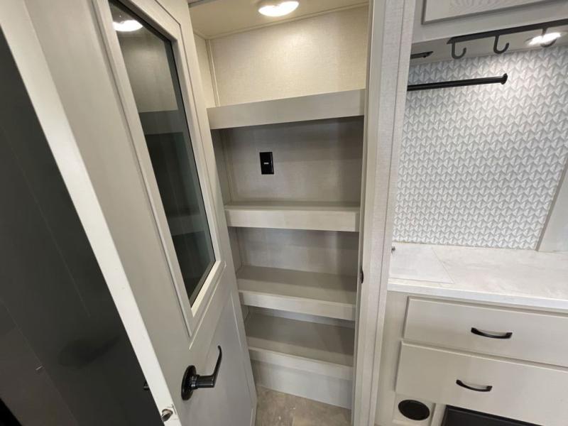 Step outside and enjoy the fresh air on our covered patio, complete with a refrigerator and optional L-shaped sofa, which is the perfect place to relax and unwind after a long day of adventure. Inside, the kitchen/living room area will make you feel an at-home experience, featuring overhead cabinets, an entertainment center, theater seating, a free-spanning table, a kitchen island, a microwave, a refrigerator, and a pantry. Perfect for cooking up a storm, entertaining friends and family, or simply relaxing and enjoying the comforts of home. The full bathroom is a spacious oasis, complete with a shower with a seat, a linen closet, and more. Plus, with a front bedroom featuring a king bed, dresser, washer and dryer prep, and a large wardrobe, you'll have the perfect place to rest and recharge after a long day of adventure. With two entry/exit doors and a massive 20’ awning, you'll have easy access to the RV and plenty of shade and protection from the weather.