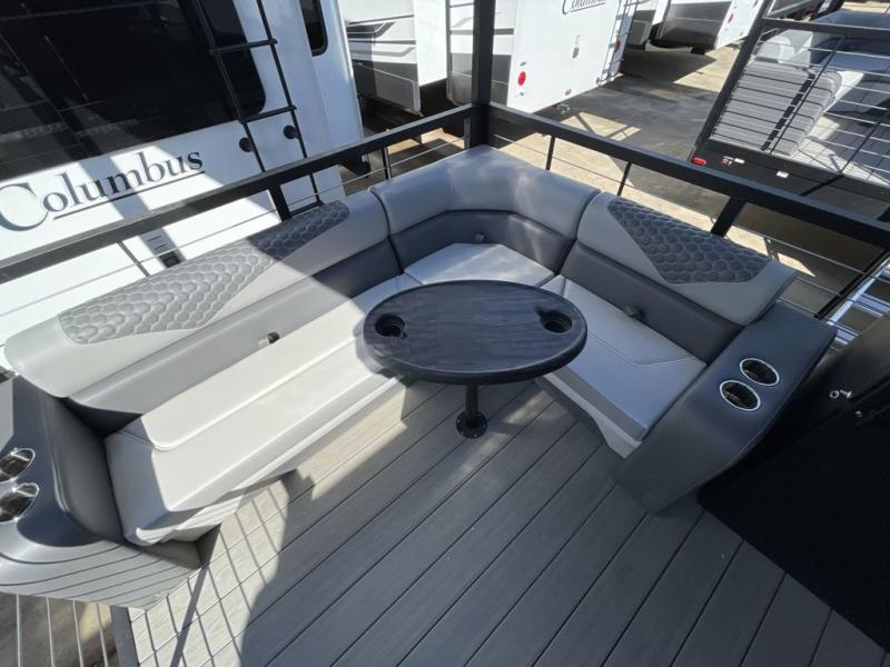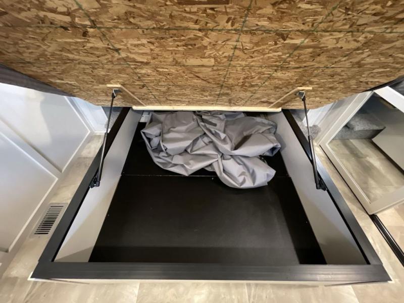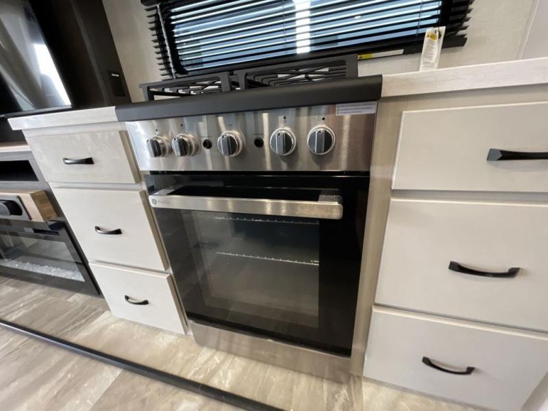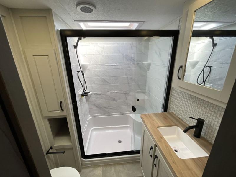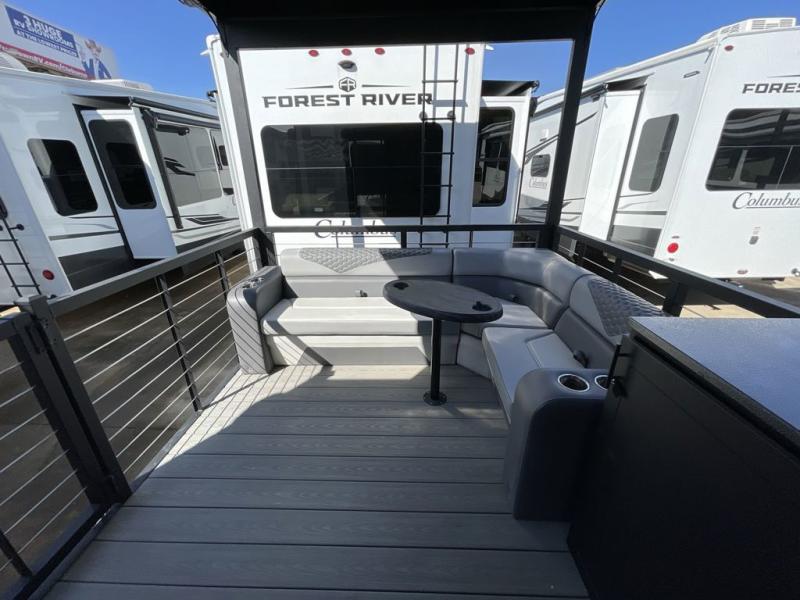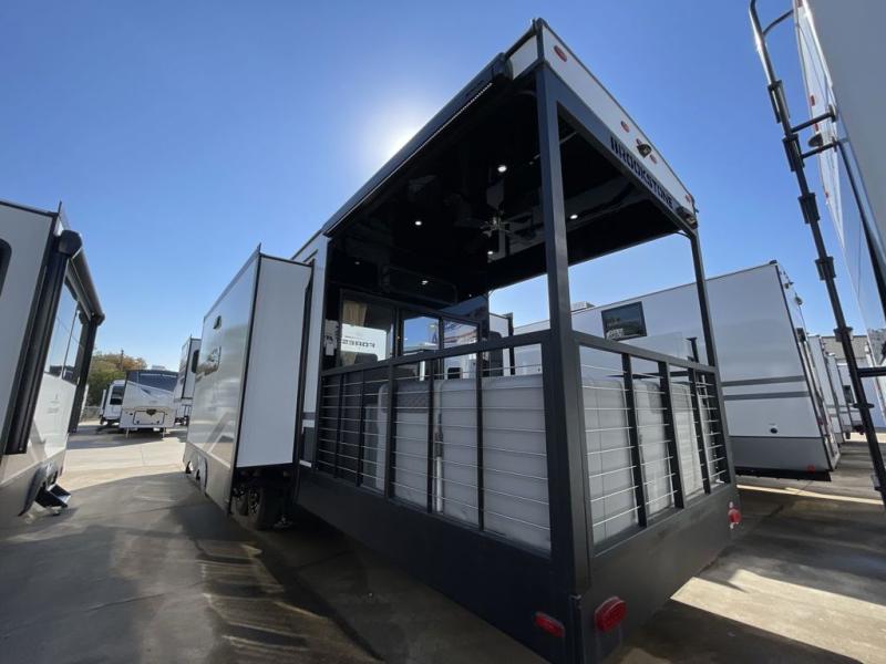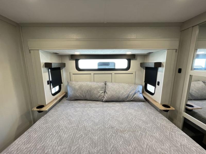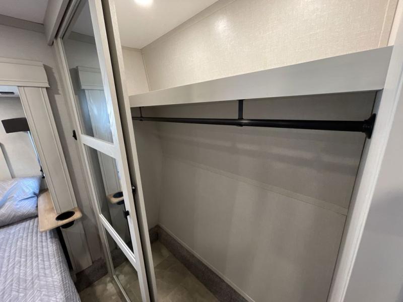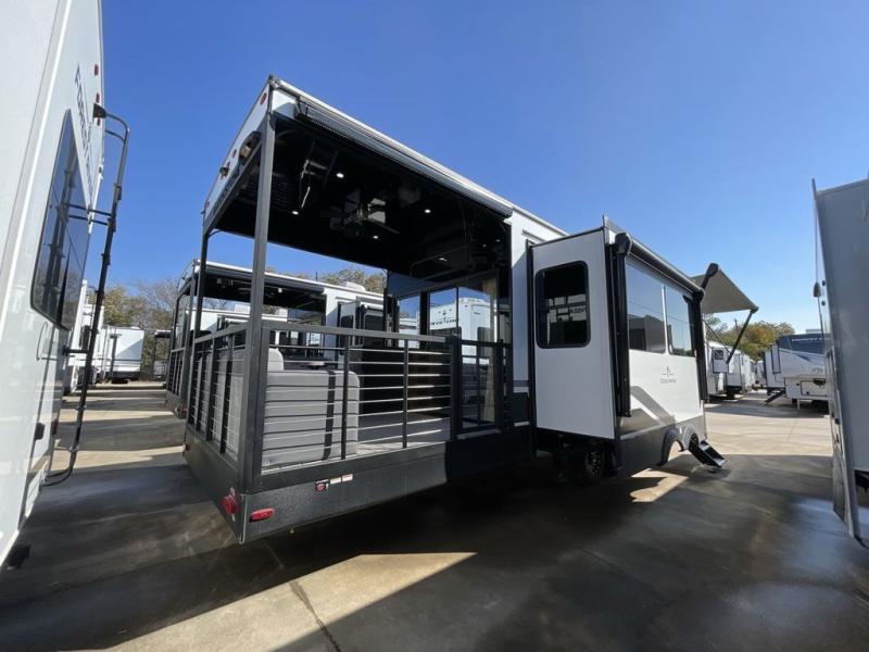 Step outside and enjoy the fresh air on our covered patio, complete with a refrigerator and optional L-shaped sofa, which is the perfect place to relax and unwind after a long day of adventure. Inside, the kitchen/living room area will make you feel an at-home experience, featuring overhead cabinets, an entertainment center, theater seating, a free-spanning table, a kitchen island, a microwave, a refrigerator, and a pantry. Perfect for cooking up a storm, entertaining friends and family, or simply relaxing and enjoying the comforts of home. The full bathroom is a spacious oasis, complete with a shower with a seat, a linen closet, and more. Plus, with a front bedroom featuring a king bed, dresser, washer and dryer prep, and a large wardrobe, you'll have the perfect place to rest and recharge after a long day of adventure. With two entry/exit doors and a massive 20’ awning, you'll have easy access to the RV and plenty of shade and protection from the weather.